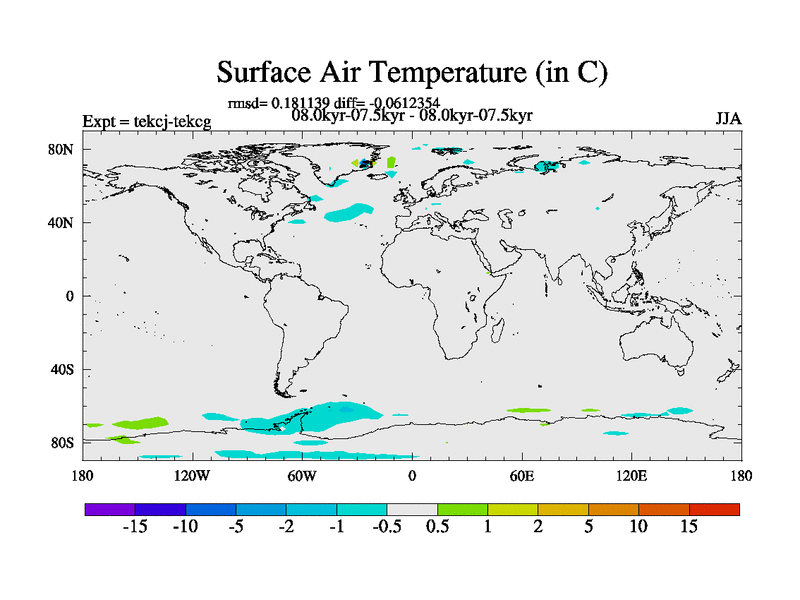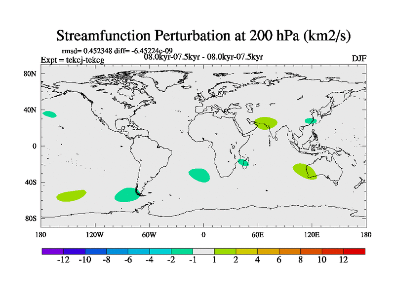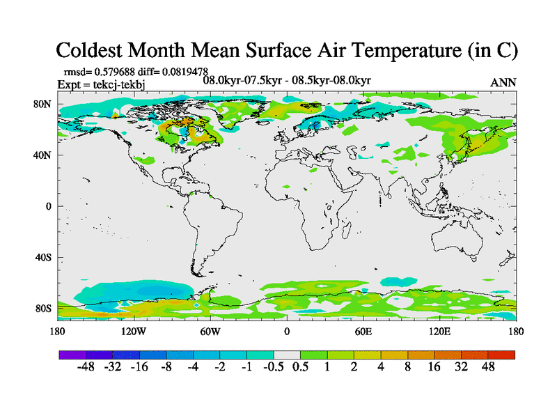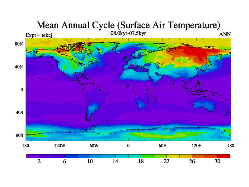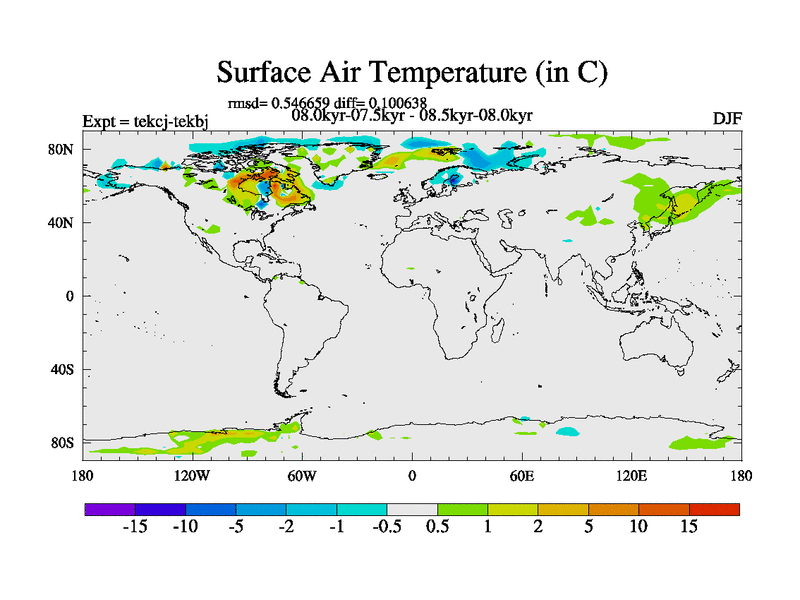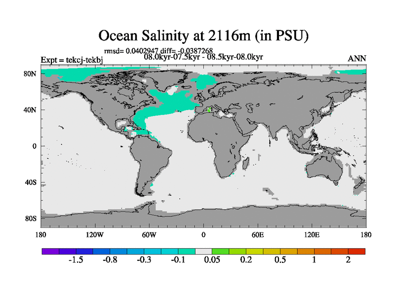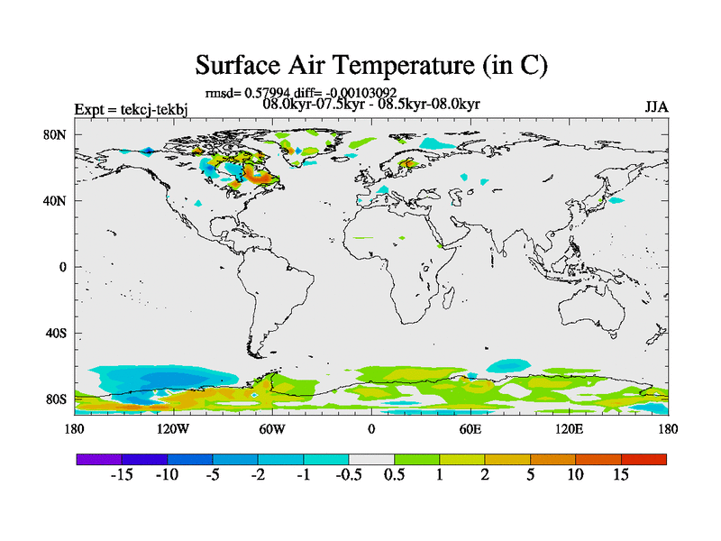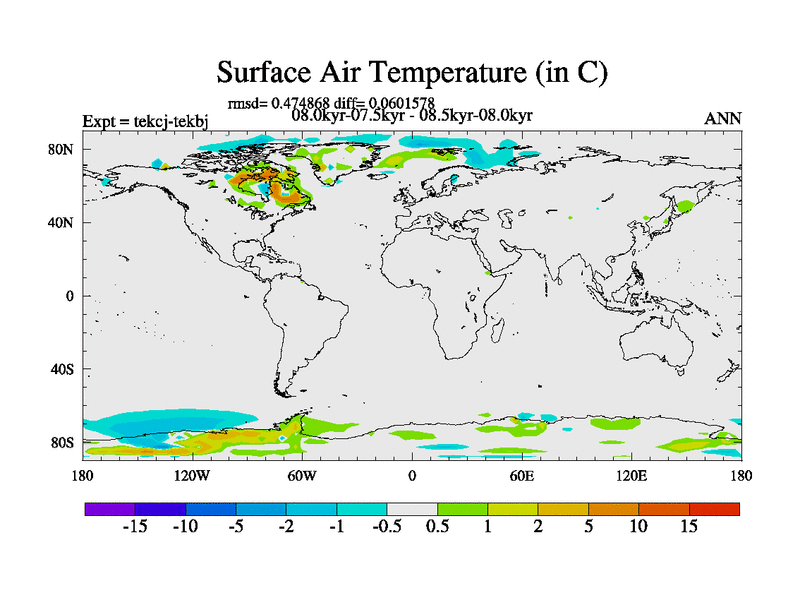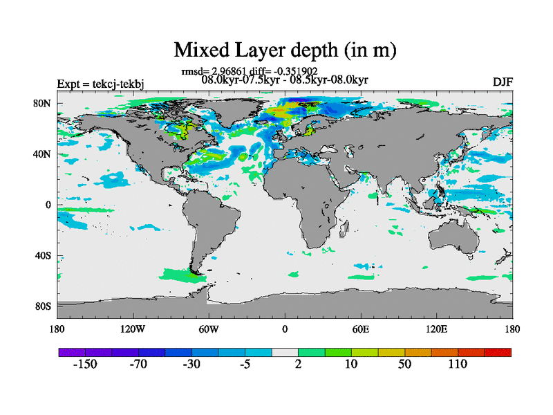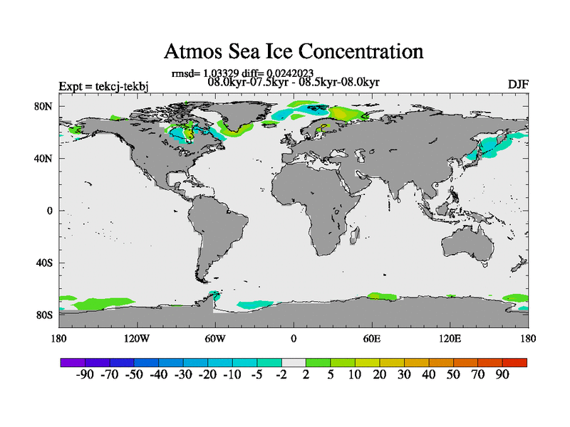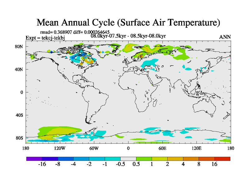 This is part of our deglaciation simulations. All forcings included except melt water fluxes. This series originally started from the tdphm spinup. Revised runoff maps, Russian rivers to Arctic. This vresion uses real meltwater fluxes. |