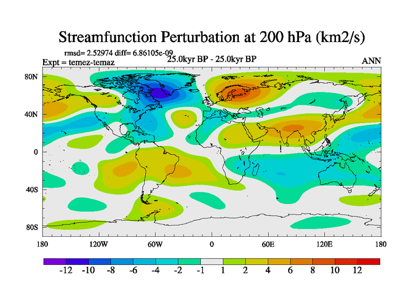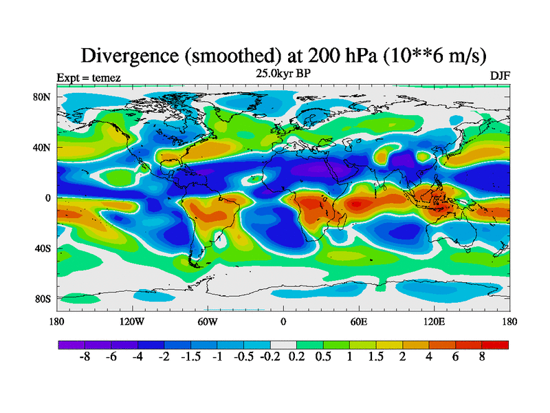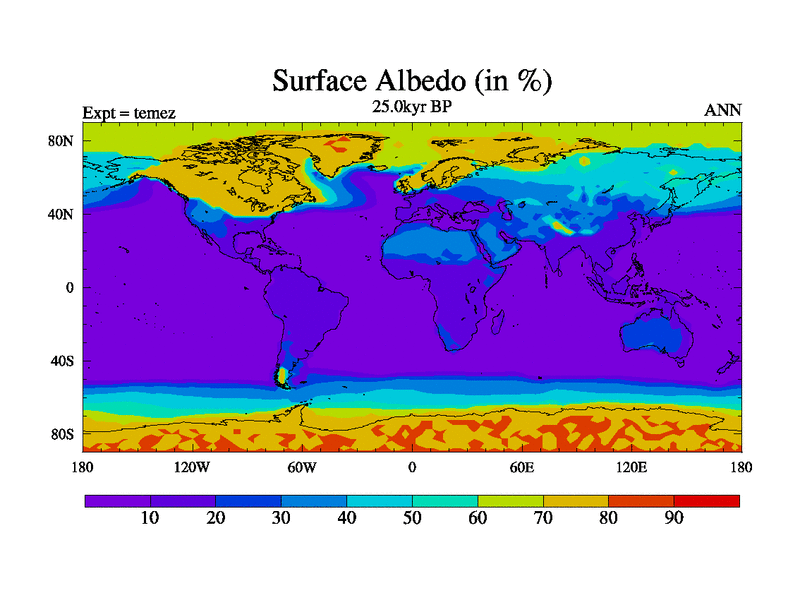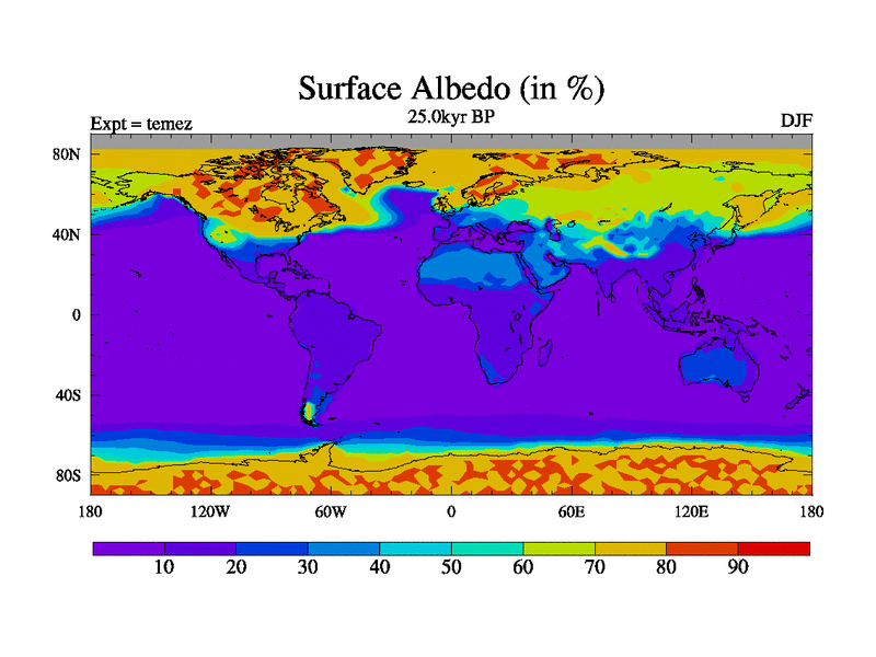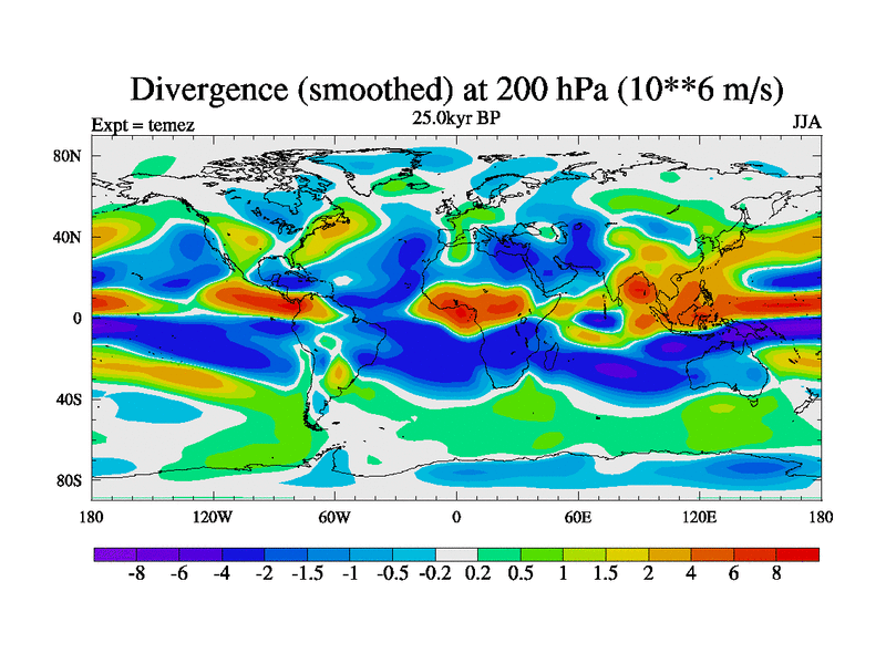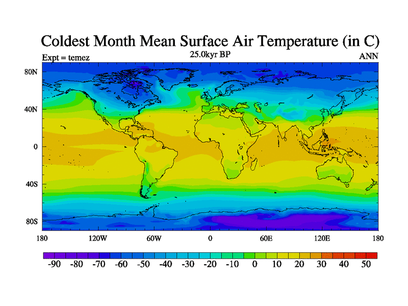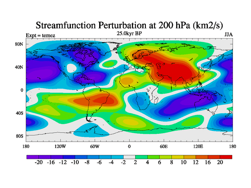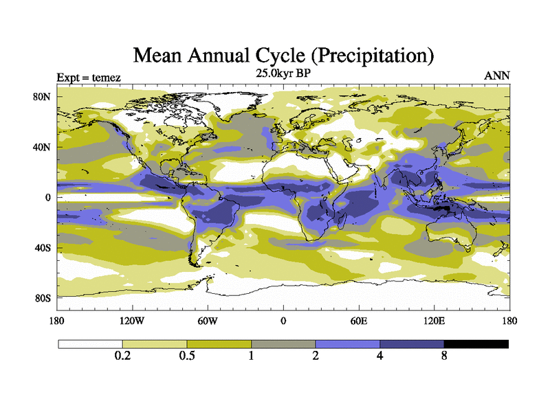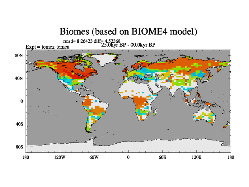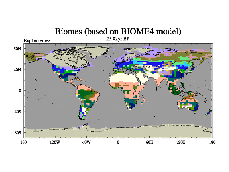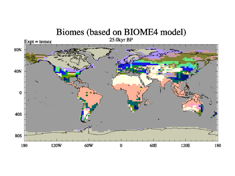 This is the 25.0 kyr BP simulation for a new set of deglaciation BBC runs using GLAC-1D and TRIFFID. Dynamic mode. No meltwater. Russian rivers routed to Med but only during height of glacial.