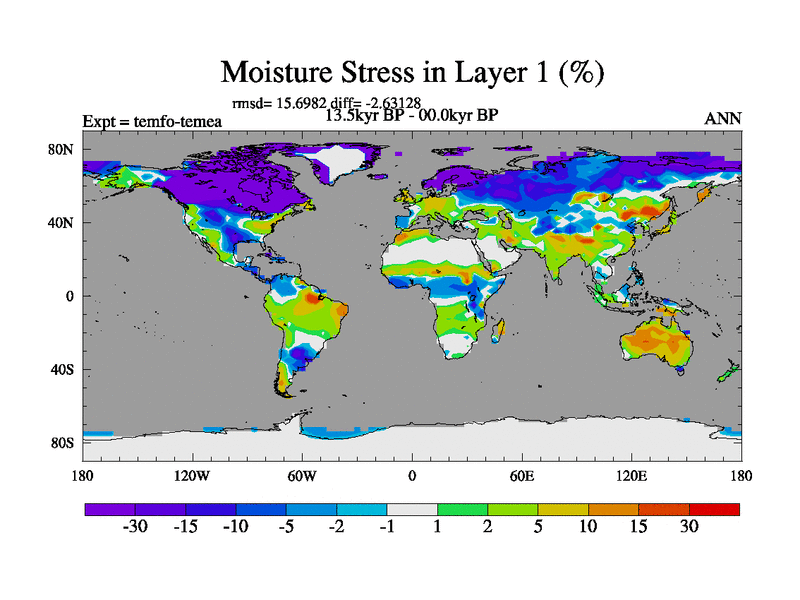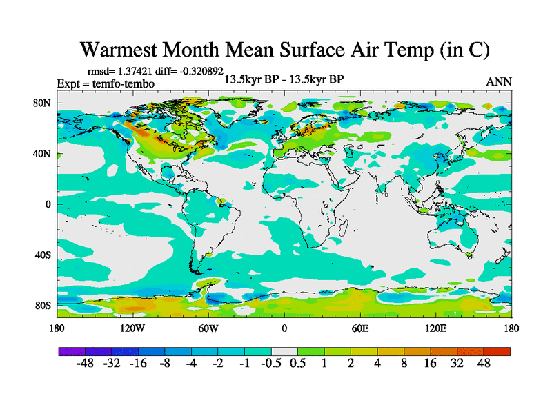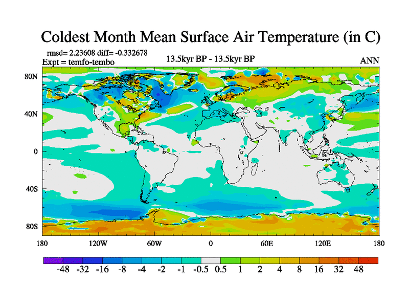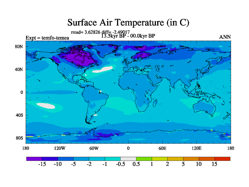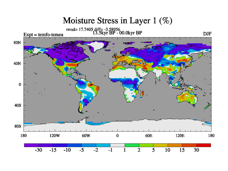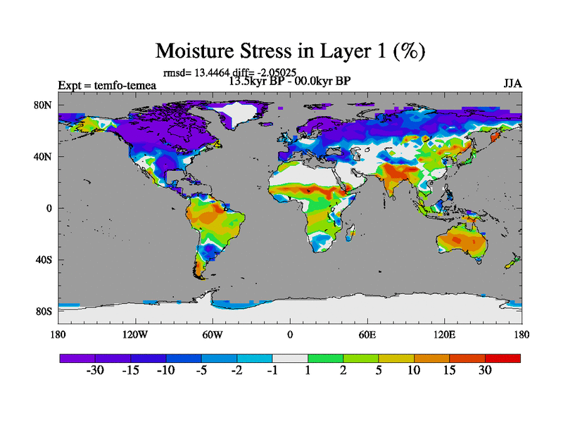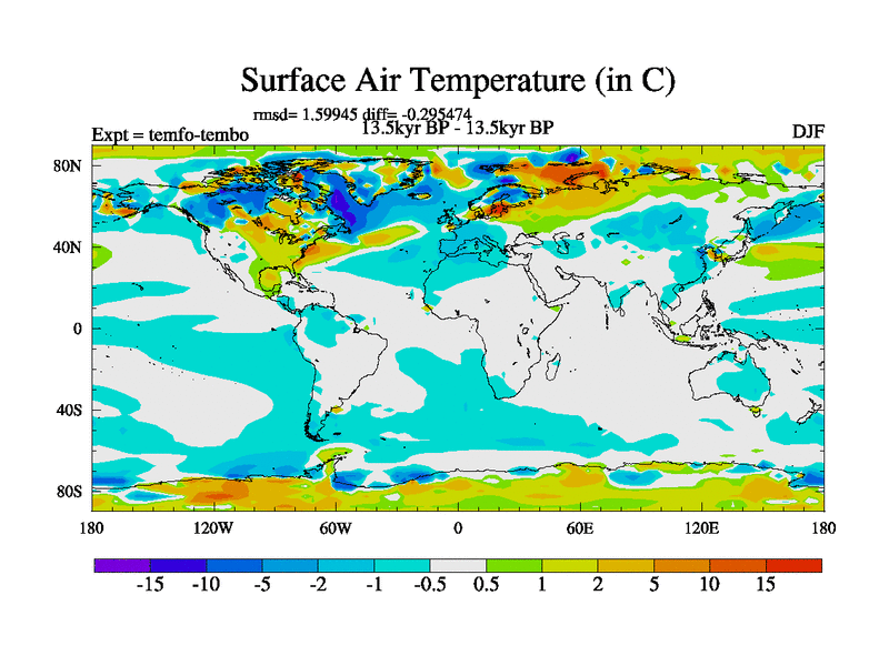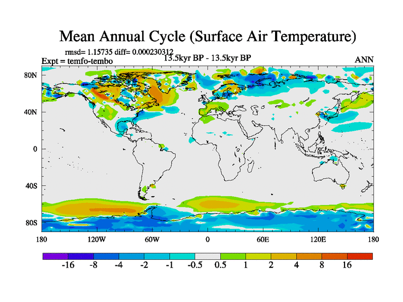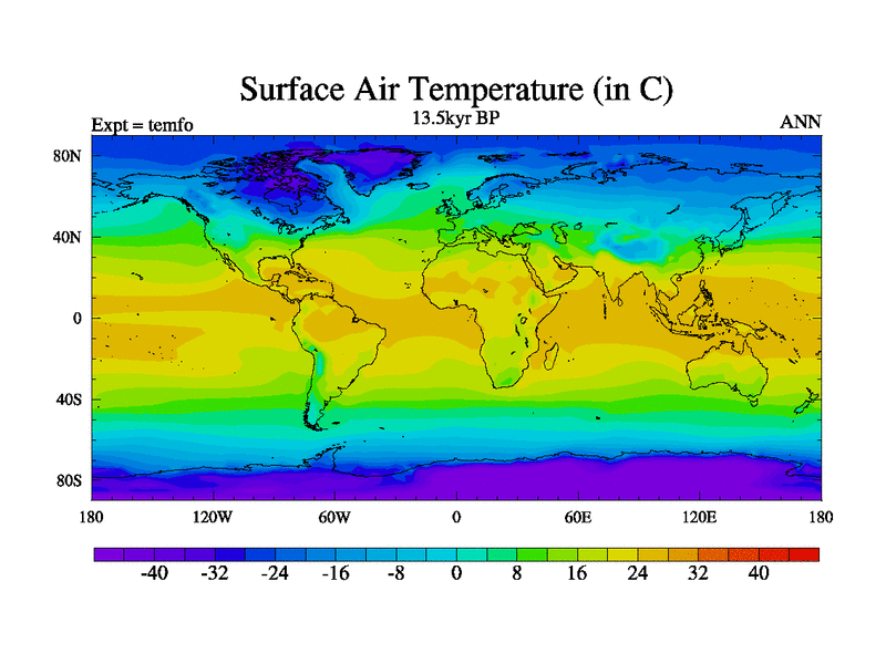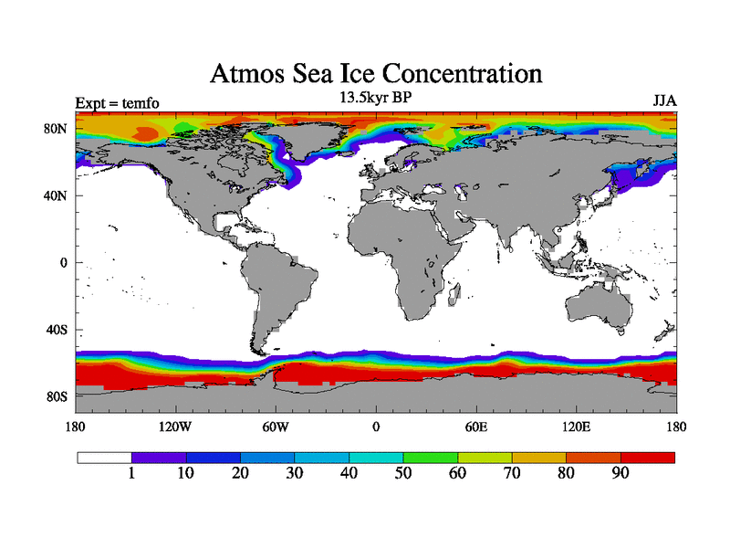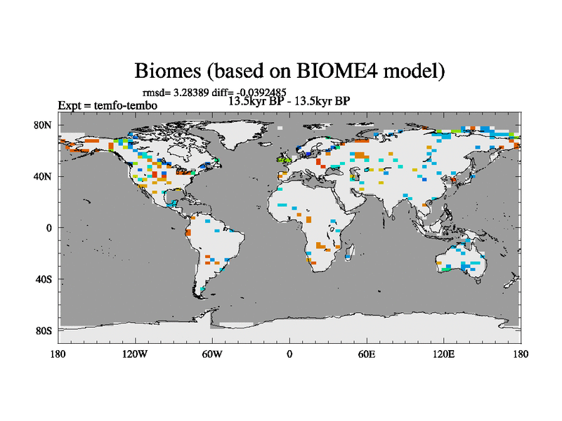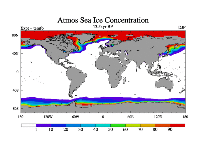 This is the 13.5 kyr BP simulation for a new set of deglaciation BBC runs using GLAC-1D and TRIFFID. Dynamic mode. No meltwater. Russian rivers routed to Med but only during height of glacial.