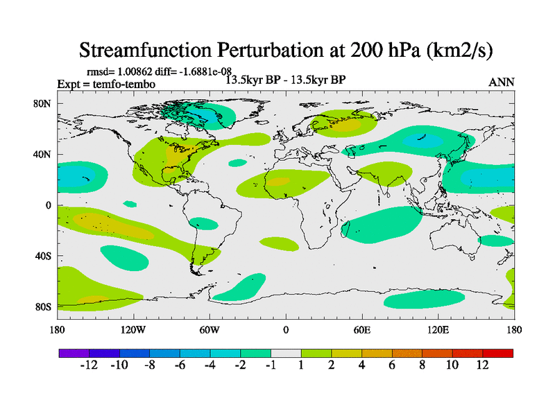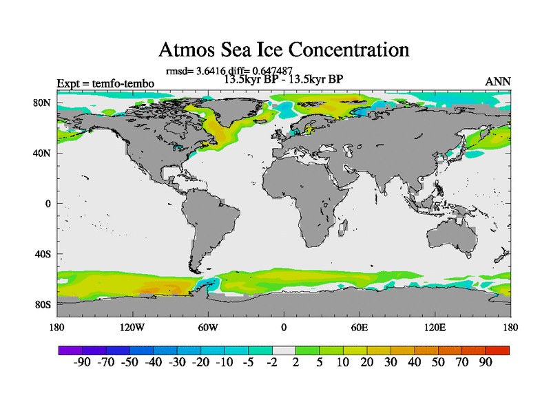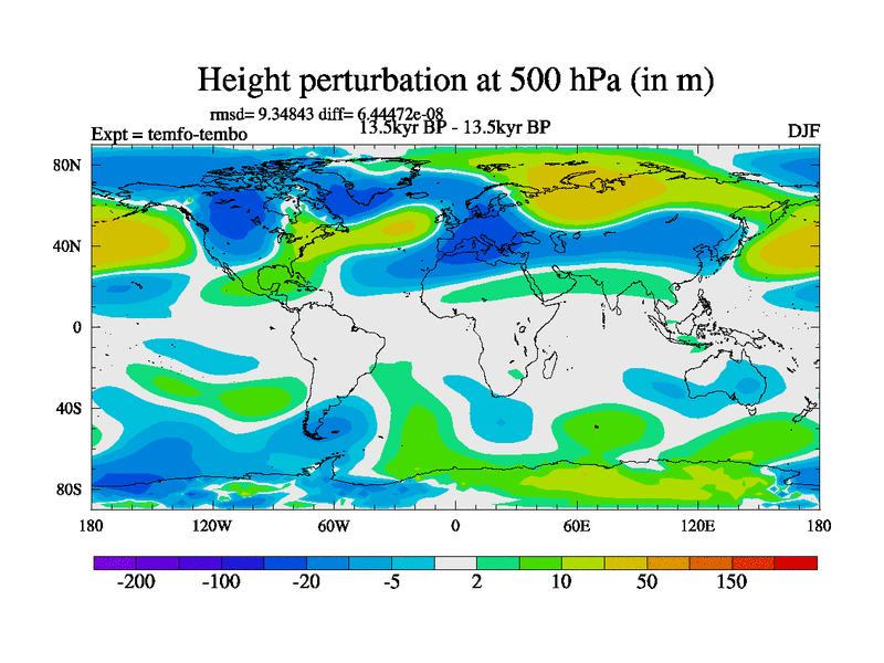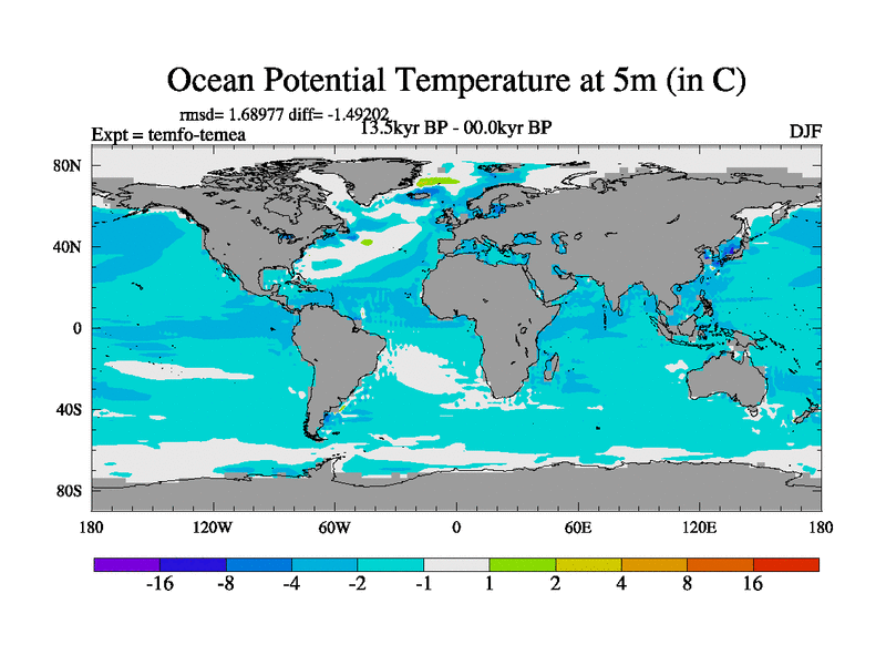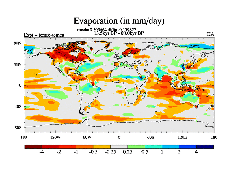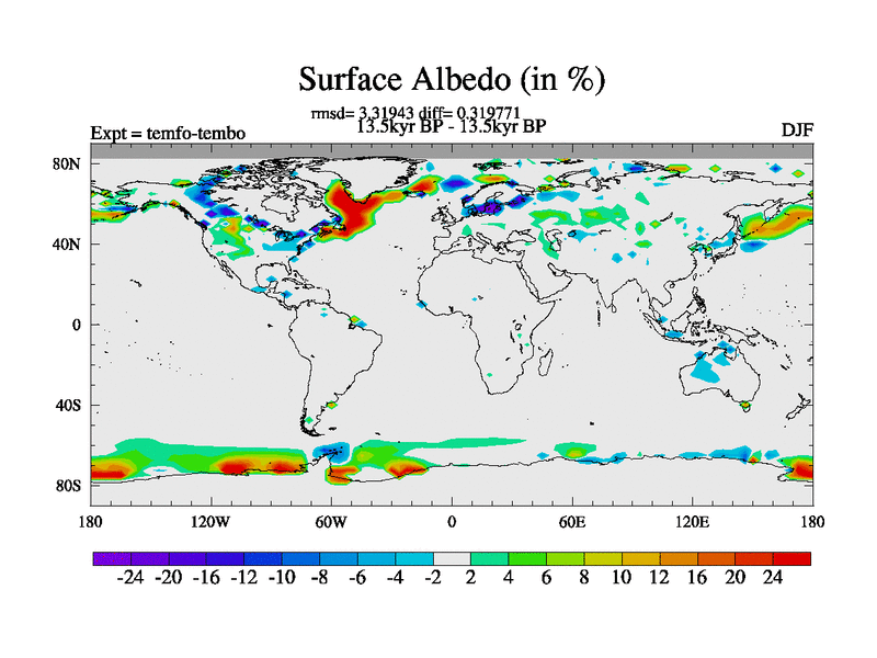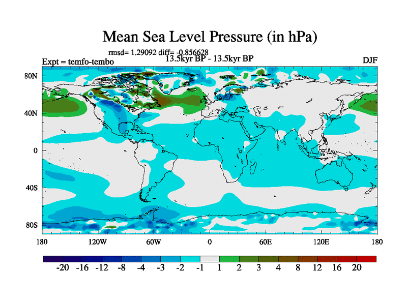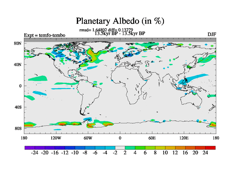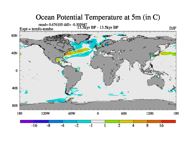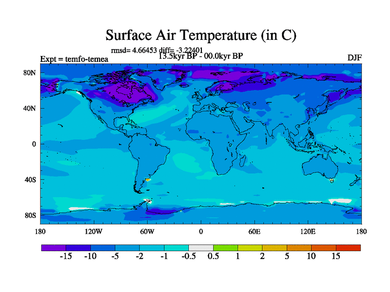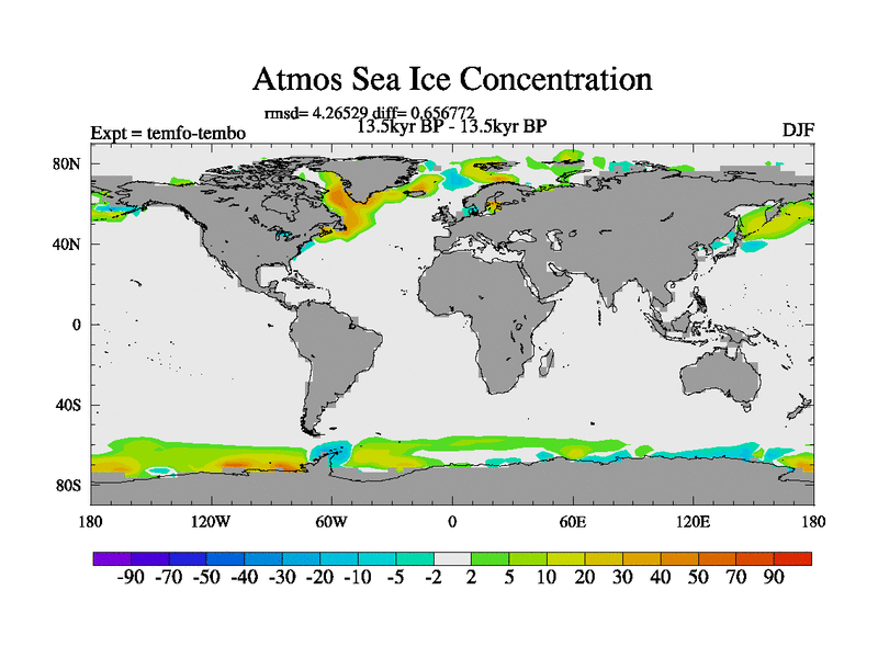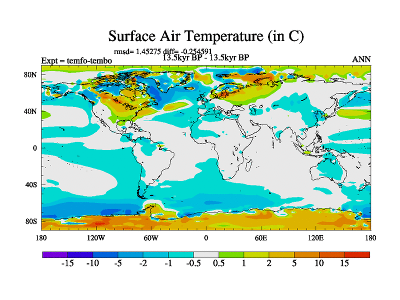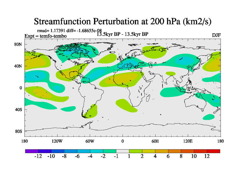 This is the 13.5 kyr BP simulation for a new set of deglaciation BBC runs using GLAC-1D and TRIFFID. Dynamic mode. No meltwater. Russian rivers routed to Med but only during height of glacial.