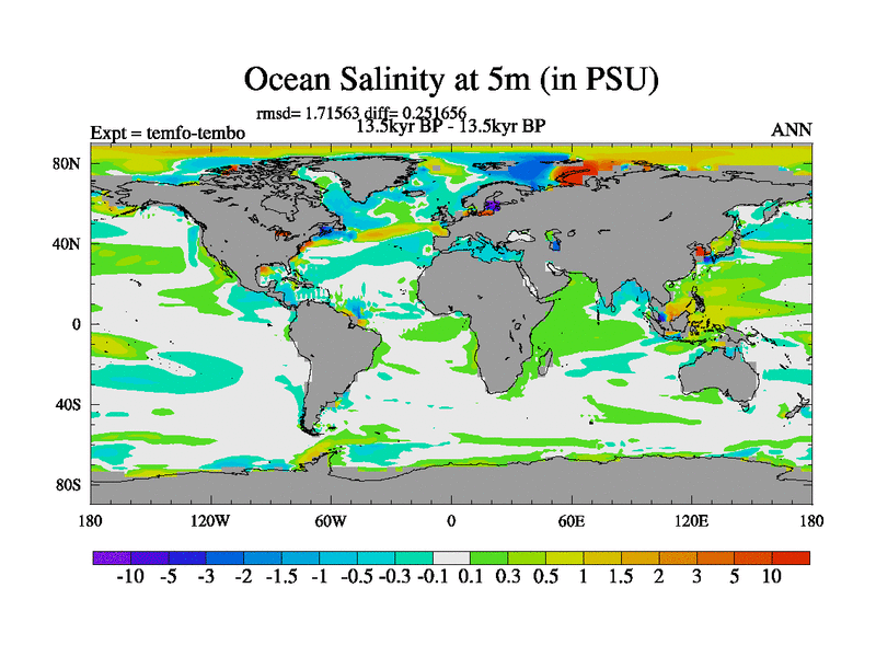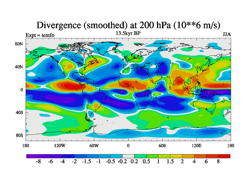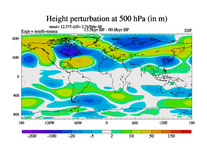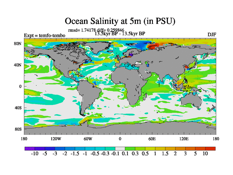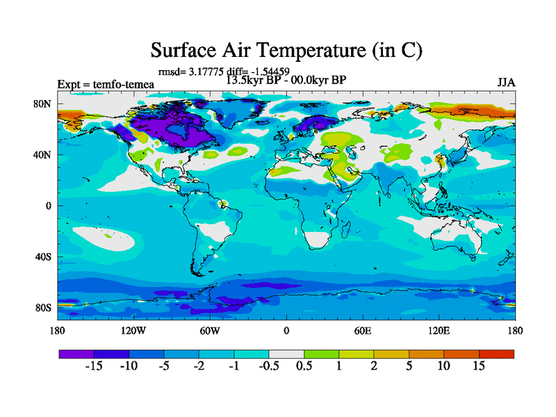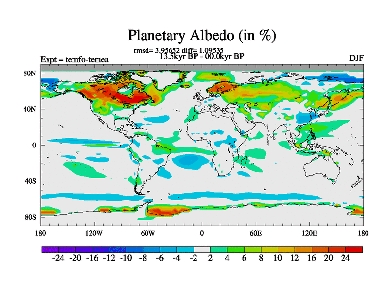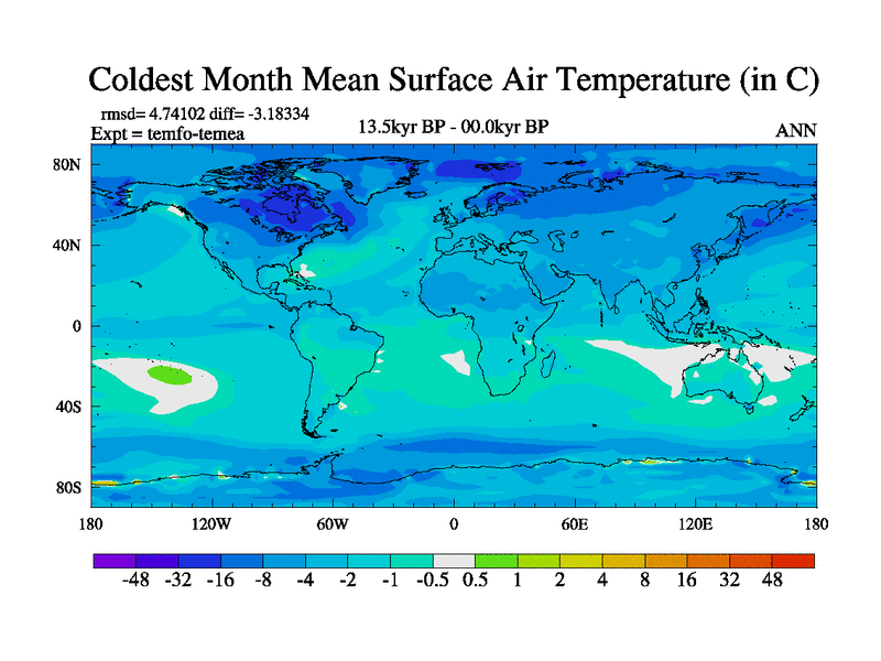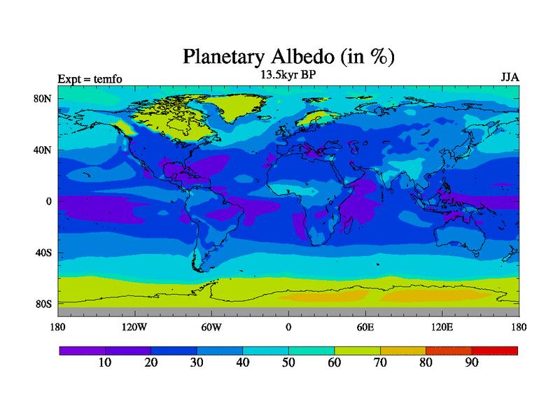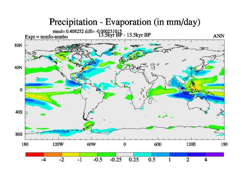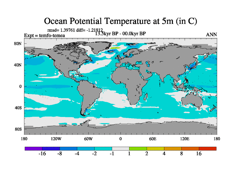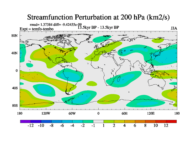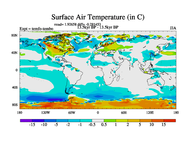 This is the 13.5 kyr BP simulation for a new set of deglaciation BBC runs using GLAC-1D and TRIFFID. Dynamic mode. No meltwater. Russian rivers routed to Med but only during height of glacial.