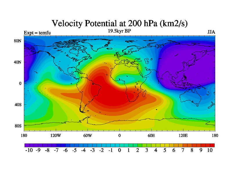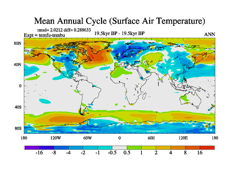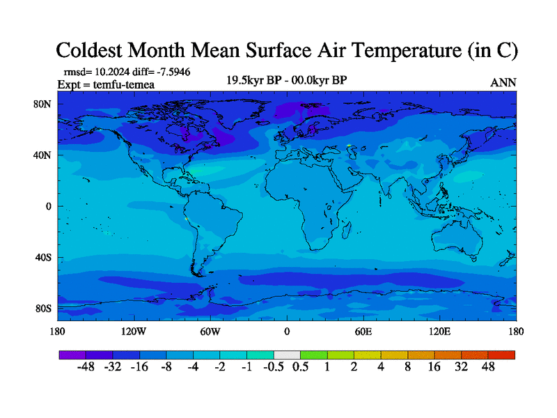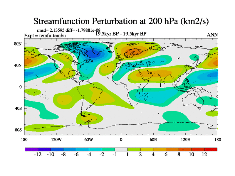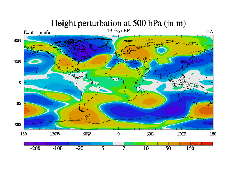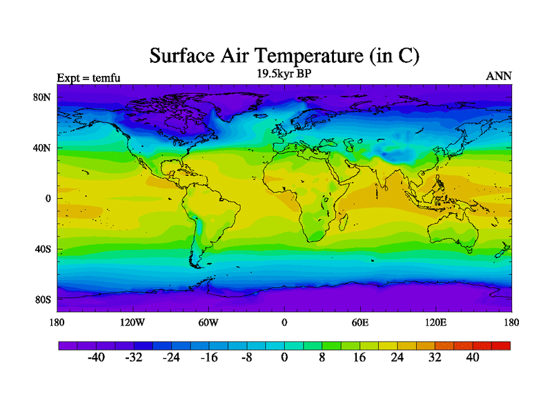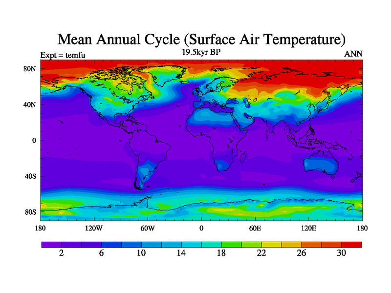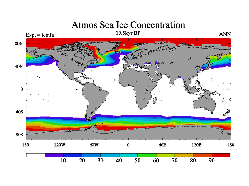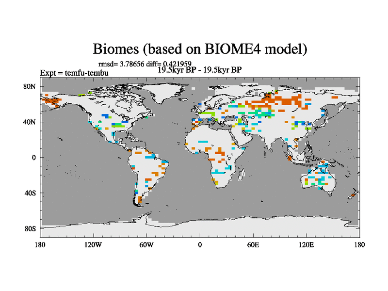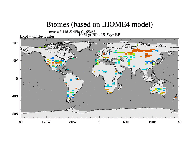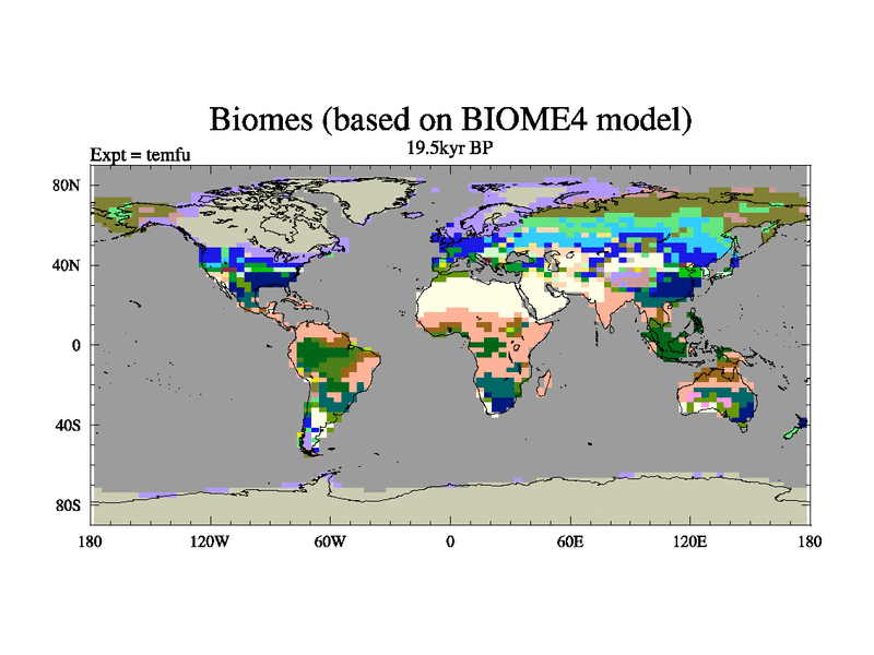 This is the 19.5 kyr BP simulation for a new set of deglaciation BBC runs using GLAC-1D and TRIFFID. Dynamic mode. No meltwater. Russian rivers routed to Med but only during height of glacial.