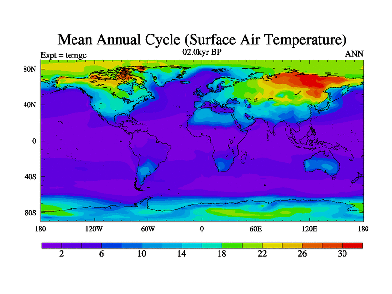 This is the 02.0 kyr BP simulation for a new set of deglaciation BBC runs using GLAC-1D and TRIFFID. Dynamic mode. No meltwater. Russian rivers routed to Arctic.