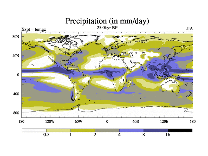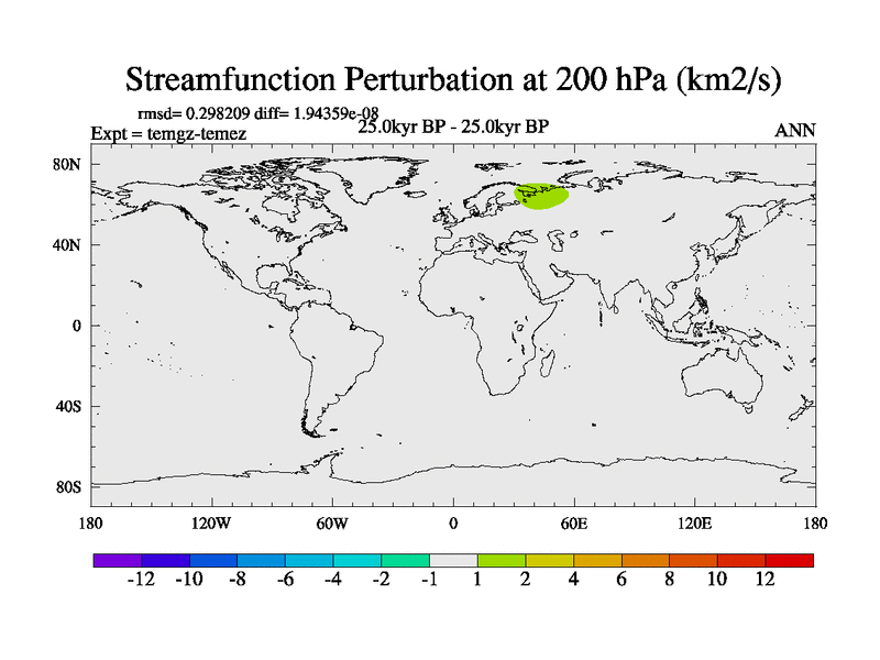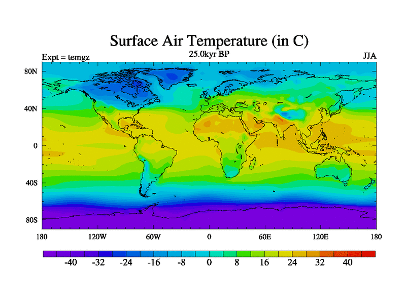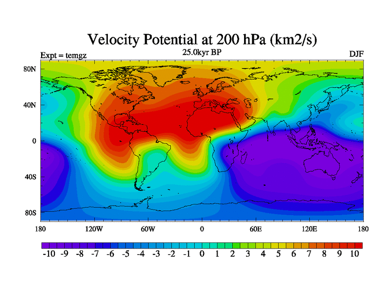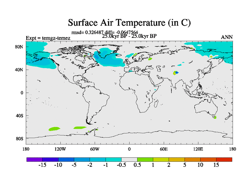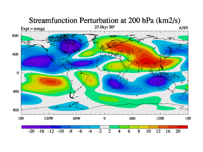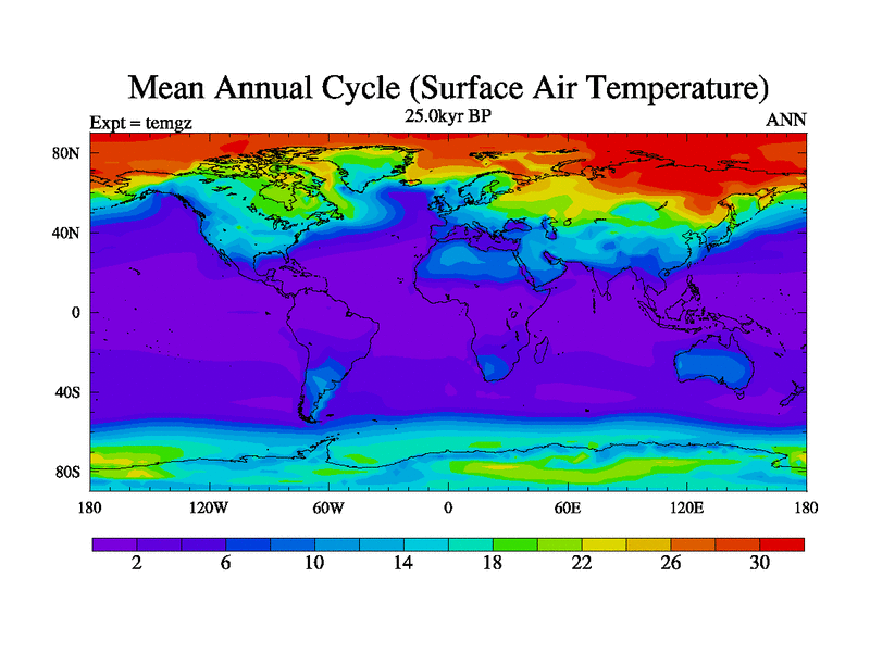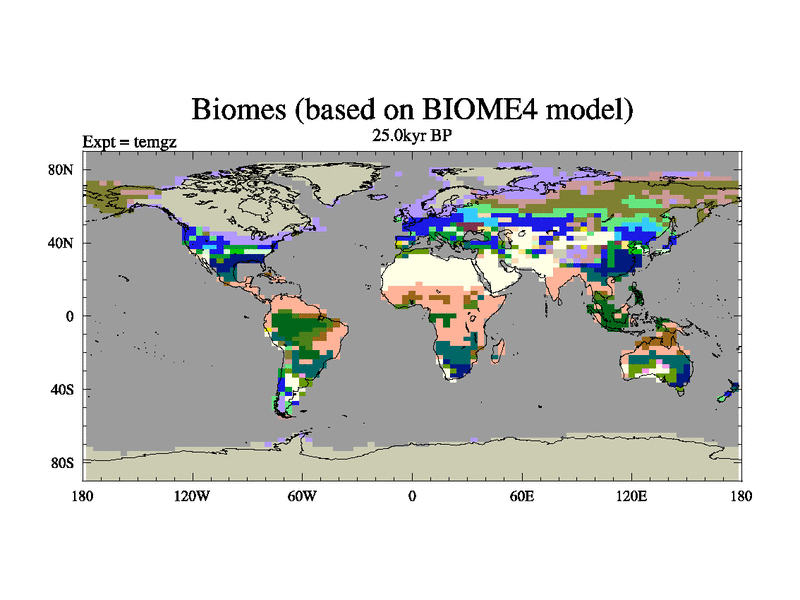 This is the 25.0 kyr BP simulation for a new set of deglaciation BBC runs using GLAC-1D and TRIFFID. Dynamic mode. No meltwater. Russian rivers routed to Arctic.