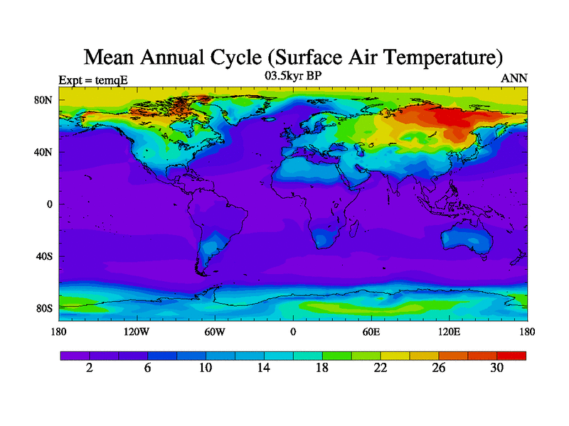 This is the 03.5 kyr BP simulation for an extension of the temi series but with CO2 set to the 100 year means of the transient runs. Deglaciation BBC runs using Peltier6g and TRIFFID. Dynamic mode.