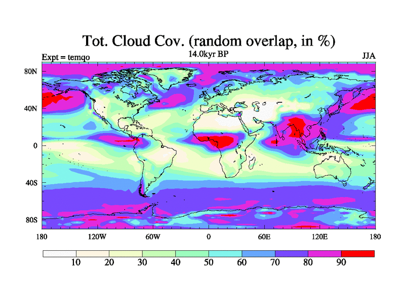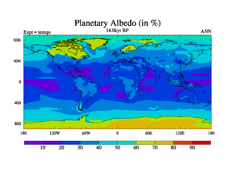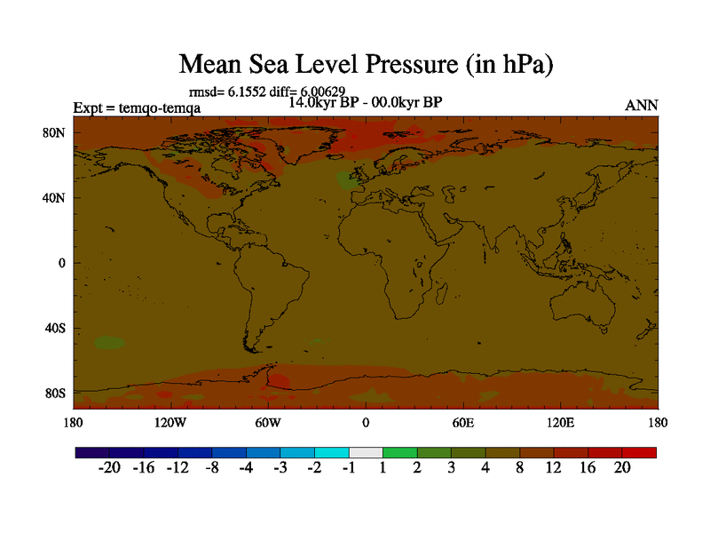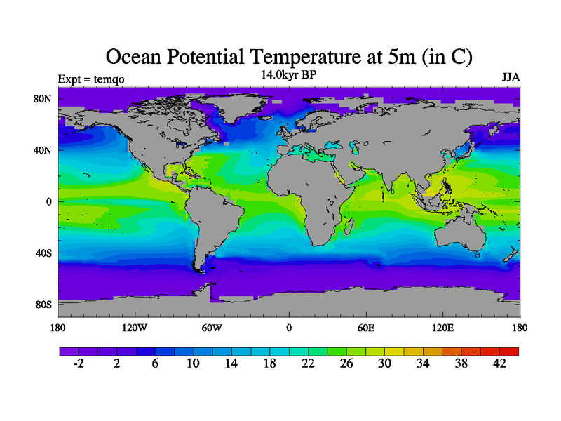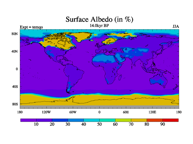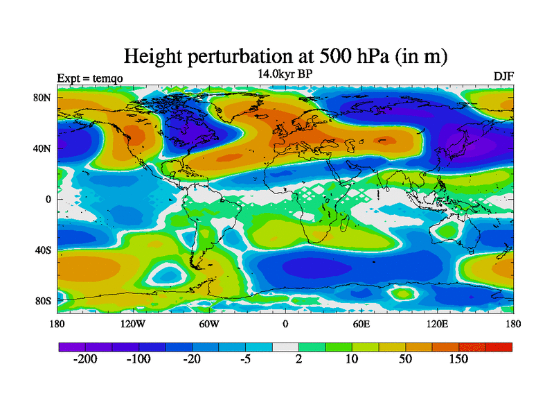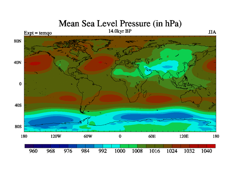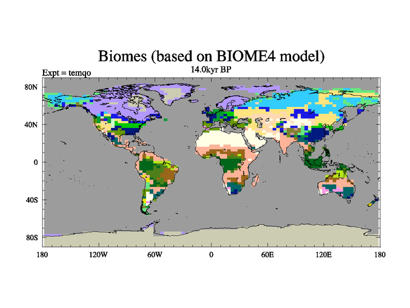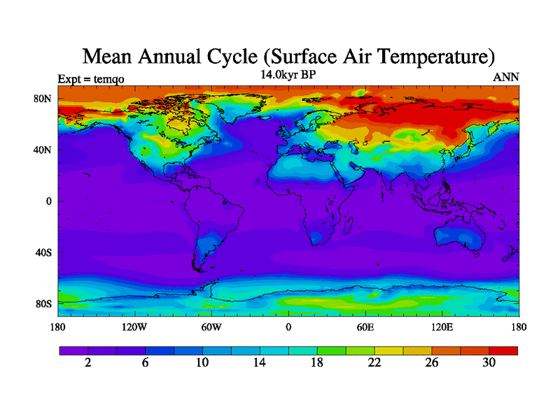 This is the 14.0 kyr BP simulation for an extension of the temi series but with CO2 set to the 100 year means of the transient runs. Deglaciation BBC runs using Peltier6g and TRIFFID. Dynamic mode.