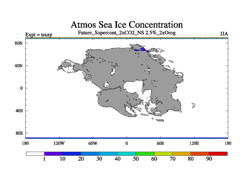 A future superconinental configuration based on the Scotese paleomap dataset. 2xCO2. Normal solar 2.5%. Age tracers started from teurb.BUT with the orogrpahy 2x higher. Test of paleogeog. impact.