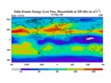 Low Pass Eddy Kinetic Energy at 200 hPa