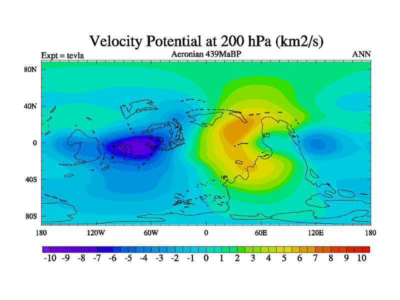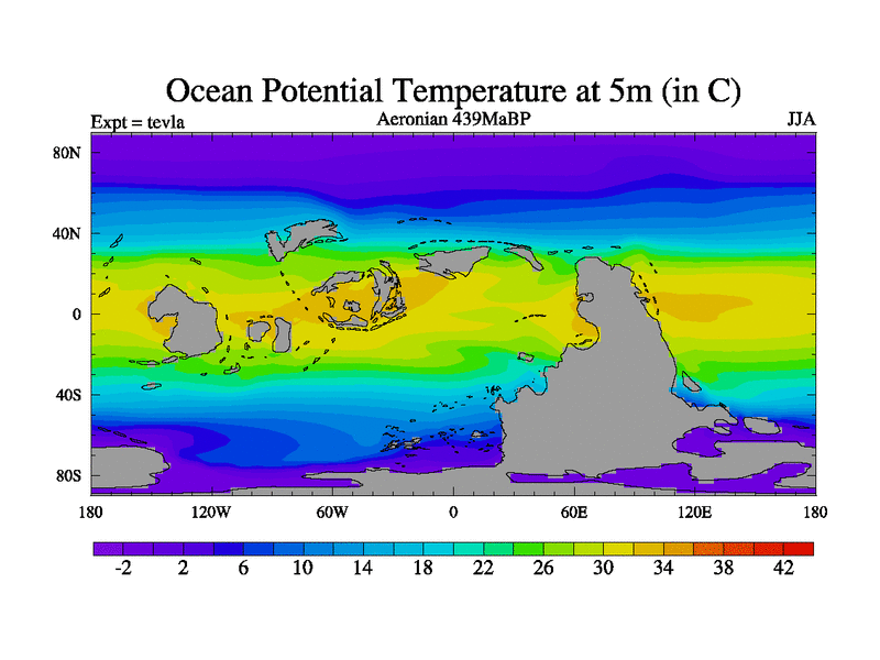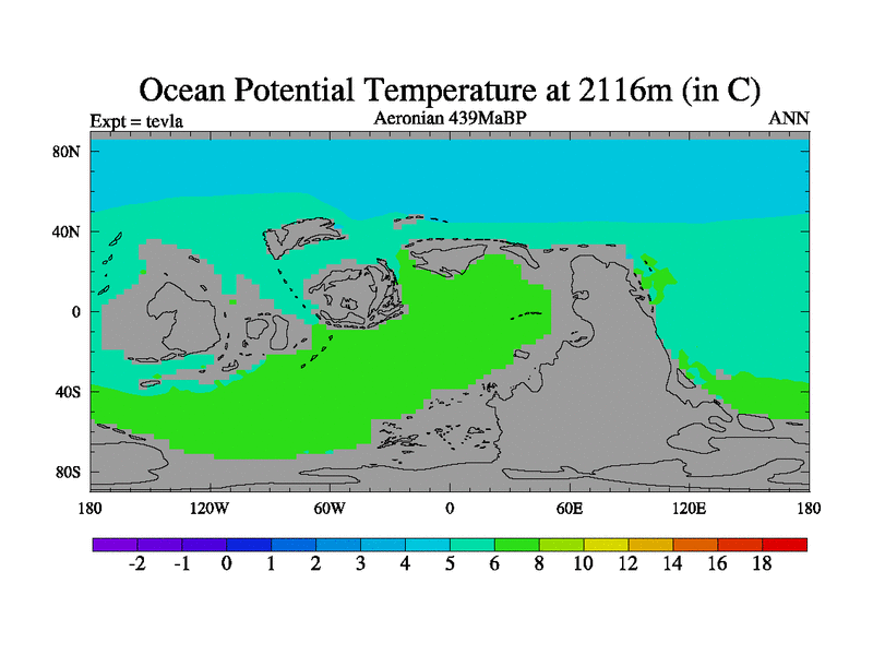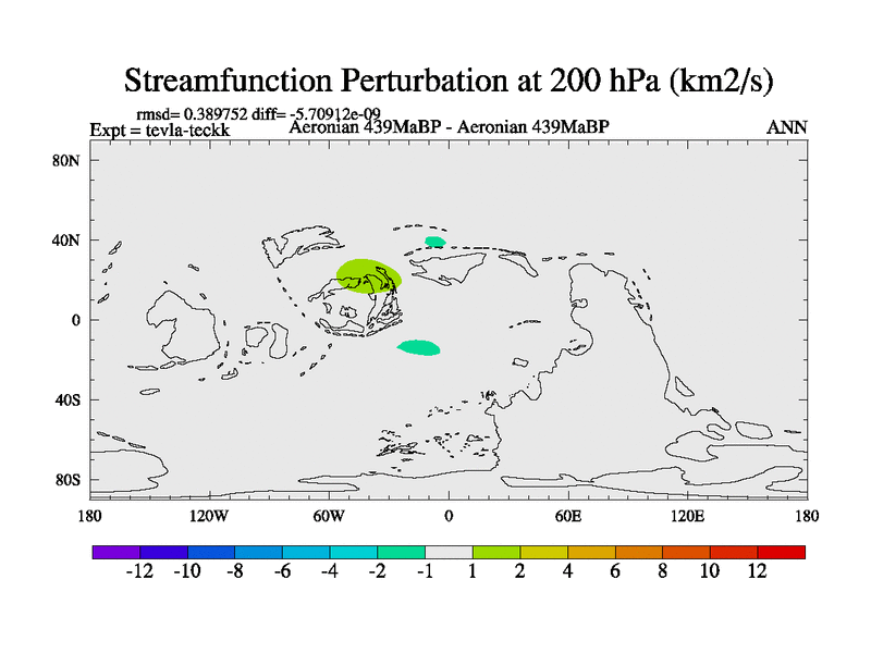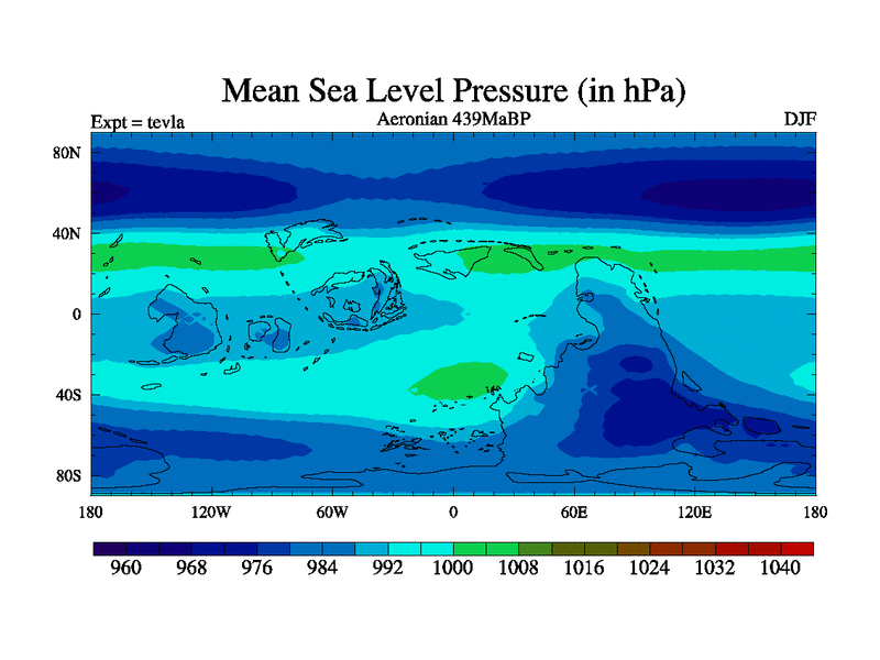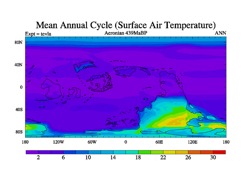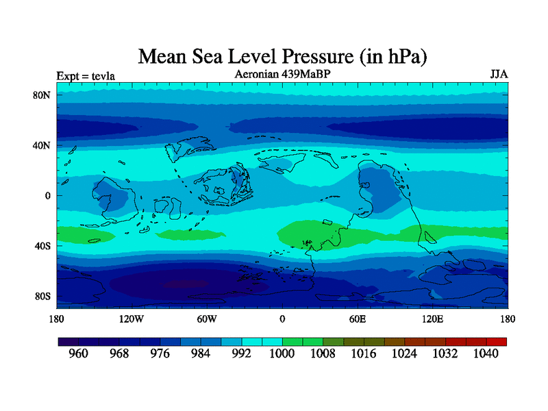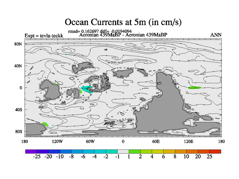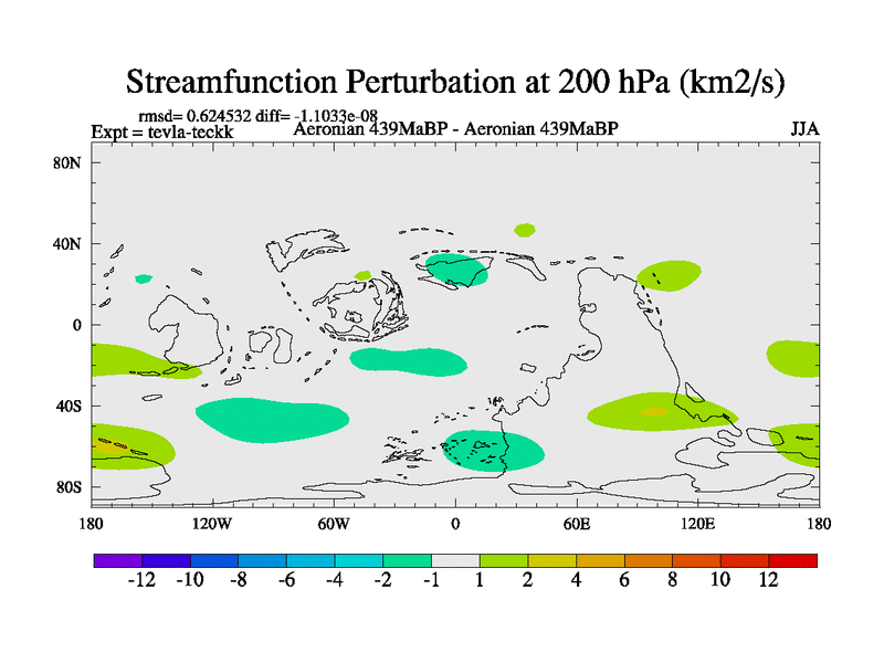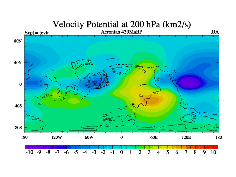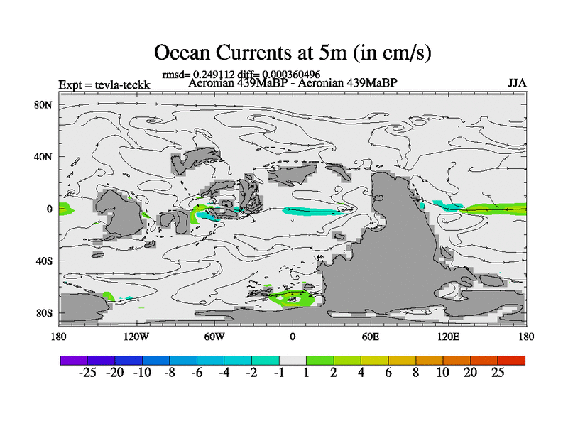 This is a Aeronian simulation with new control palaeogeog, with appropriate reduction in solar constant. It is also using the newer ozone mod which better represents the effects of stratospheric ozone. It does include the ocean stream function.