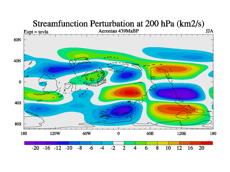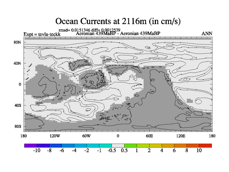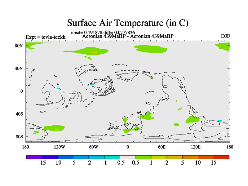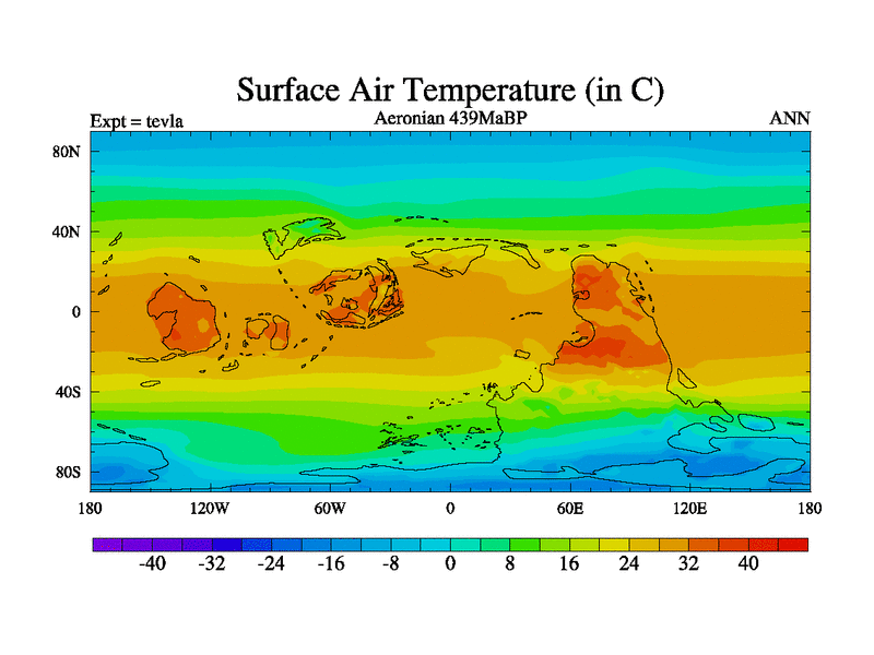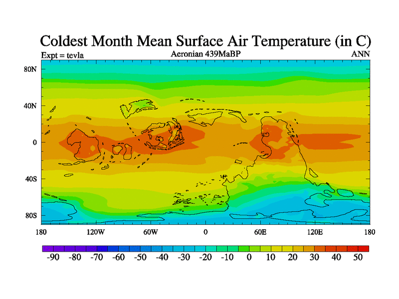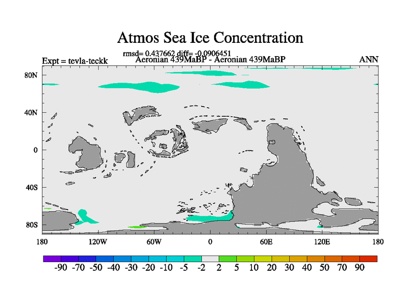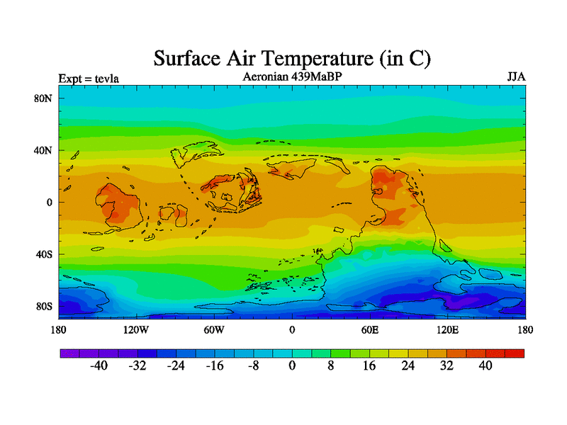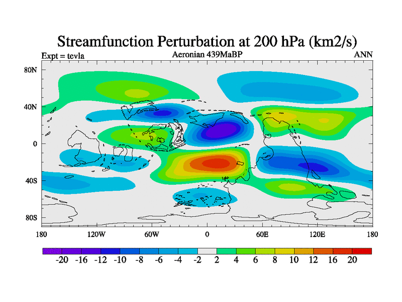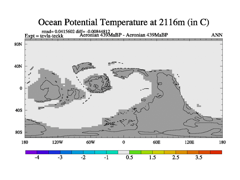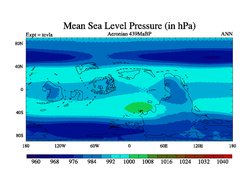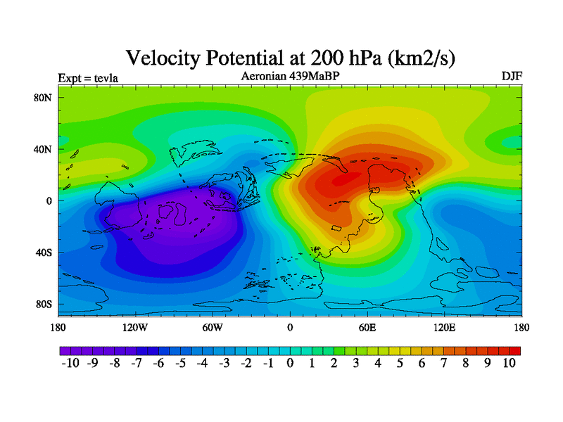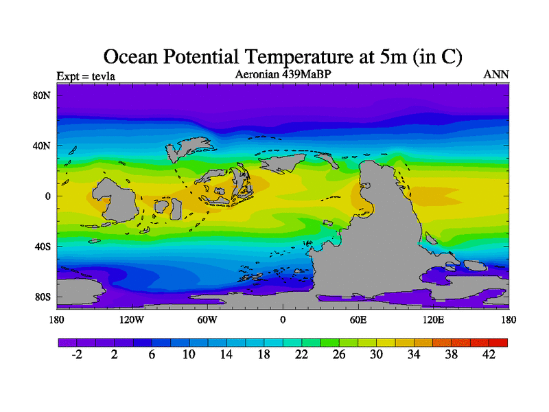 This is a Aeronian simulation with new control palaeogeog, with appropriate reduction in solar constant. It is also using the newer ozone mod which better represents the effects of stratospheric ozone. It does include the ocean stream function.