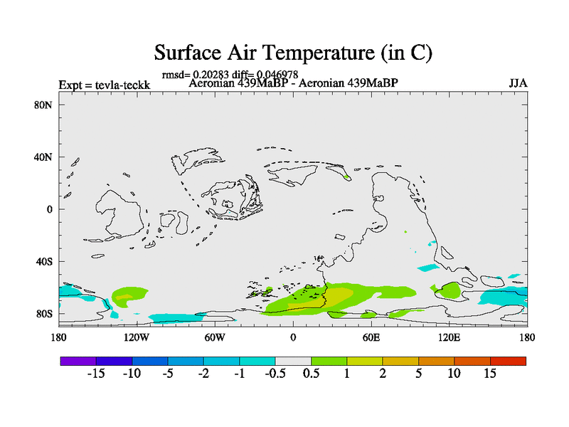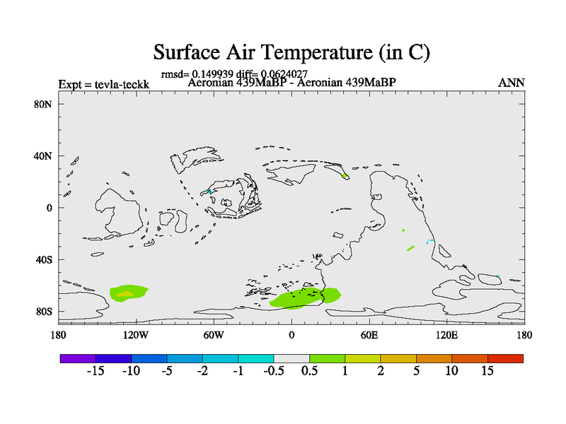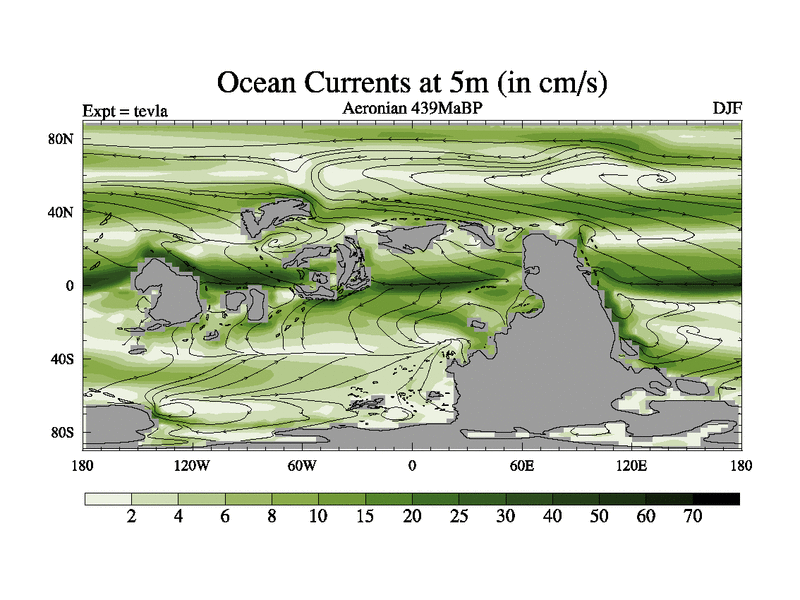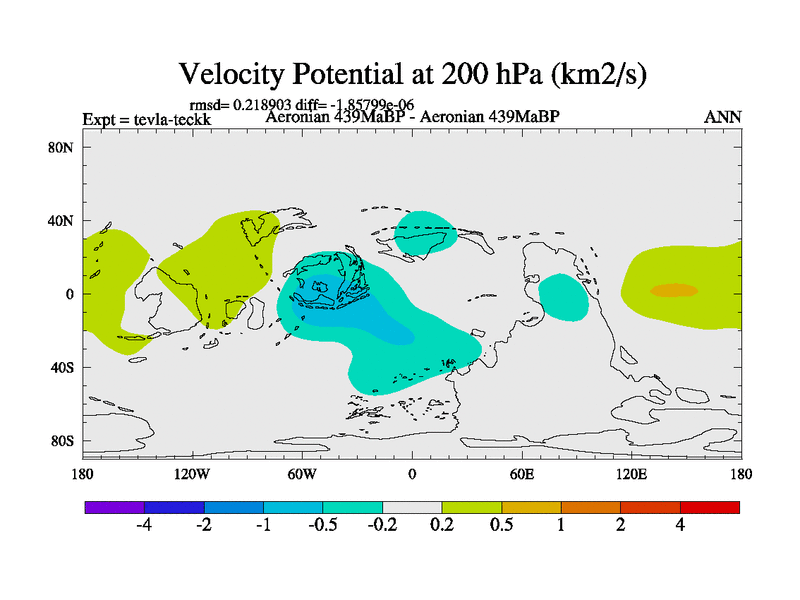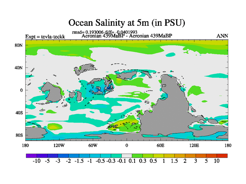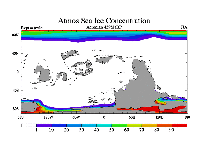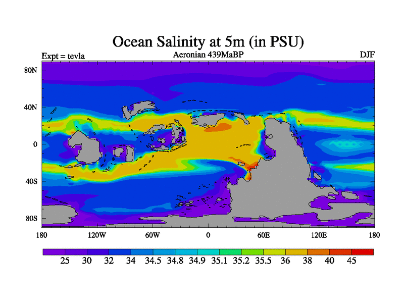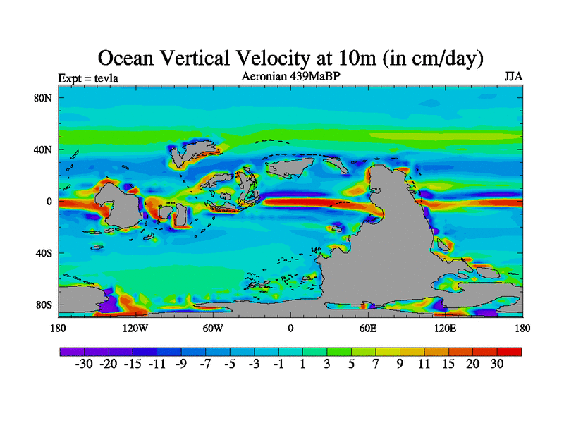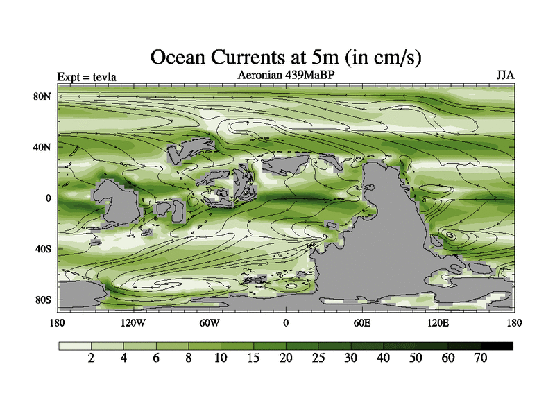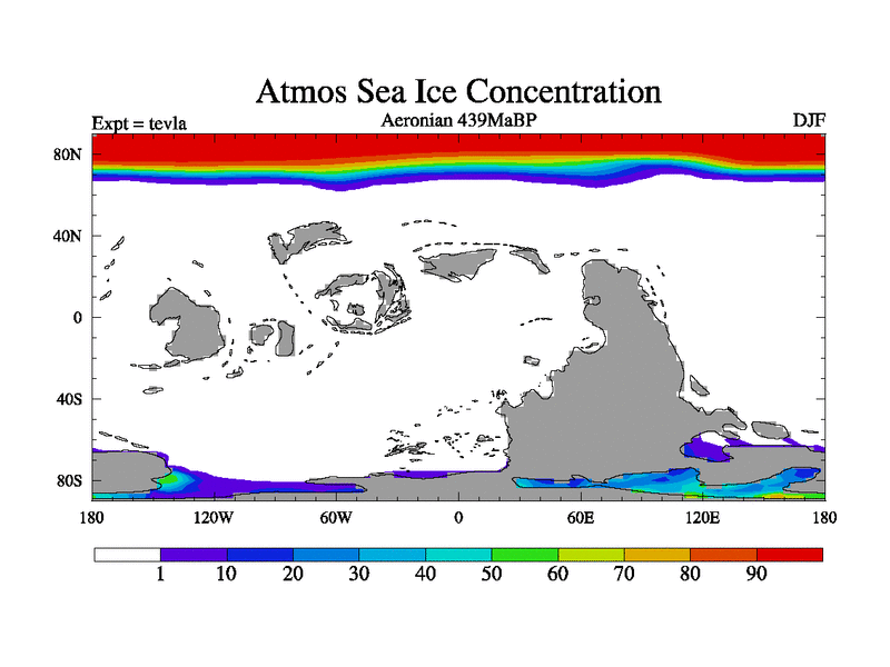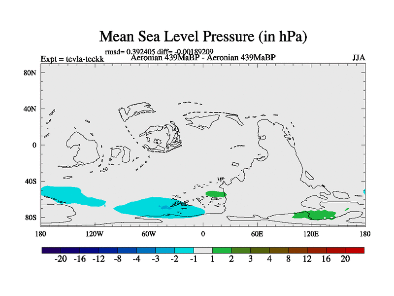 This is a Aeronian simulation with new control palaeogeog, with appropriate reduction in solar constant. It is also using the newer ozone mod which better represents the effects of stratospheric ozone. It does include the ocean stream function.