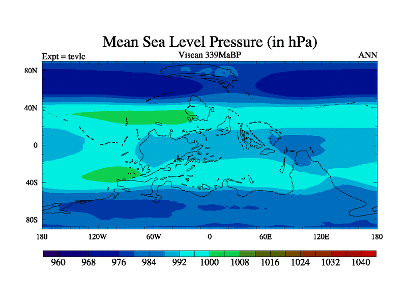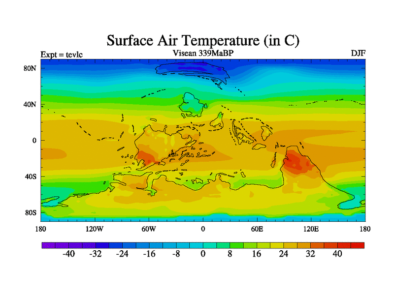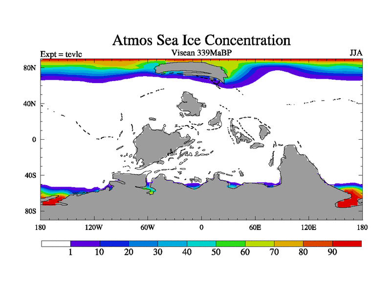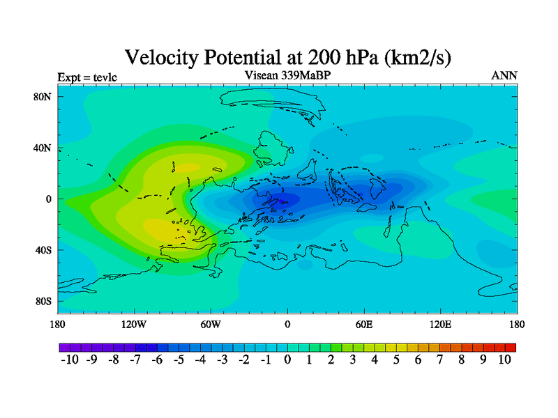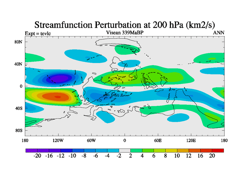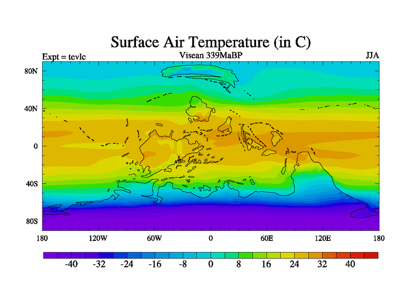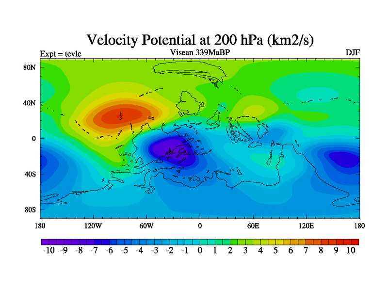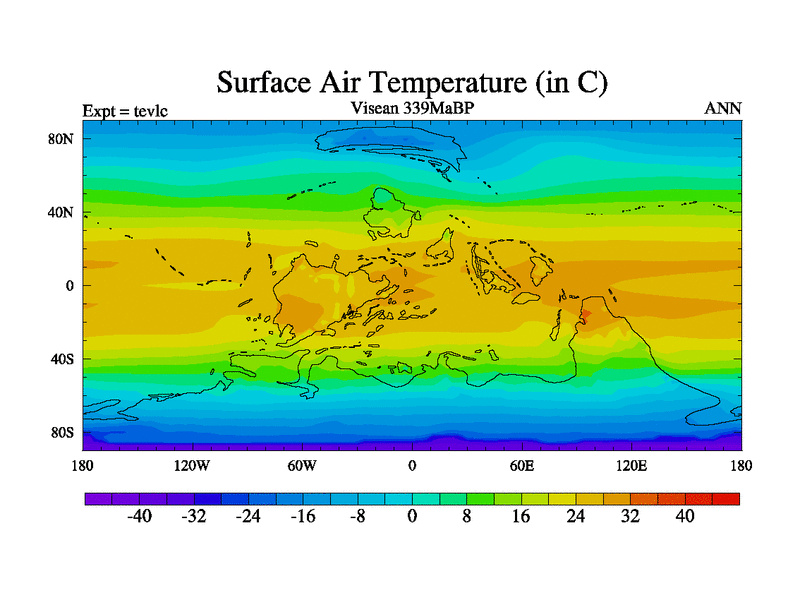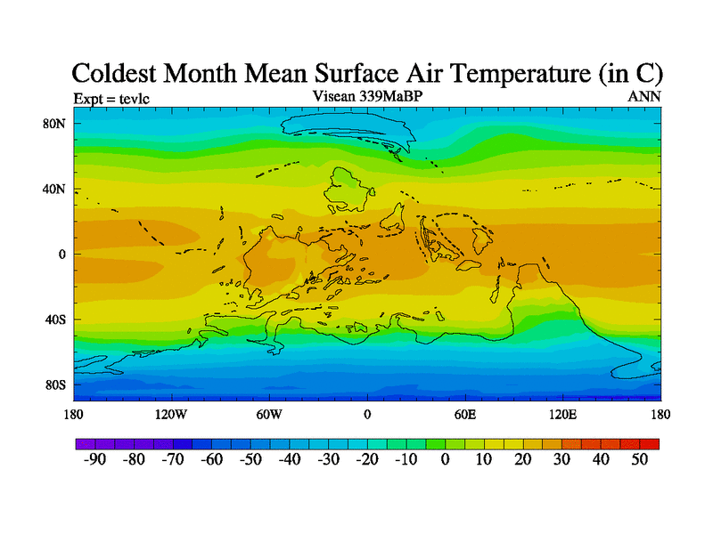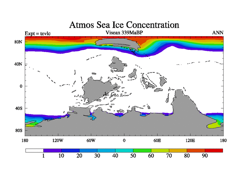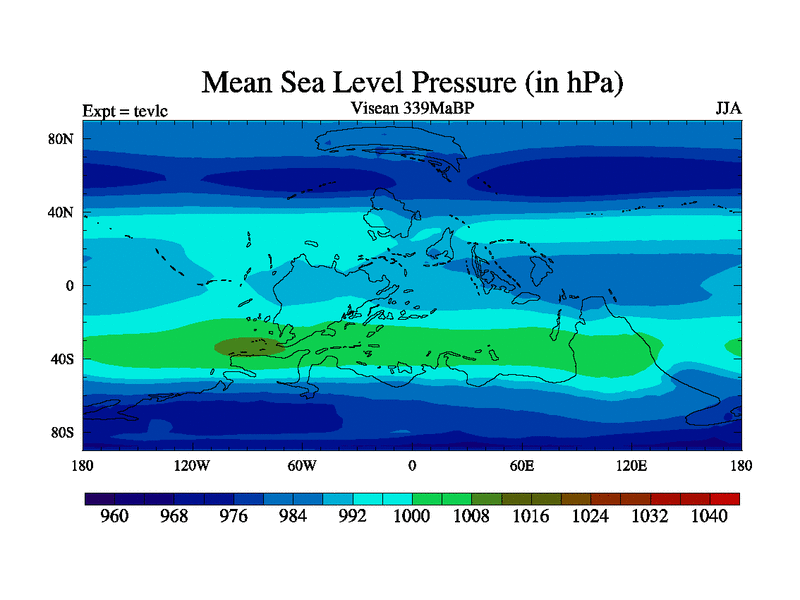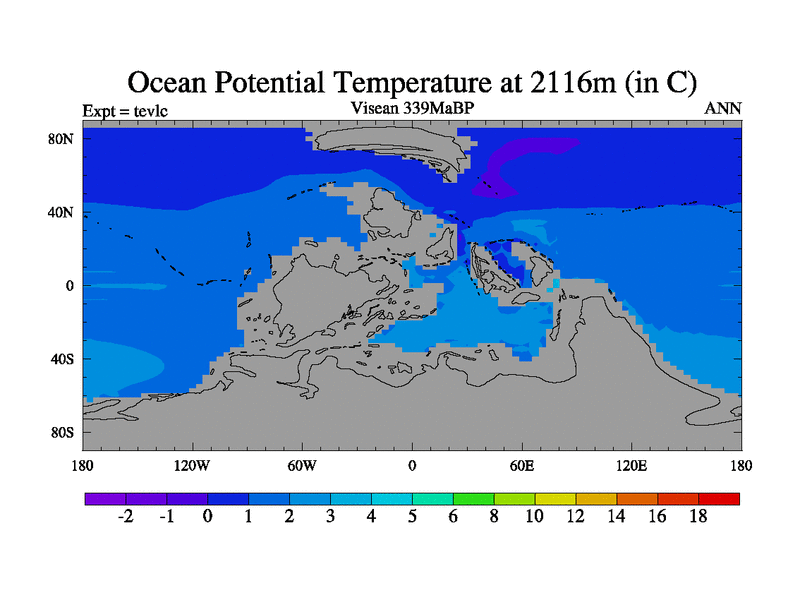 This is a Visean simulation with new control palaeogeog, 3xco2 and with appropriate reduction in solar constant. It is also using the newer ozone mod which better represents the effects of stratospheric ozone. It does include the ocean stream function.