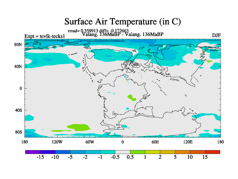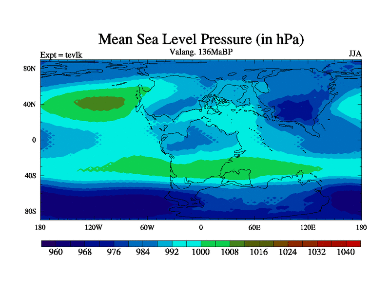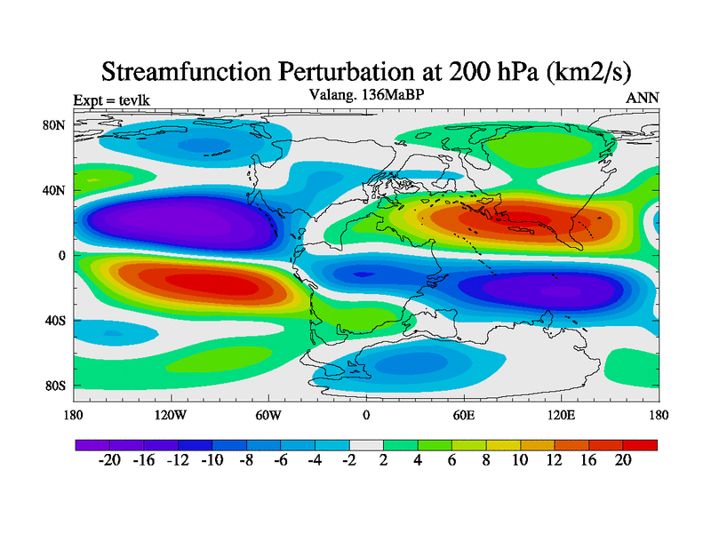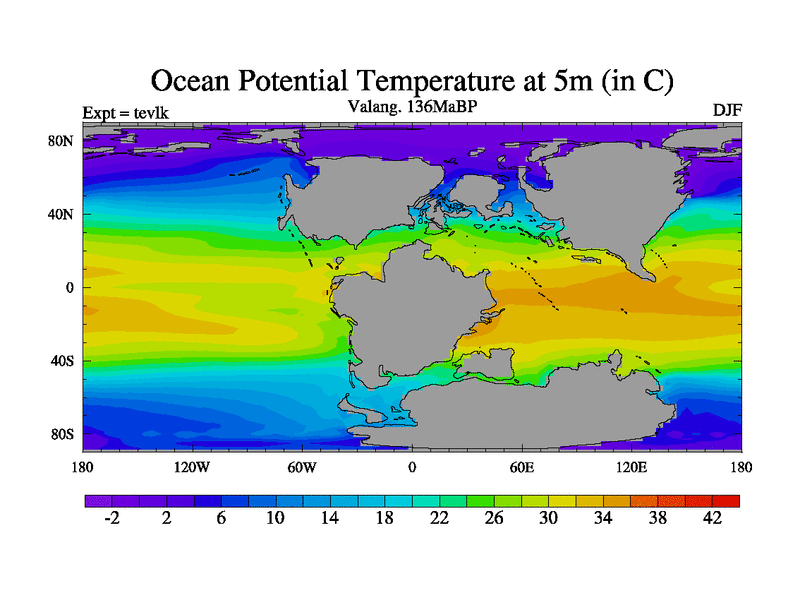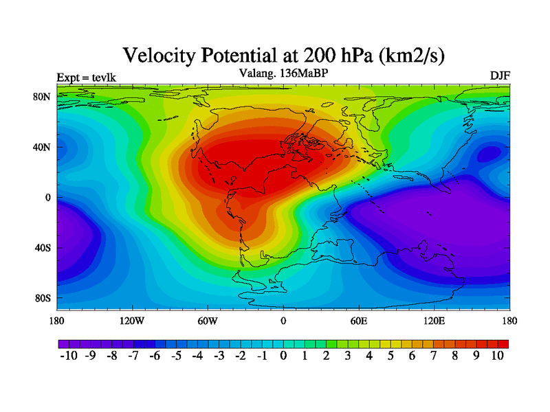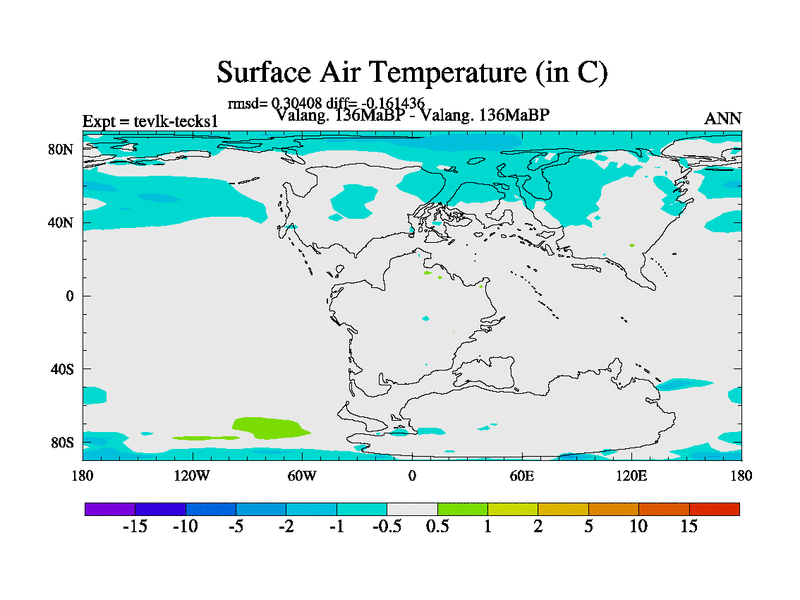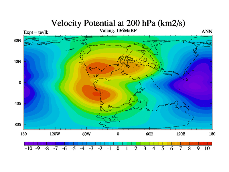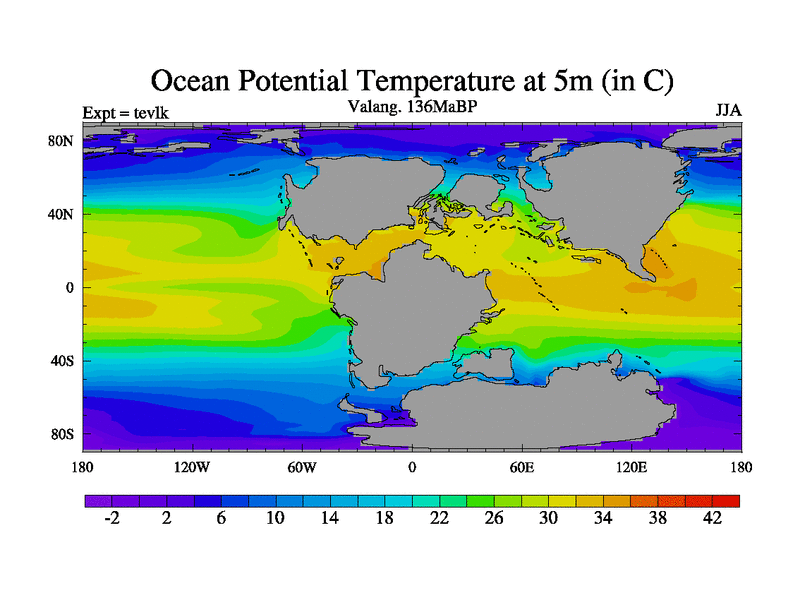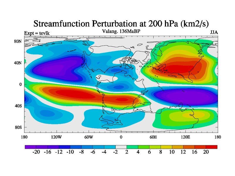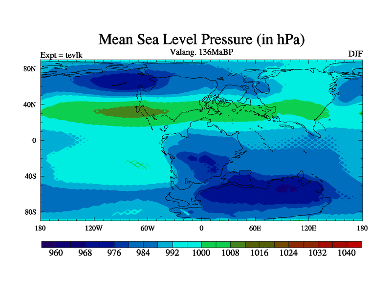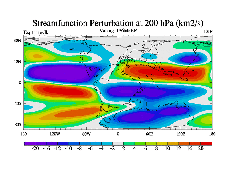 This is a Valanginian simulation with new control palaeogeog, 3xco2 and with appropriate reduction in solar constant. It is also using the newer ozone mod which better represents the effects of stratospheric ozone. It does include the ocean stream function.