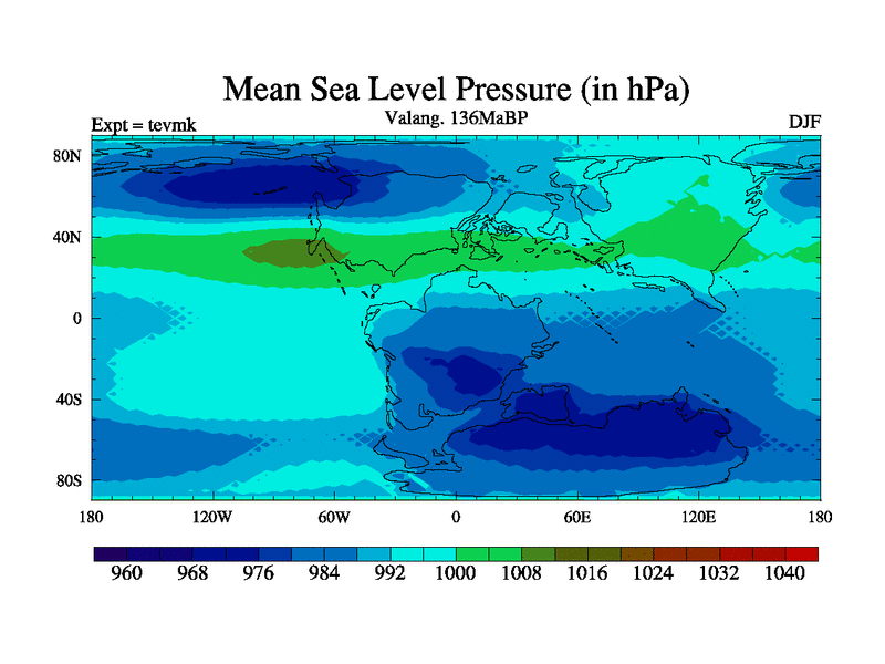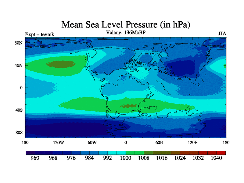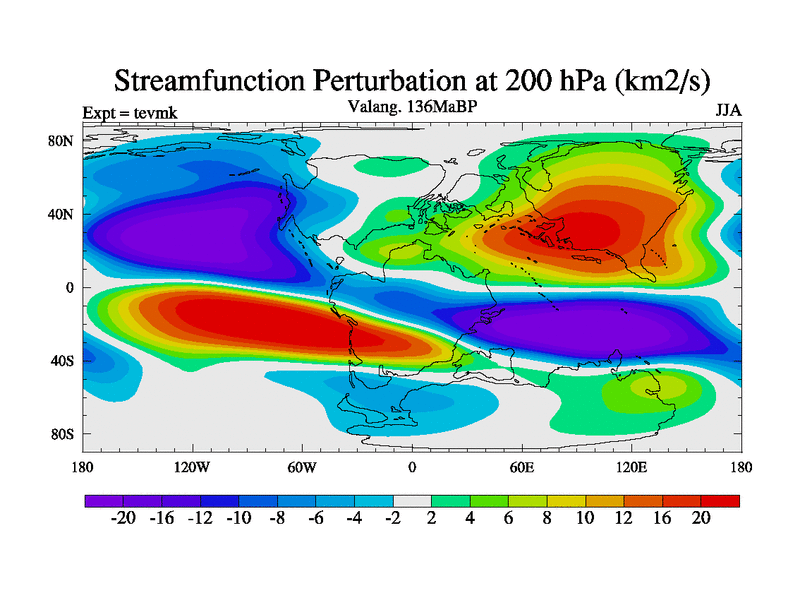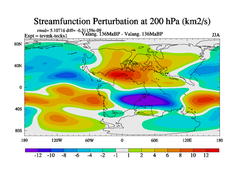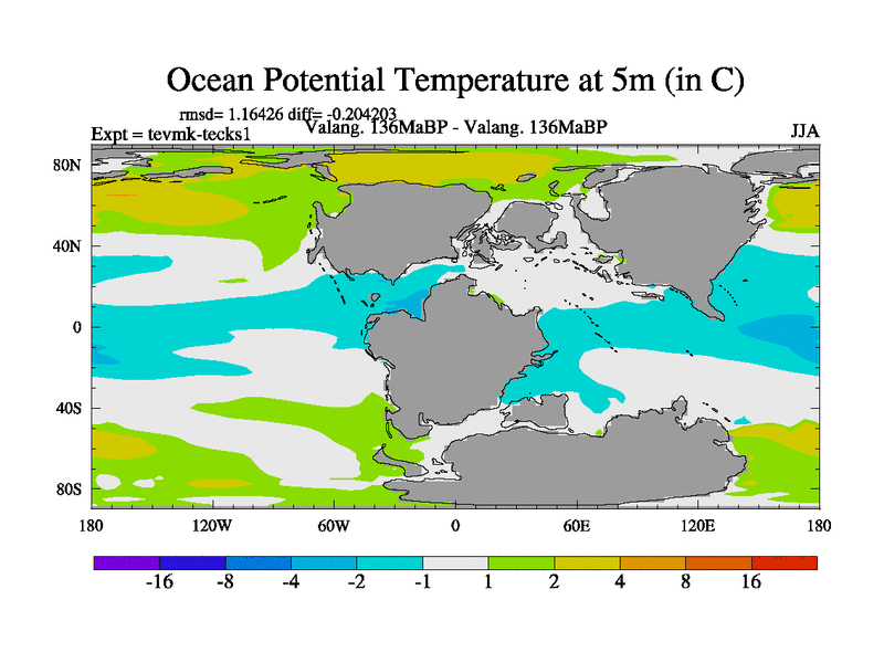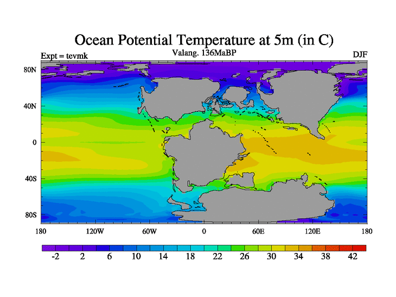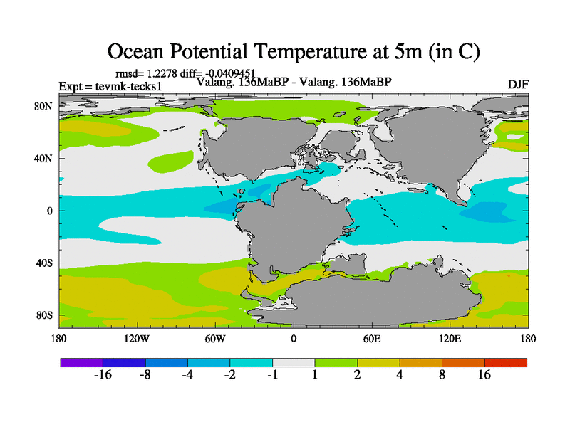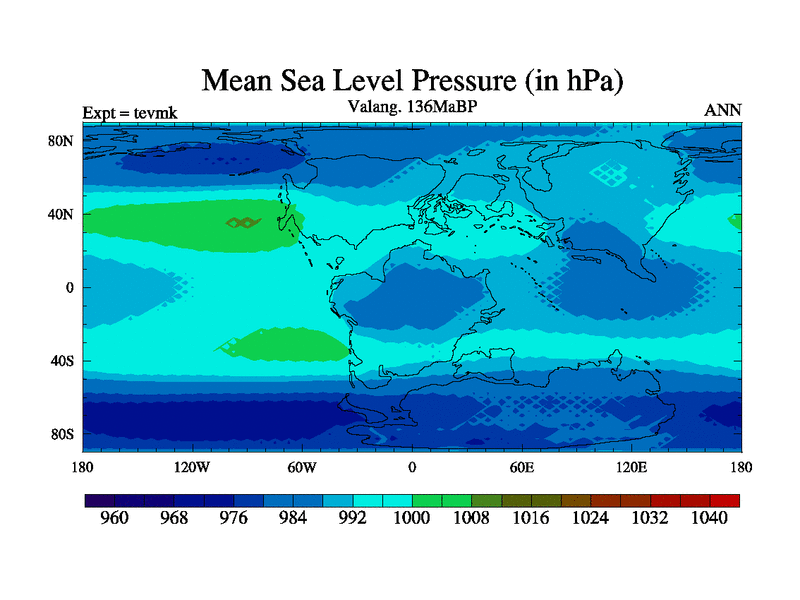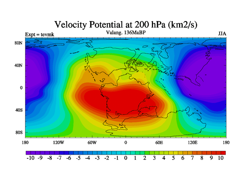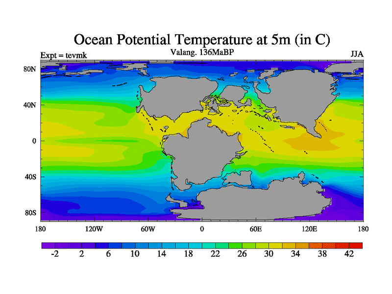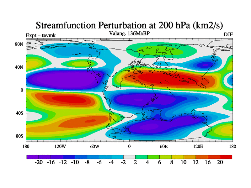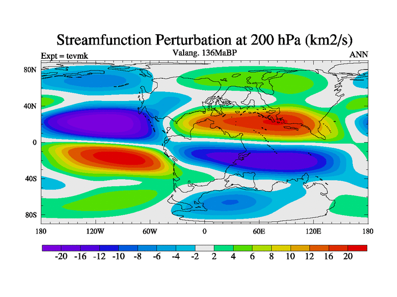 This is a Valanginian simulation with new control palaeogeog, 3xco2 and with appropriate reduction in solar constant. It is also using the newer ozone mod which better represents the effects of stratospheric ozone. It does include the ocean stream function.