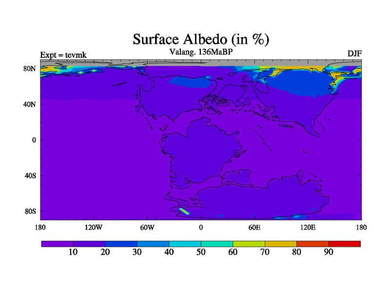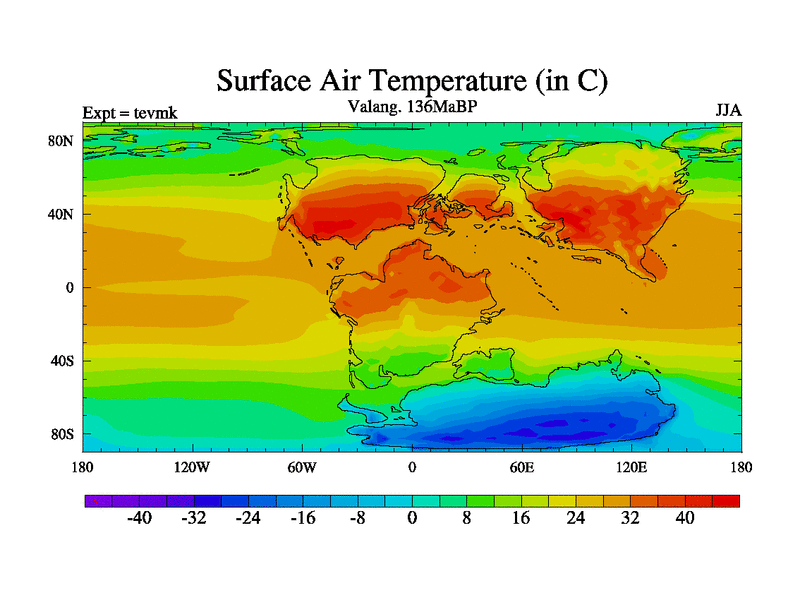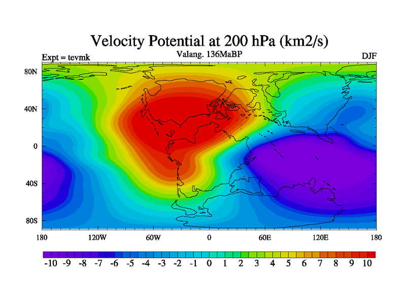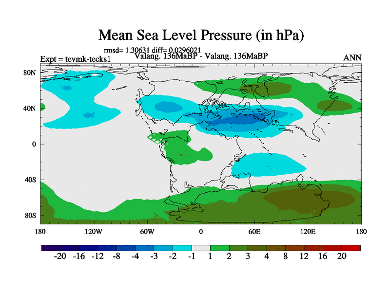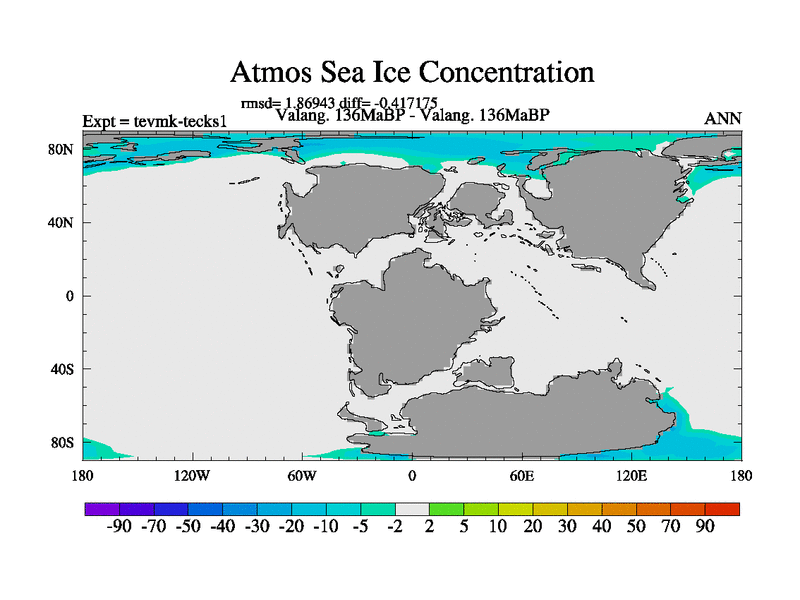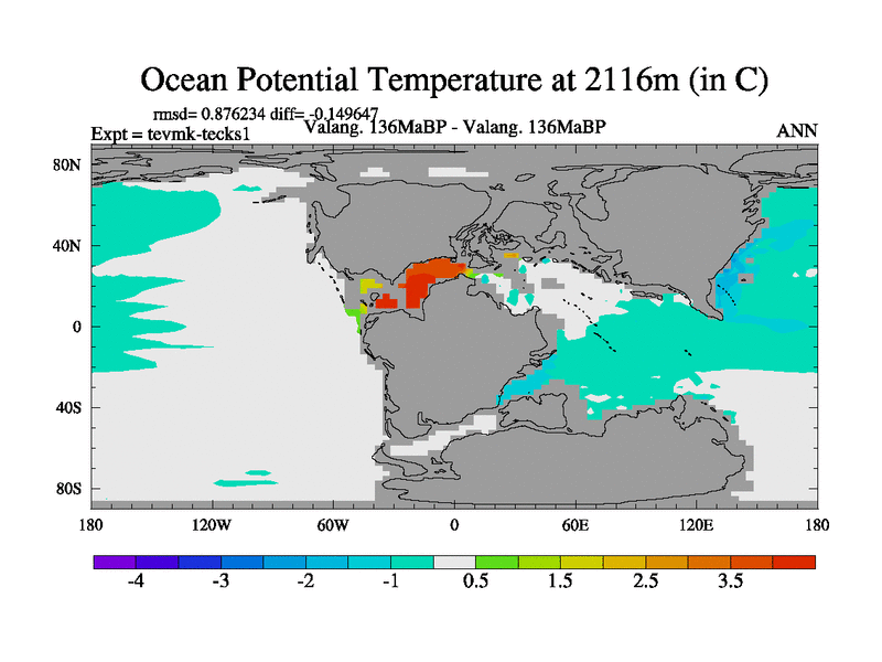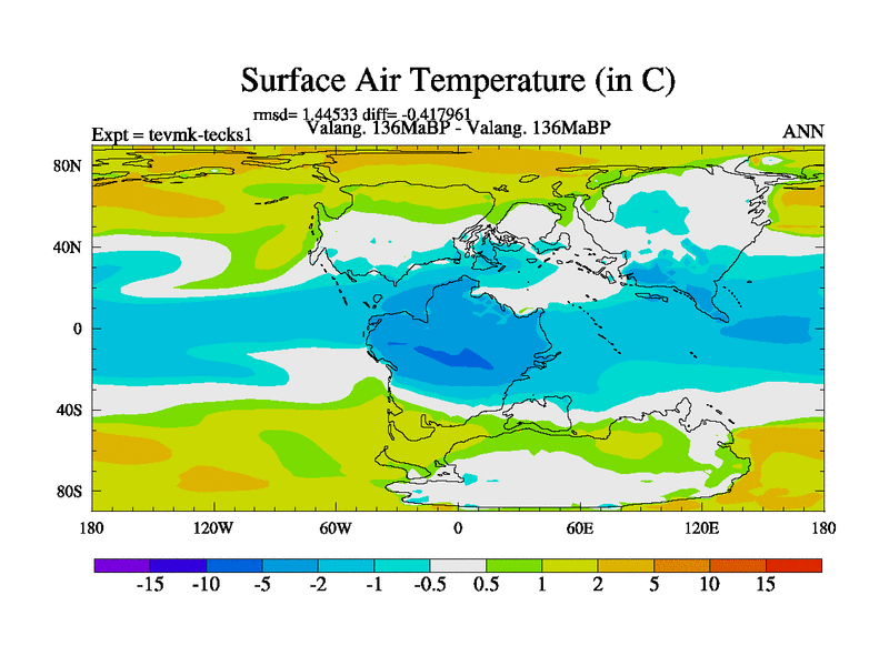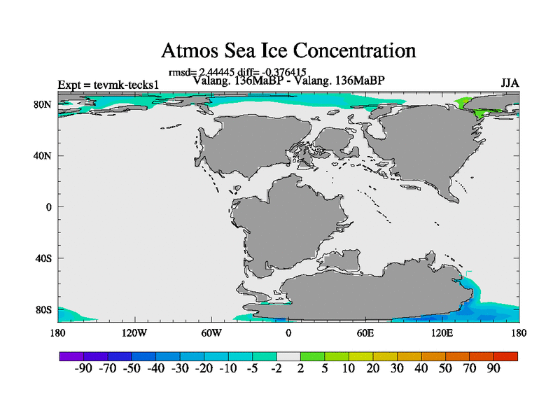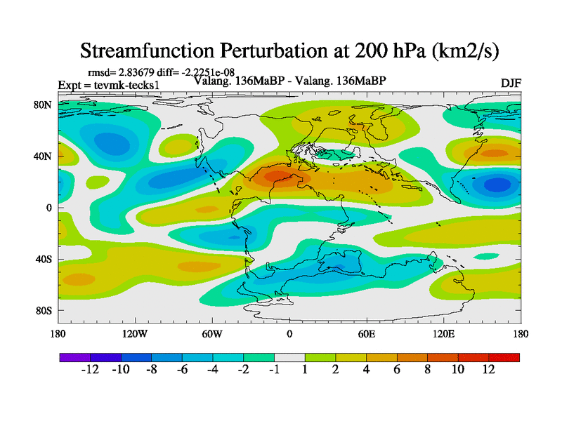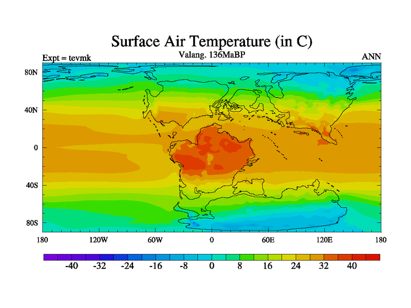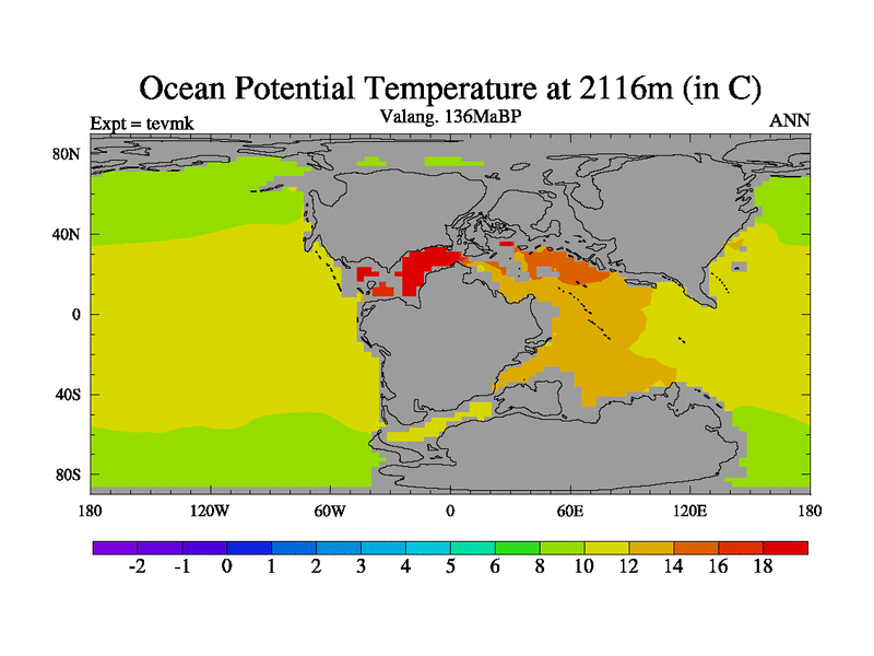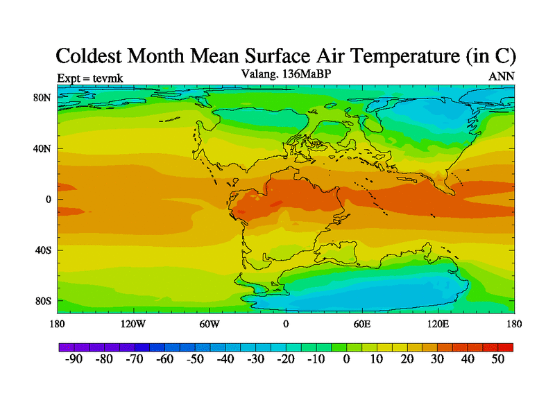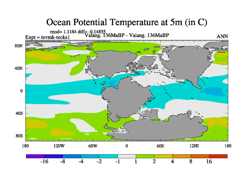 This is a Valanginian simulation with new control palaeogeog, 3xco2 and with appropriate reduction in solar constant. It is also using the newer ozone mod which better represents the effects of stratospheric ozone. It does include the ocean stream function.