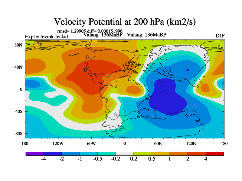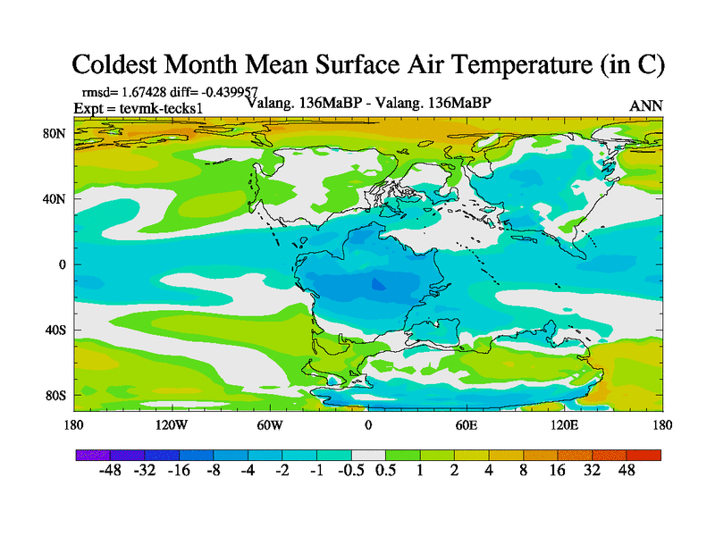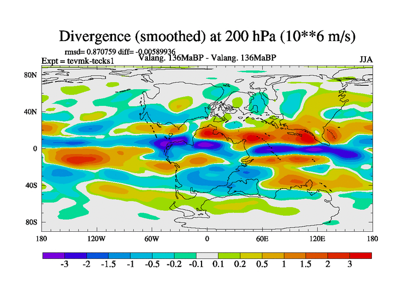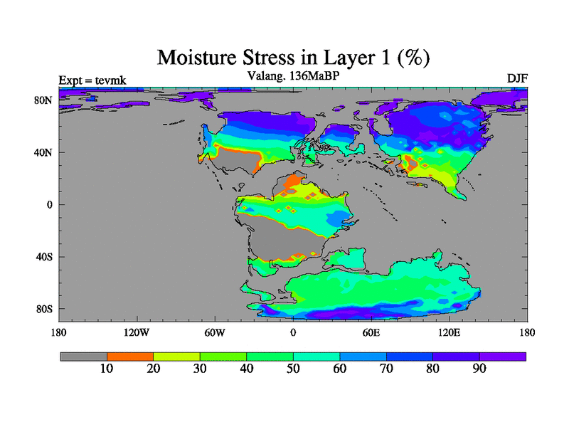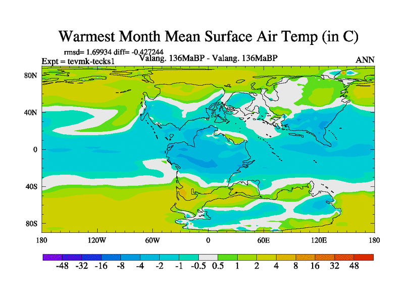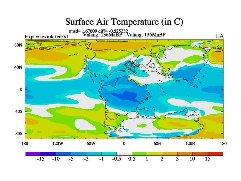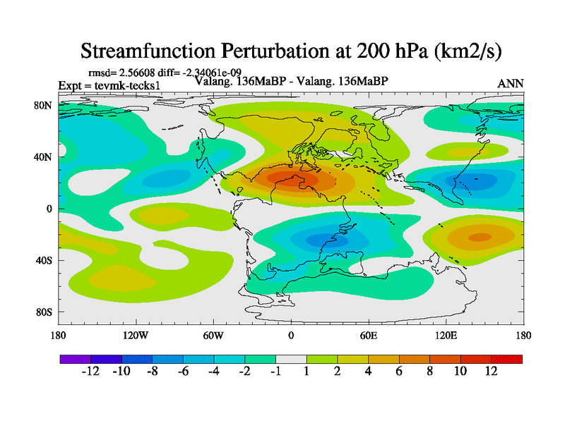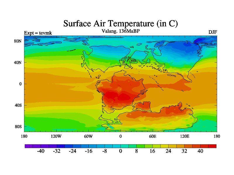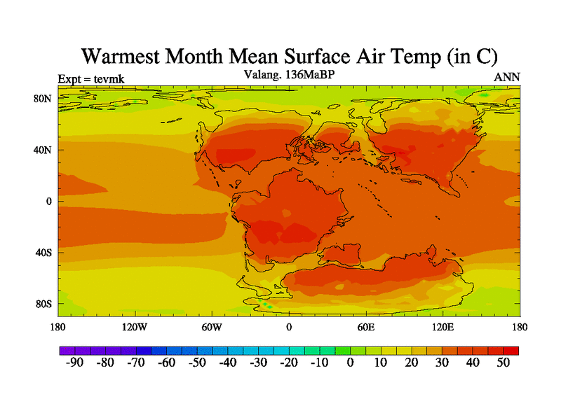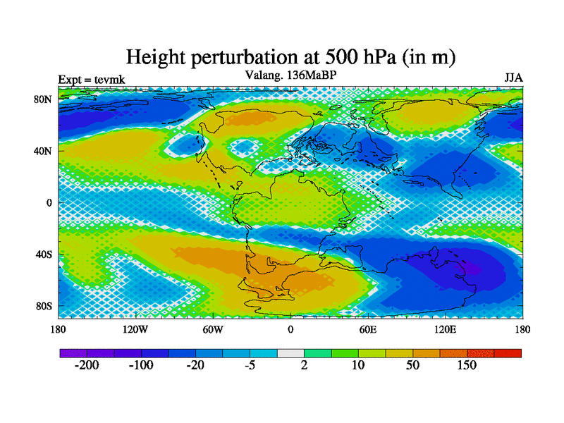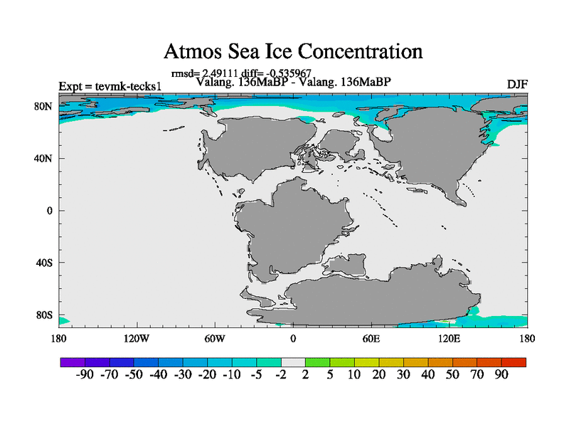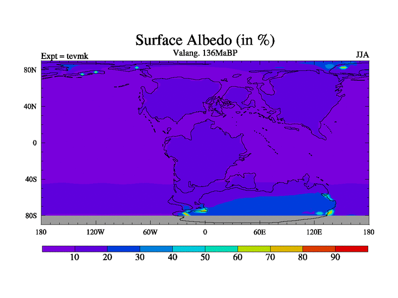 This is a Valanginian simulation with new control palaeogeog, 3xco2 and with appropriate reduction in solar constant. It is also using the newer ozone mod which better represents the effects of stratospheric ozone. It does include the ocean stream function.