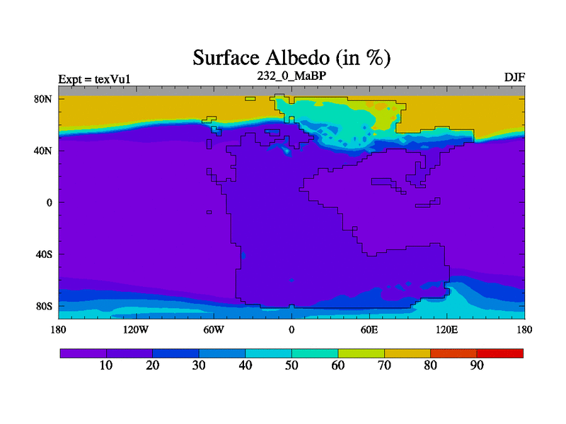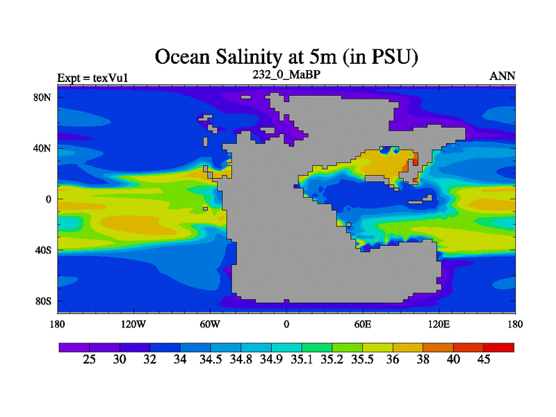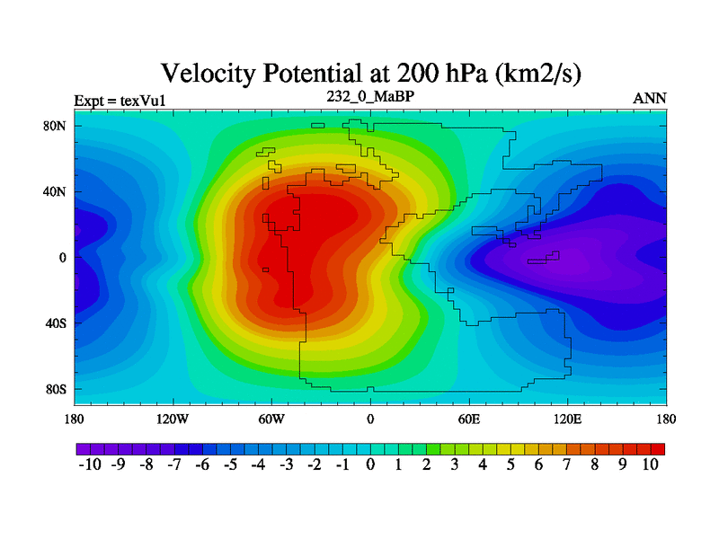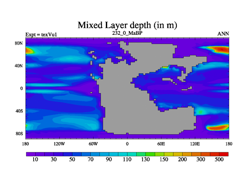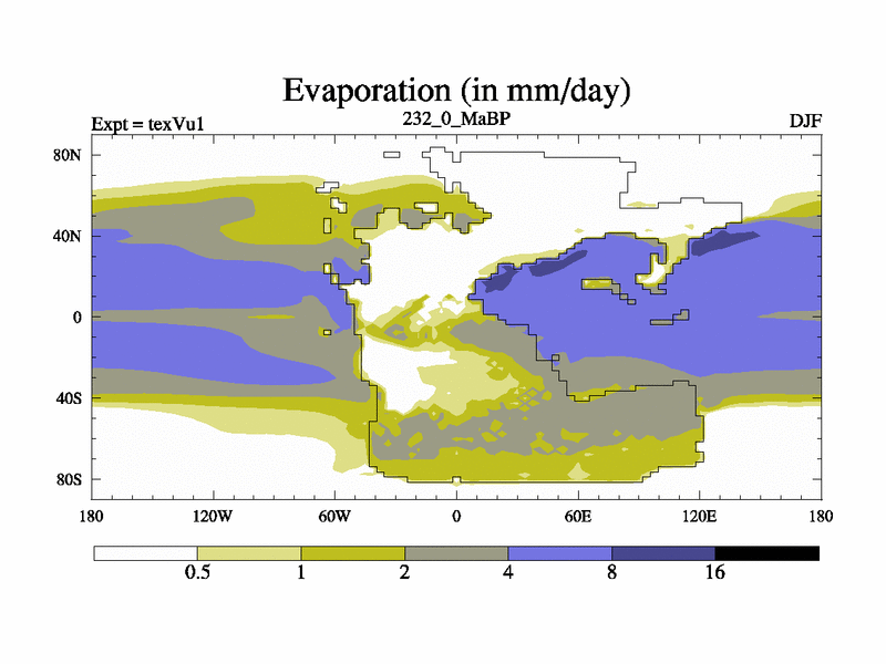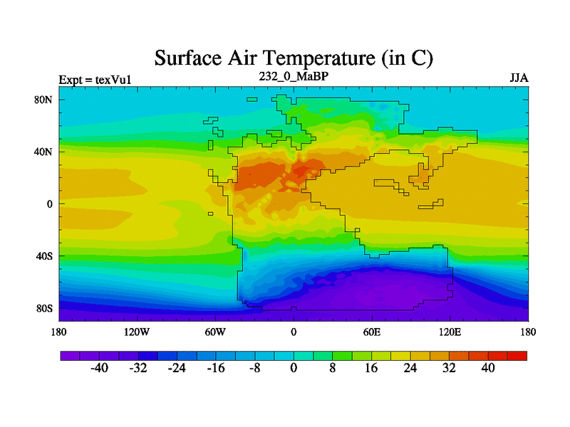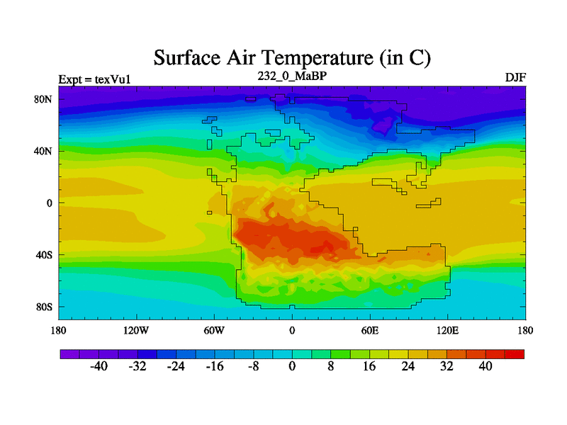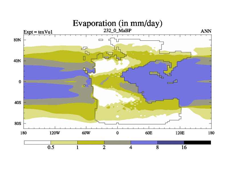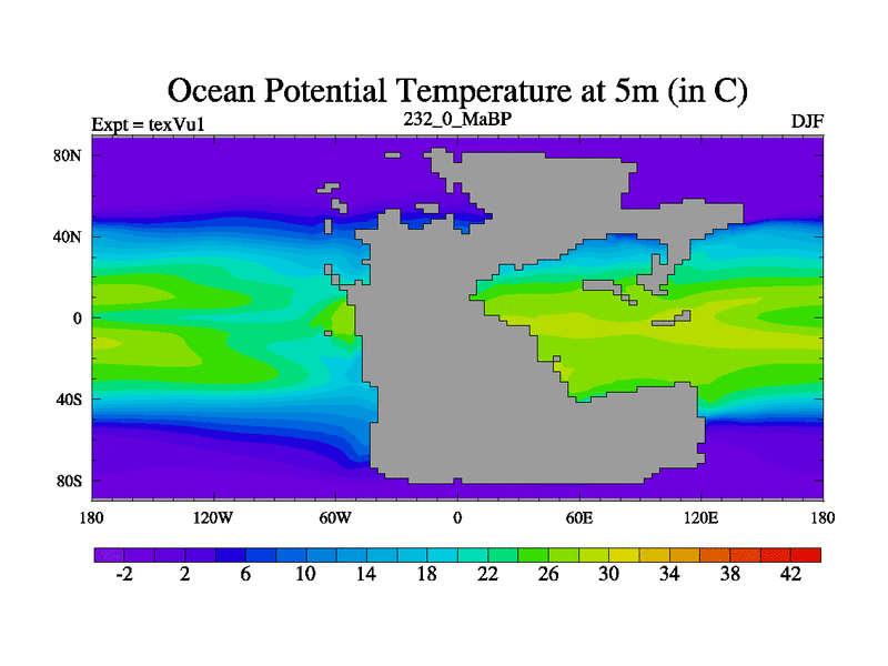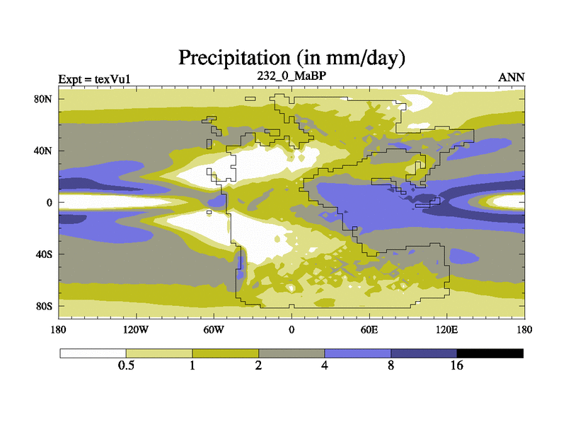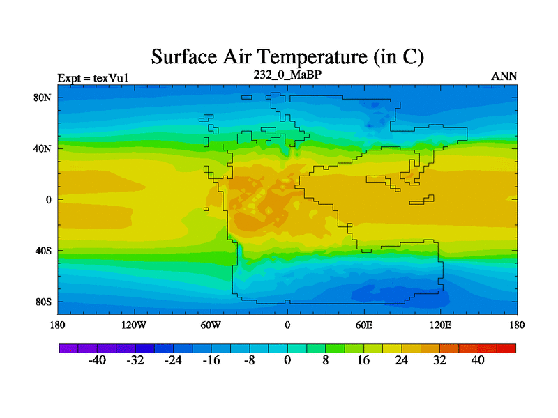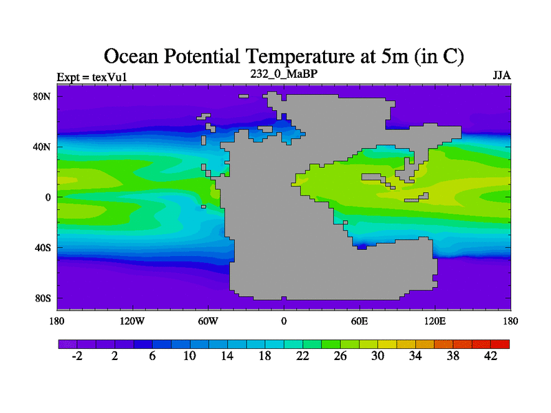 This is the 232.0 Ma simulation using the Scotese palaeogeographies.