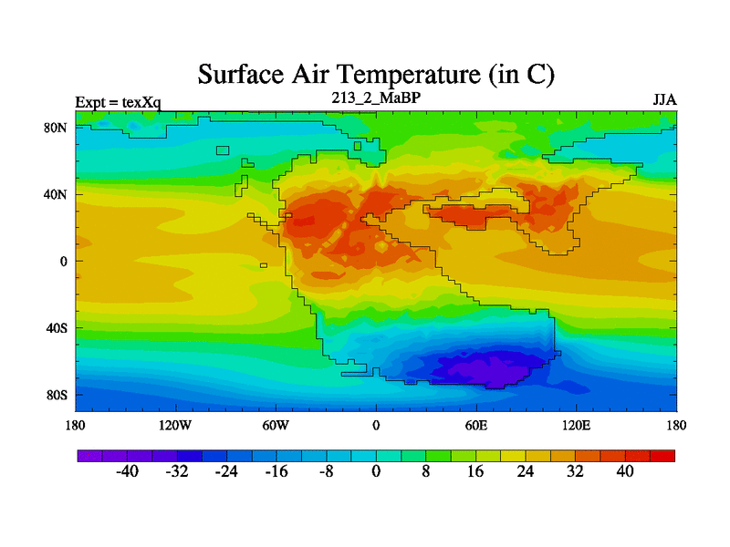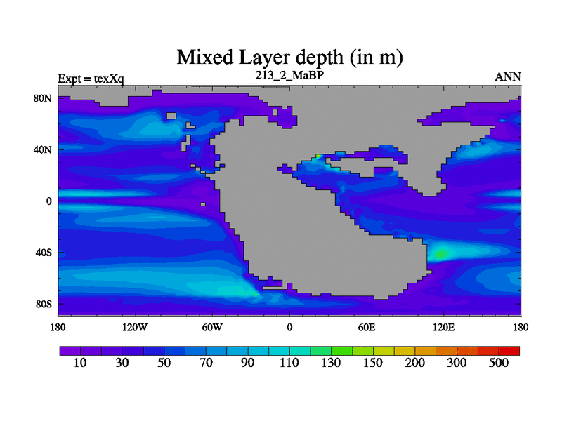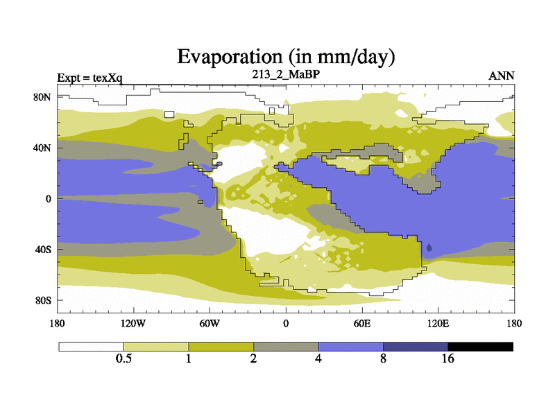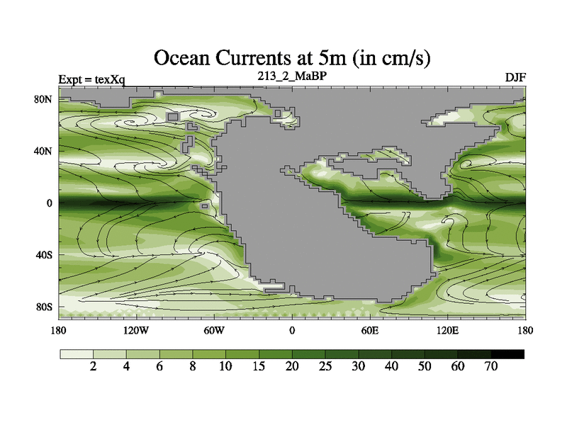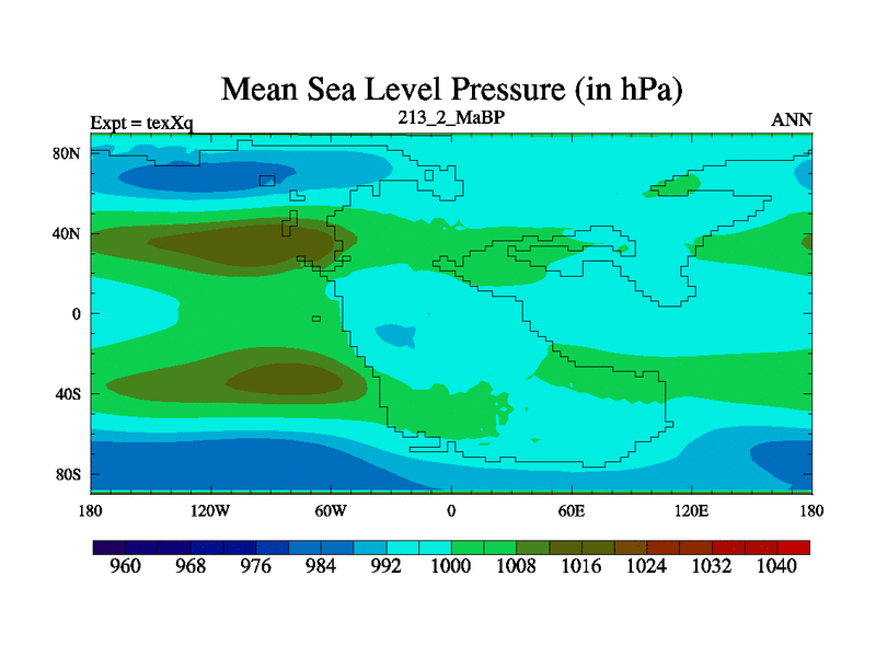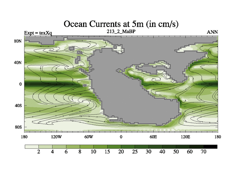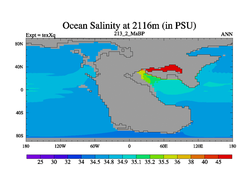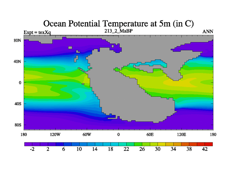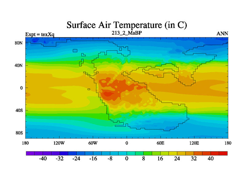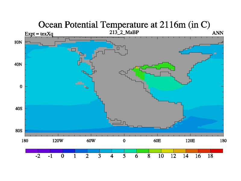 This is the 213.2 Ma simulation using the Scotese palaeogeographies.