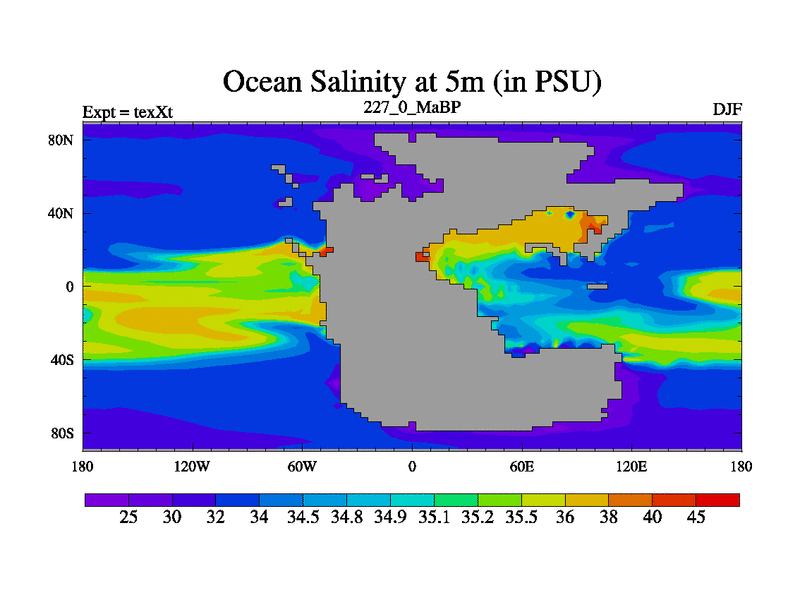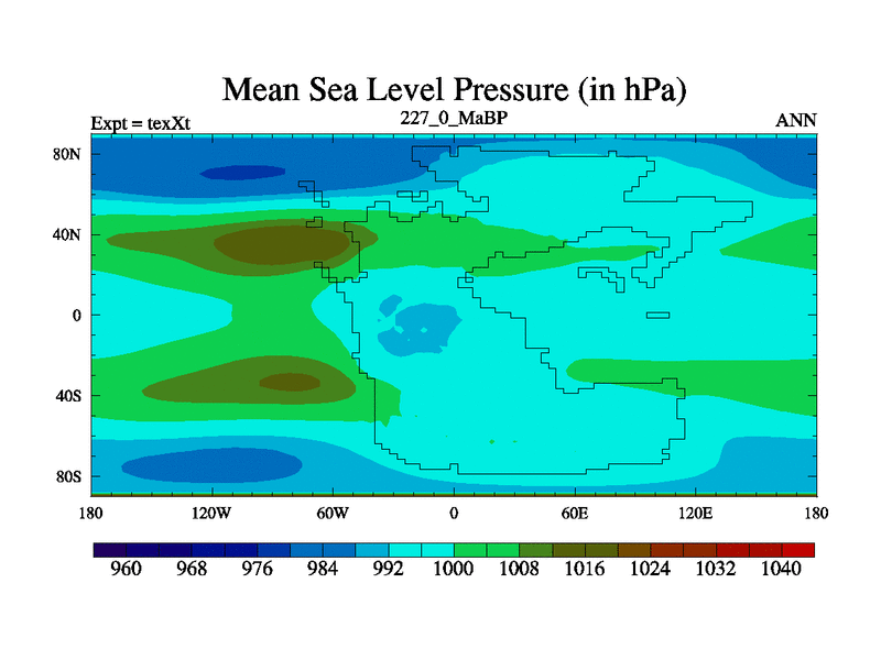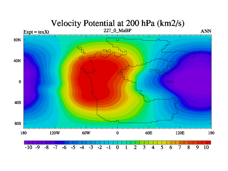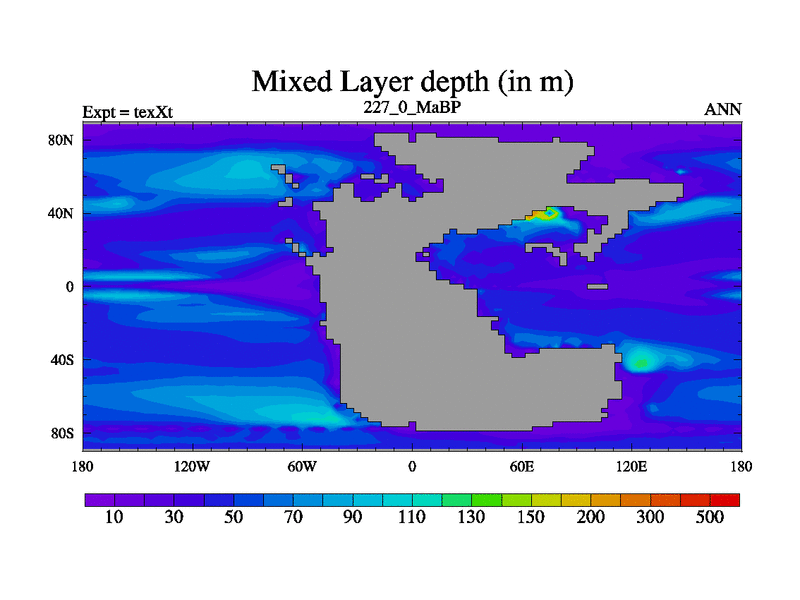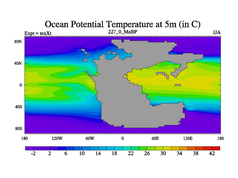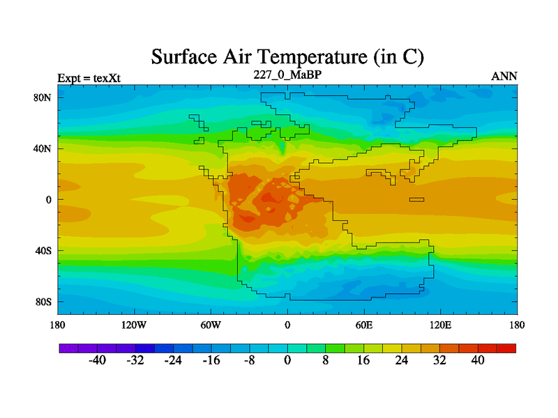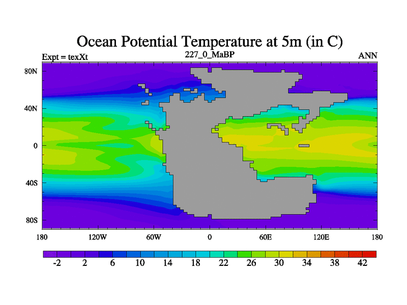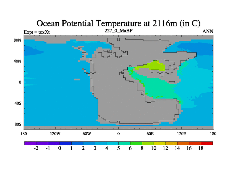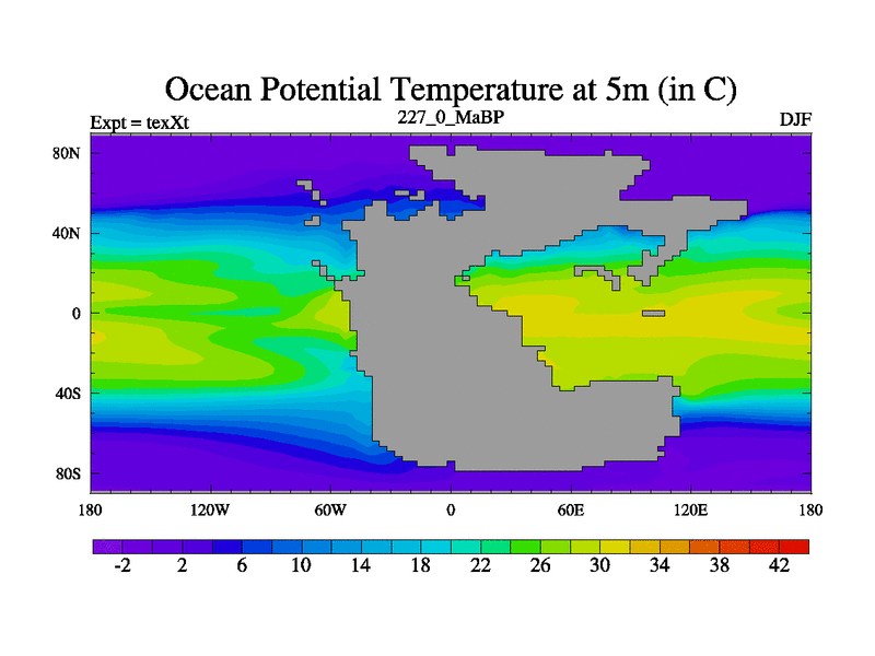 This is the 227.0 Ma simulation using the Scotese palaeogeographies.