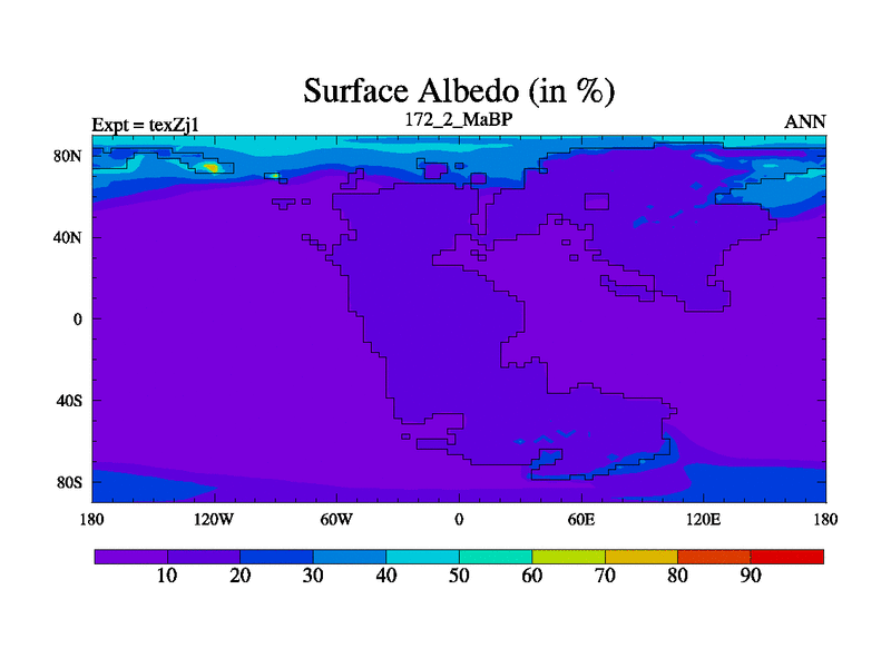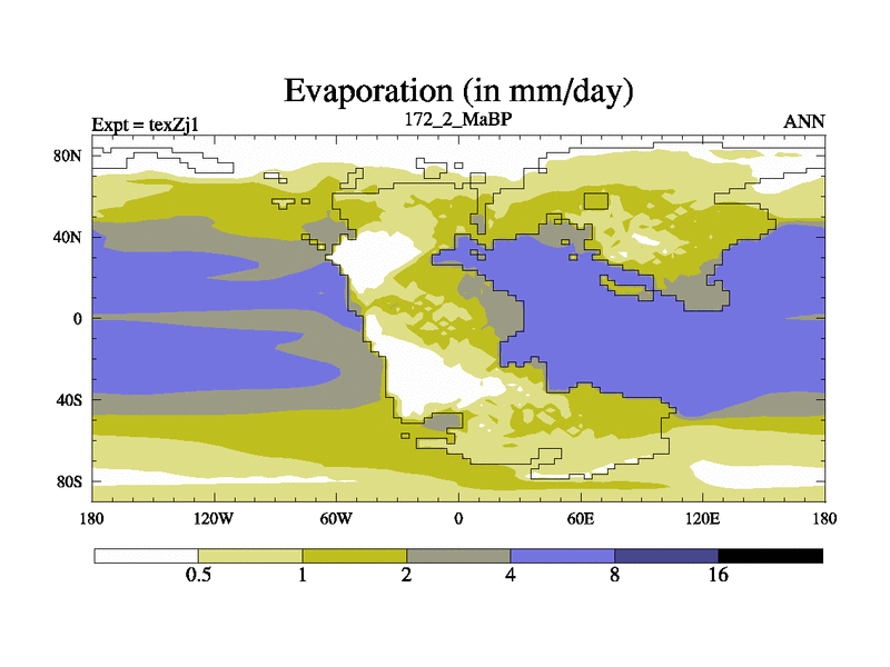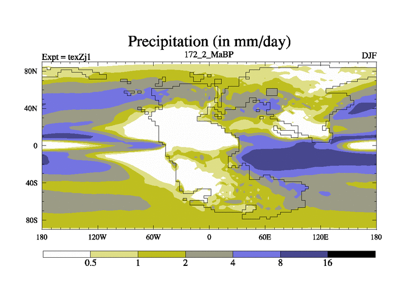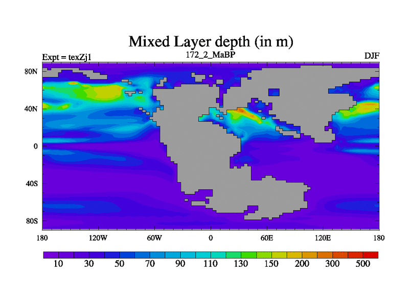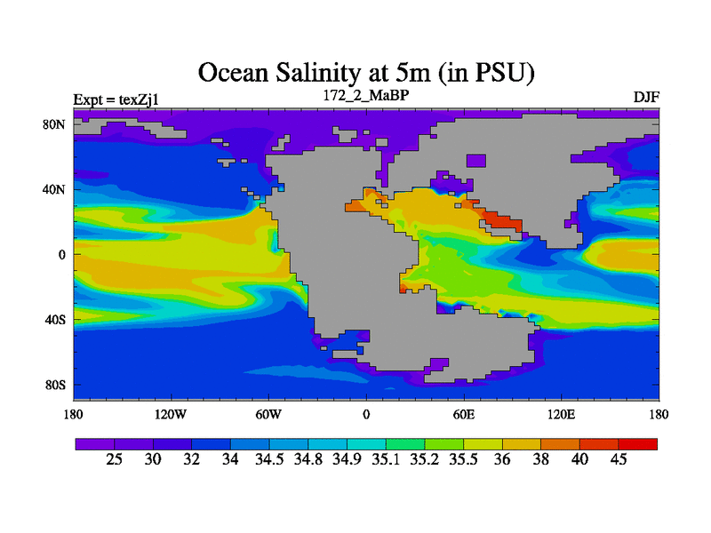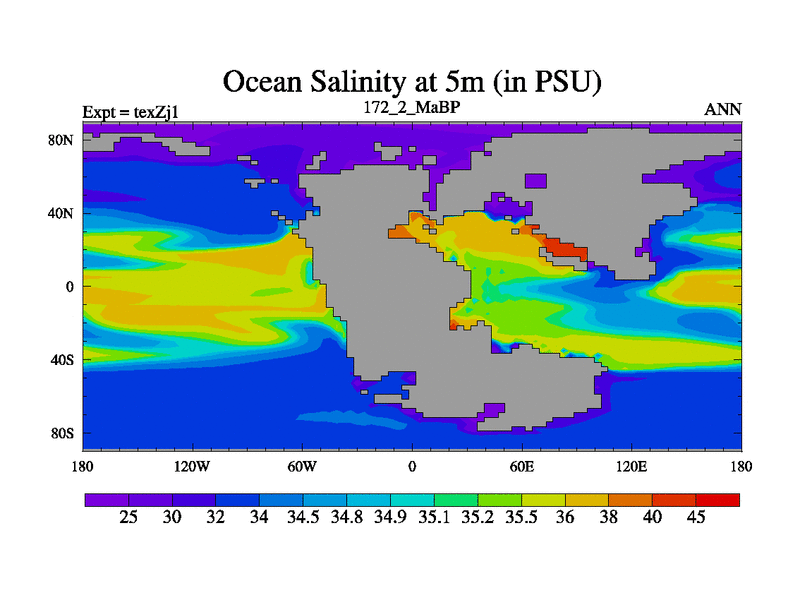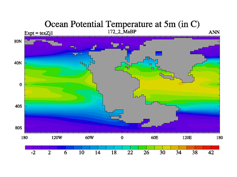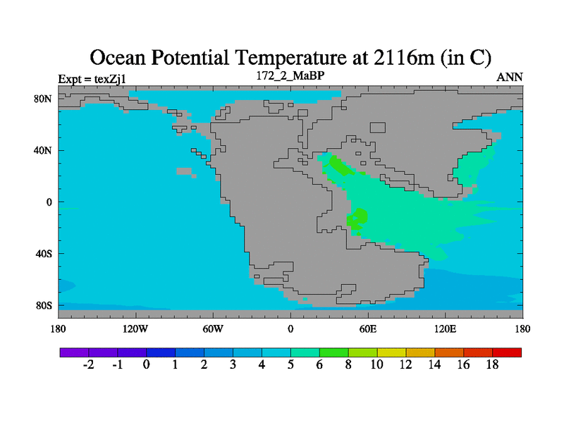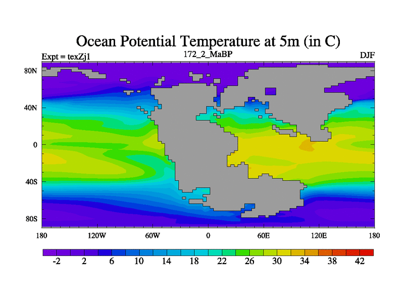 This is the 172.2 Ma simulation using the Scotese palaeogeographies. Extension of the tex[f..j] series.