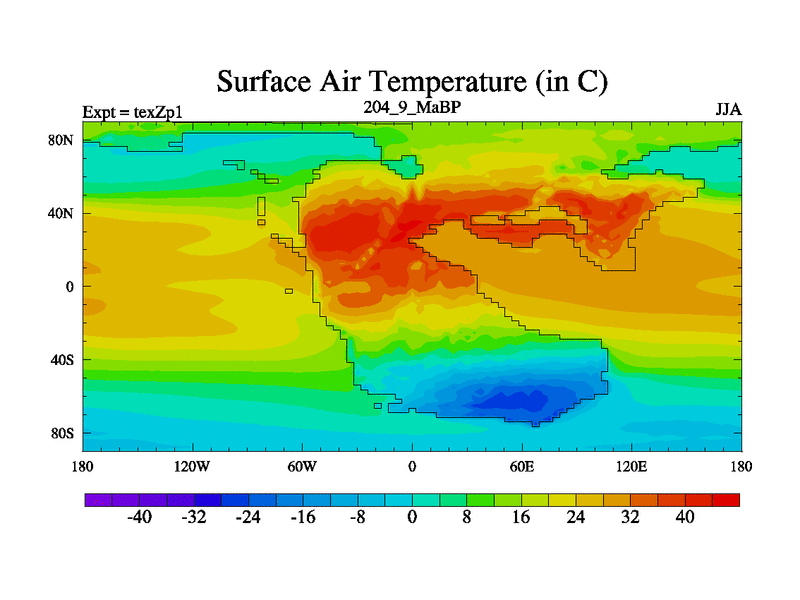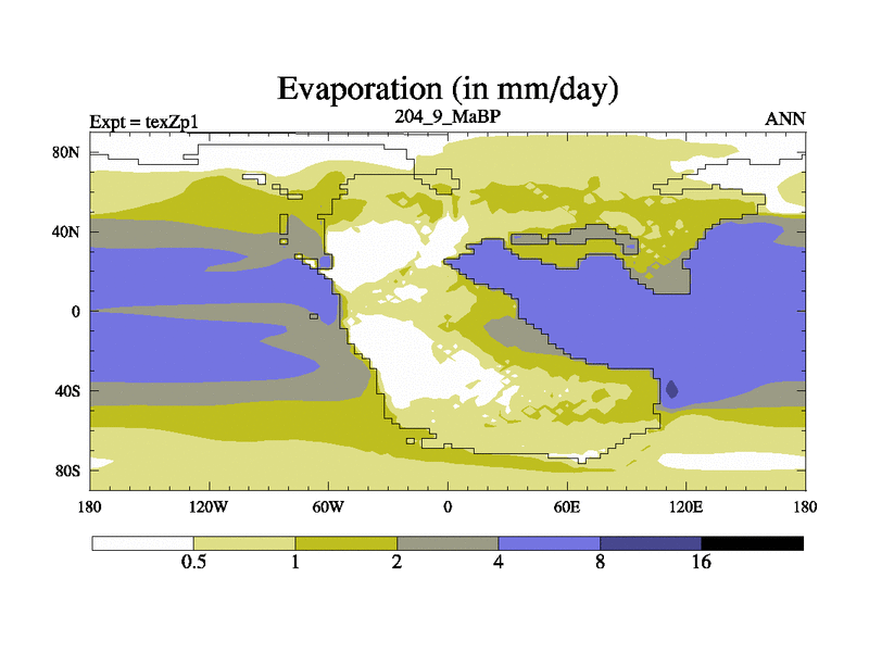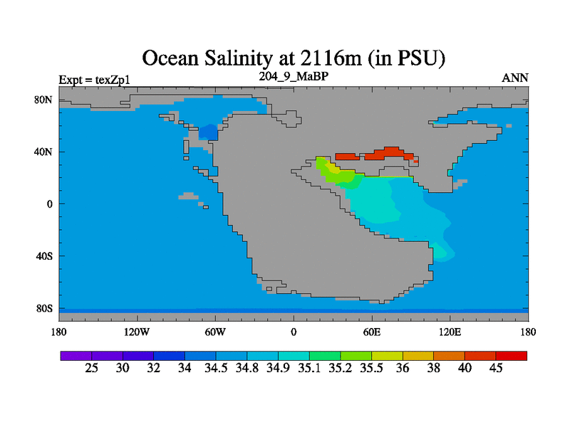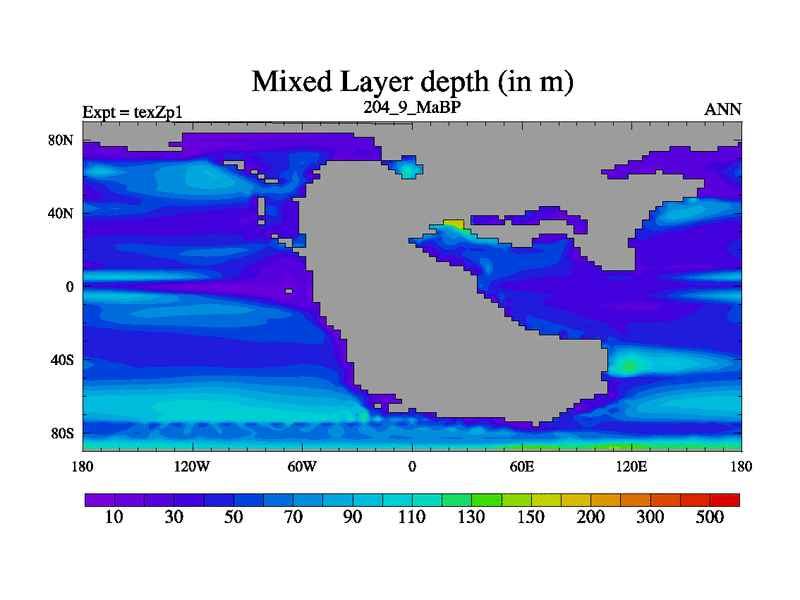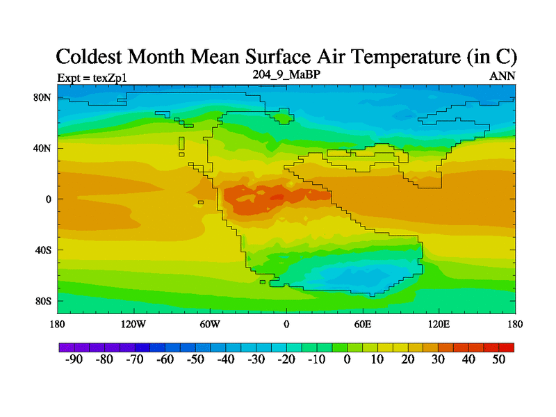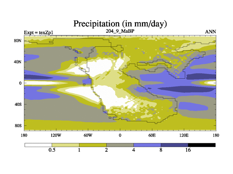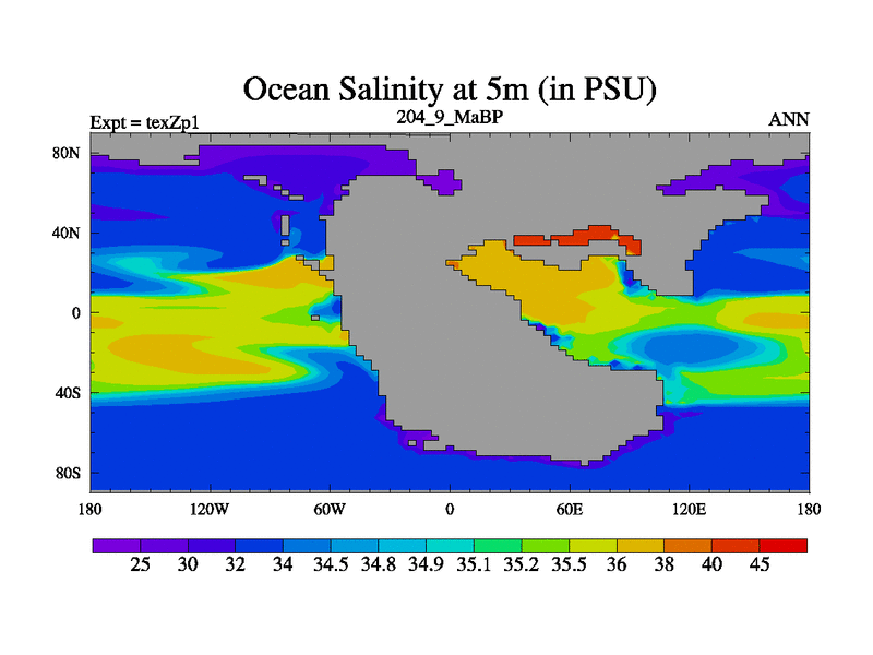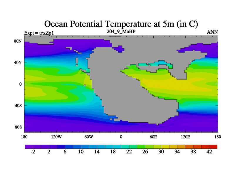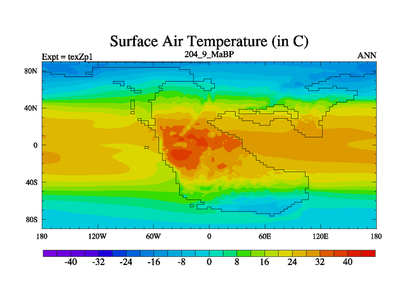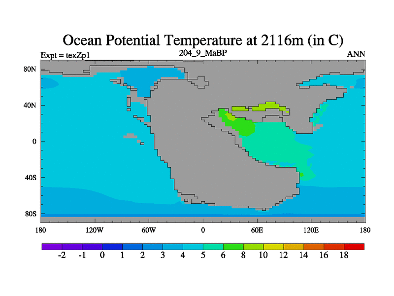 This is the 204.9 Ma simulation using the Scotese palaeogeographies. Extension of the tex[f..j] series.