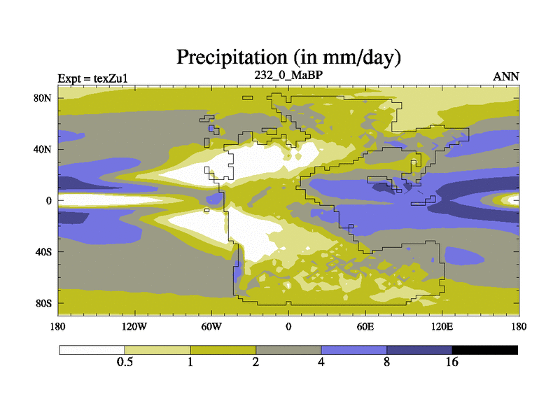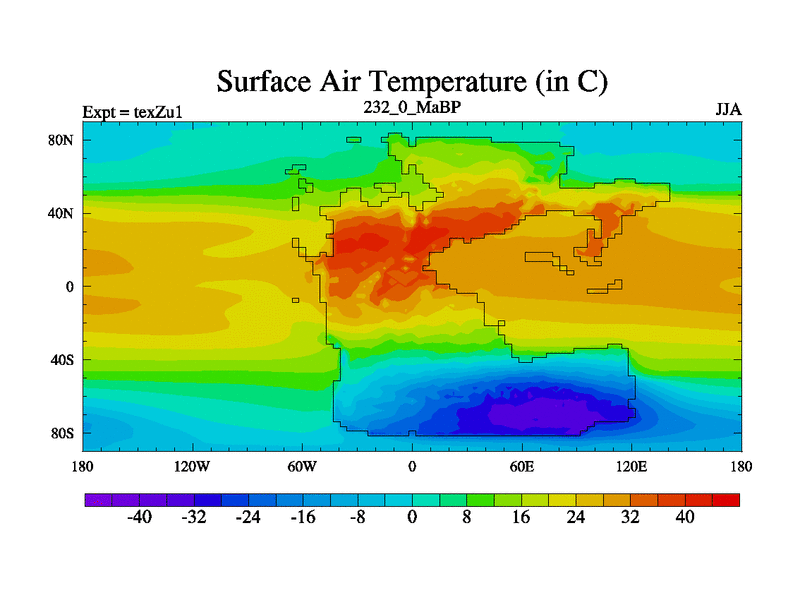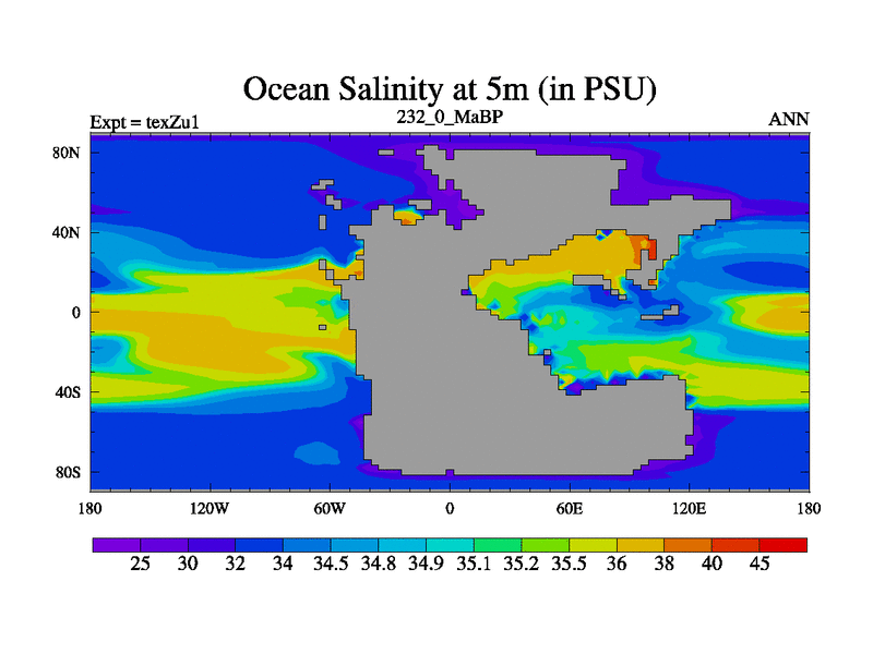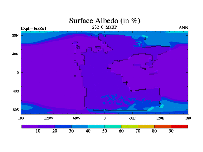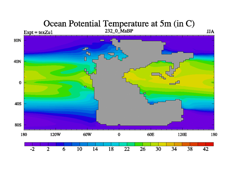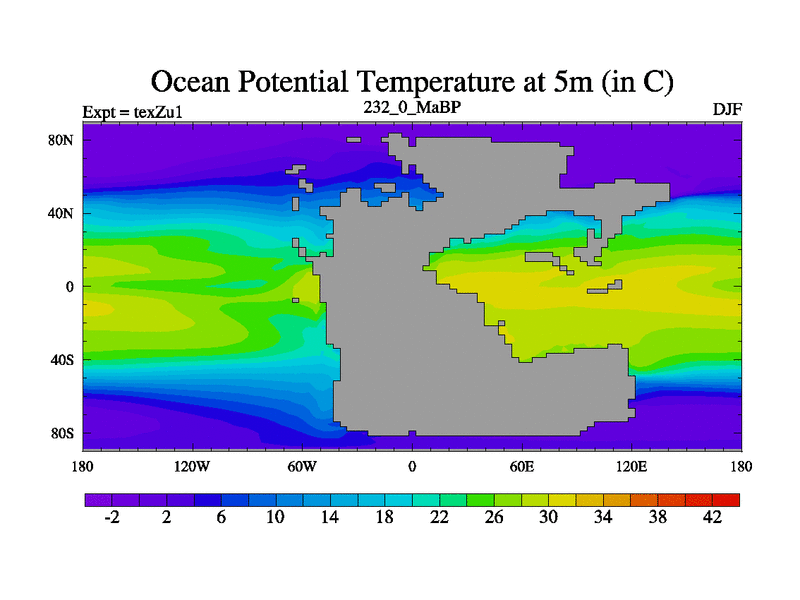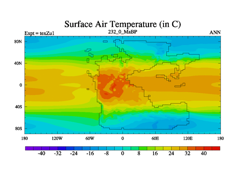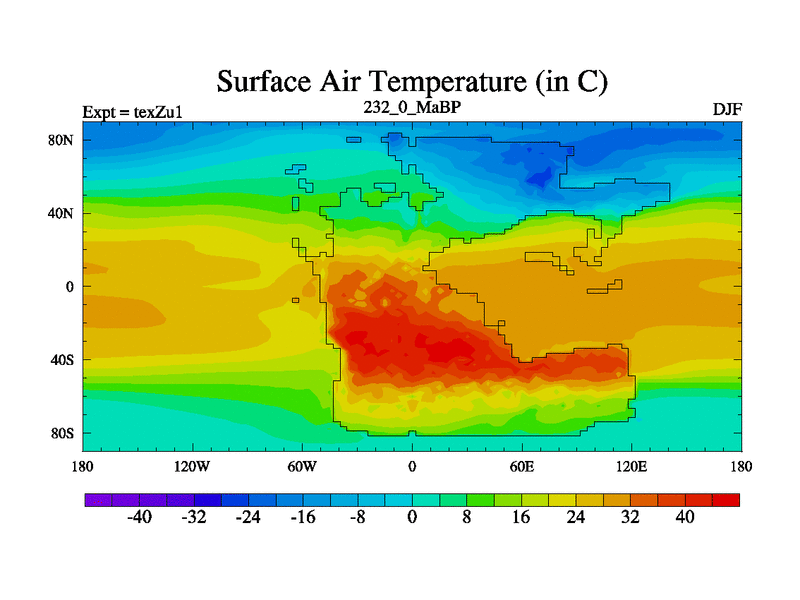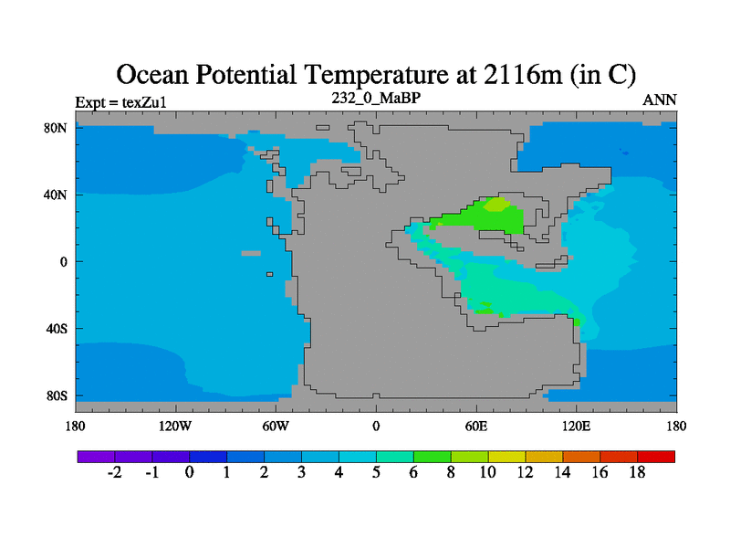 This is the 232.0 Ma simulation using the Scotese palaeogeographies. Extension of the tex[f..j] series.
