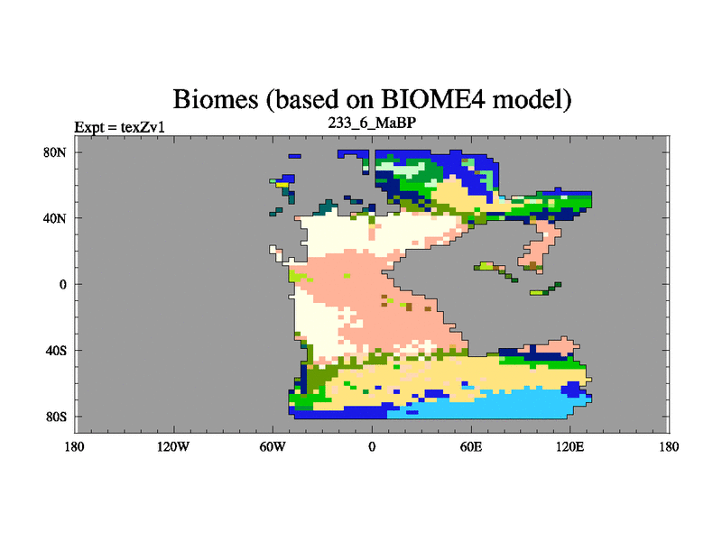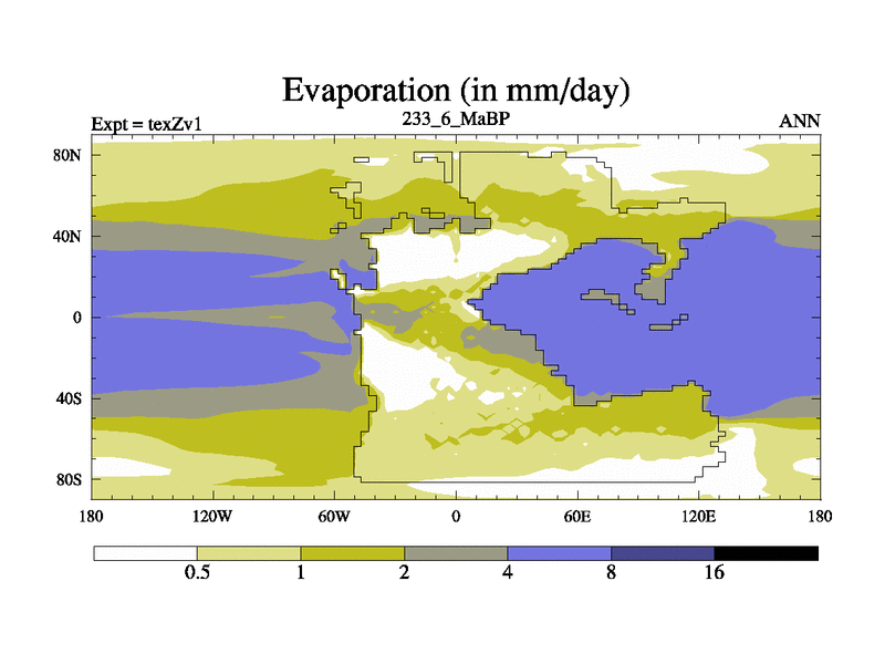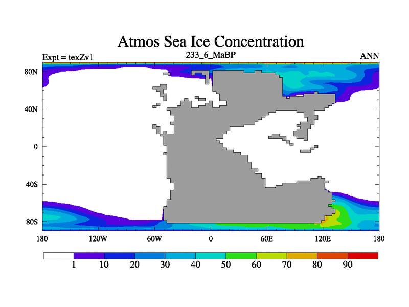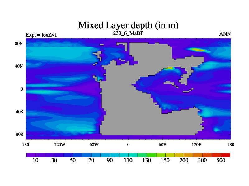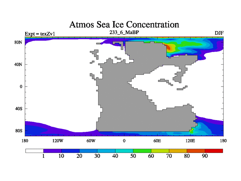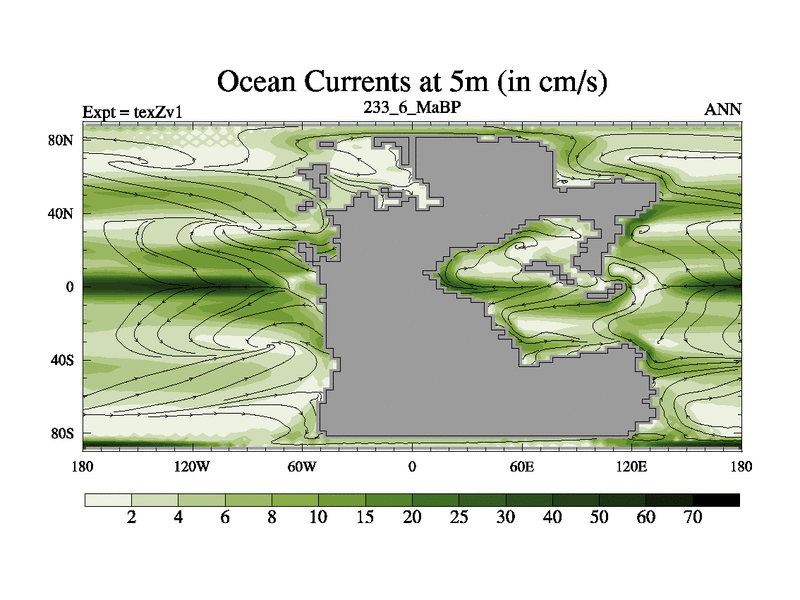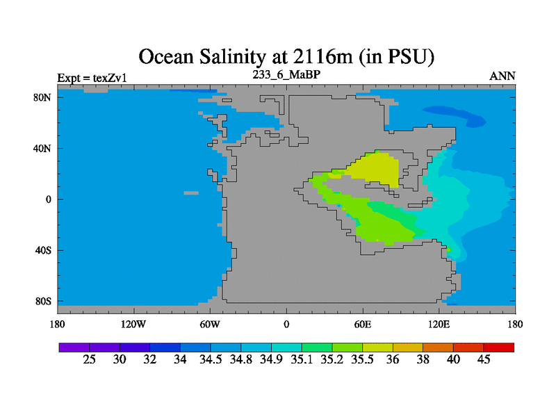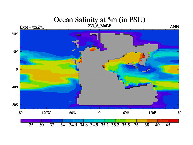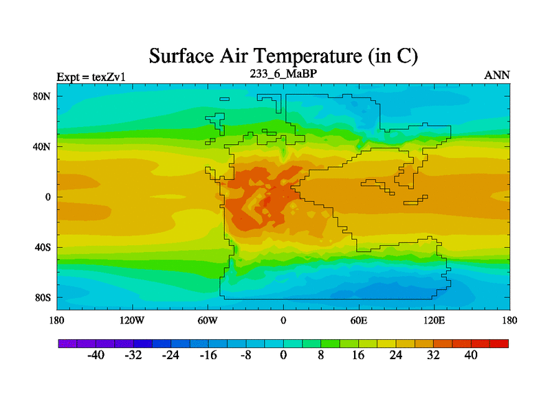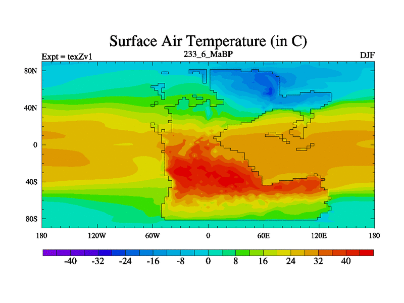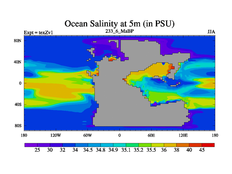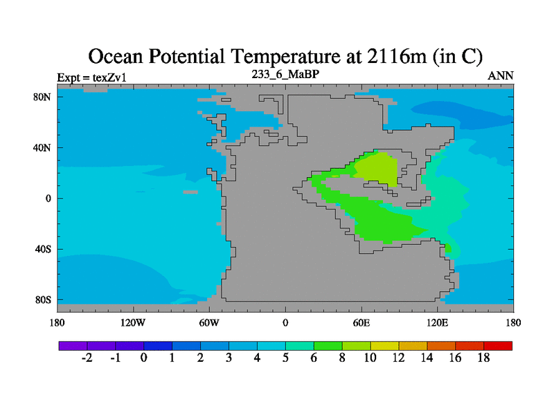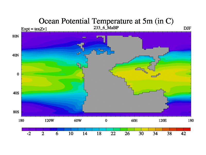 This is the 233.6 Ma simulation using the Scotese palaeogeographies. Extension of the tex[f..j] series.