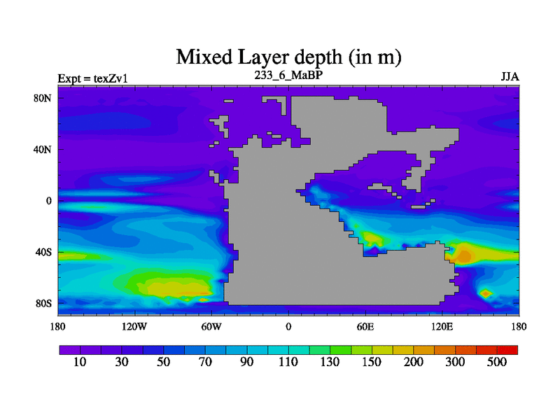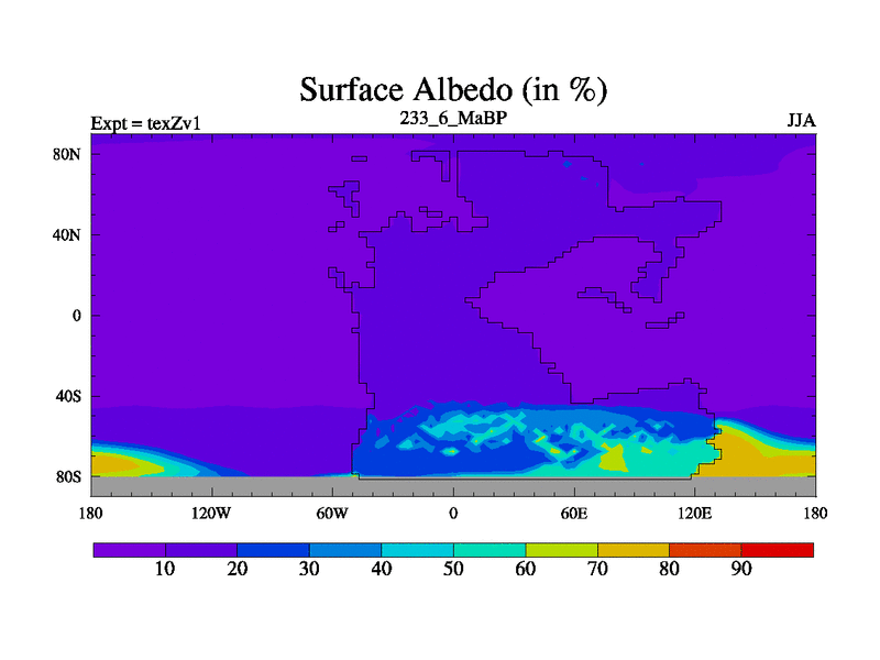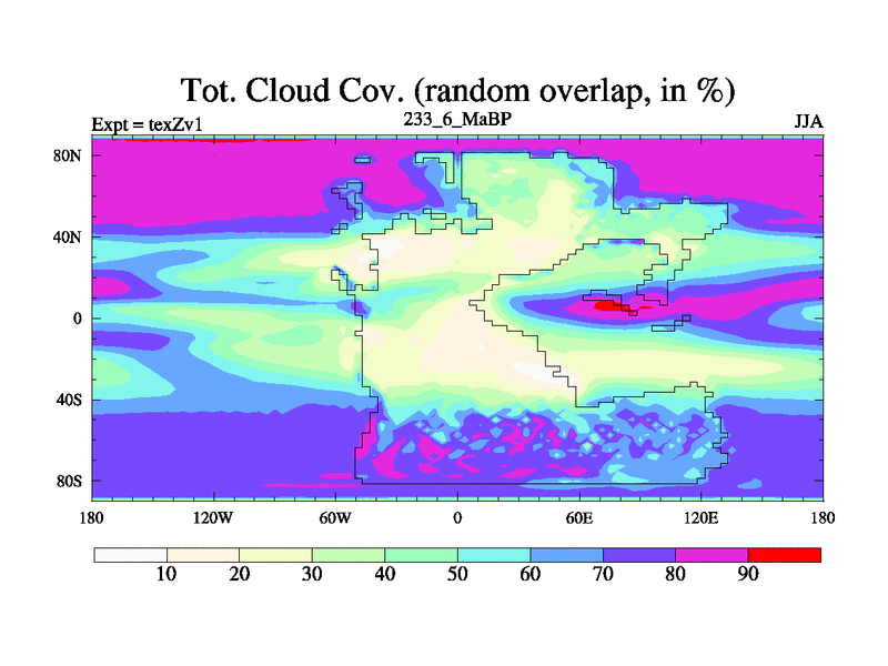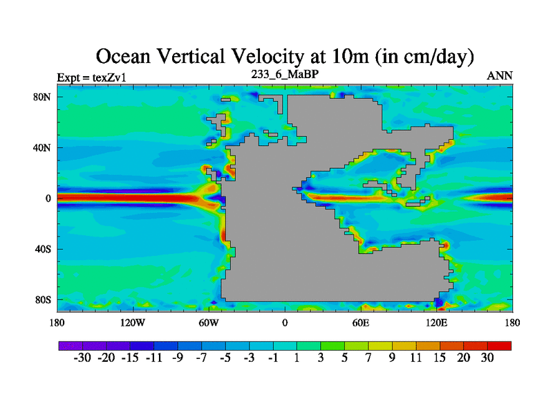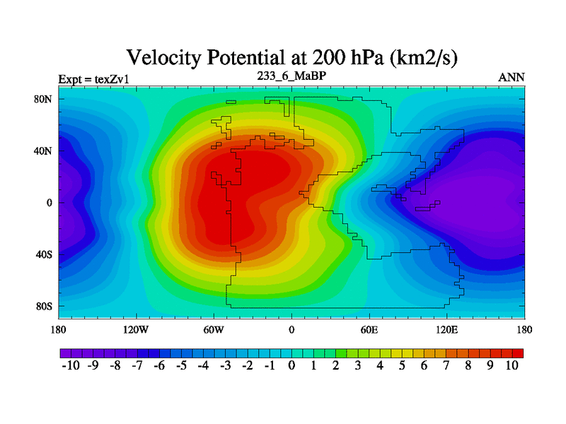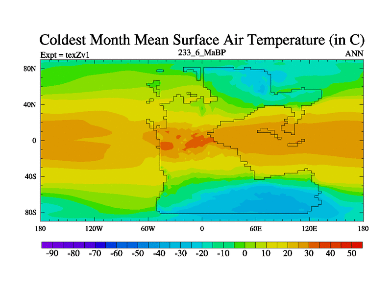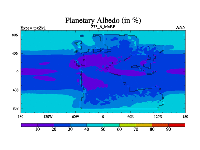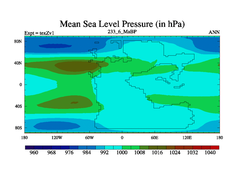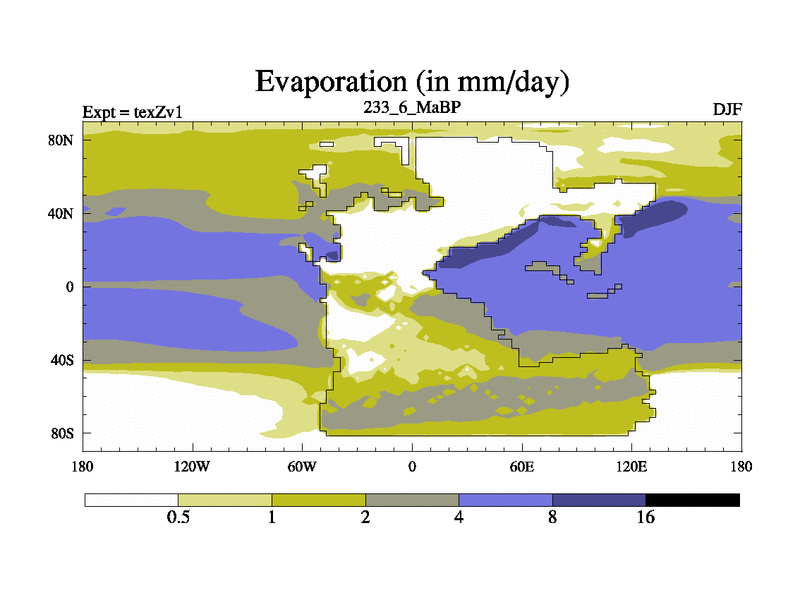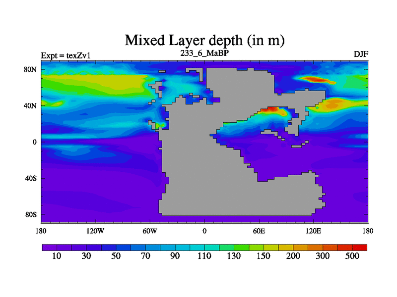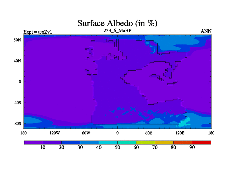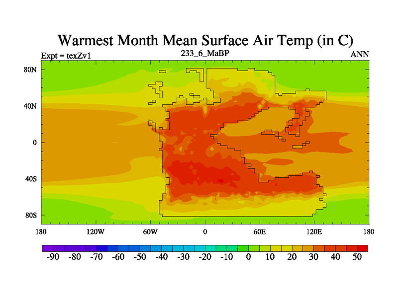 This is the 233.6 Ma simulation using the Scotese palaeogeographies. Extension of the tex[f..j] series.