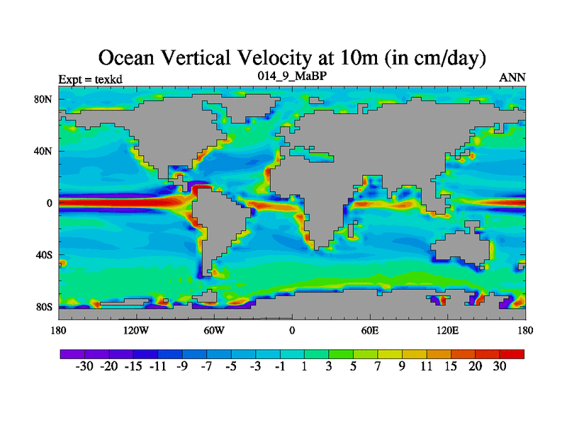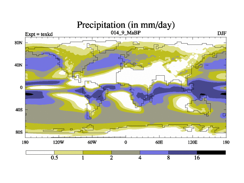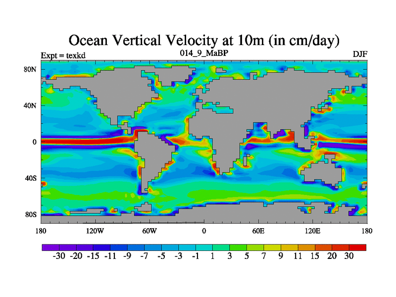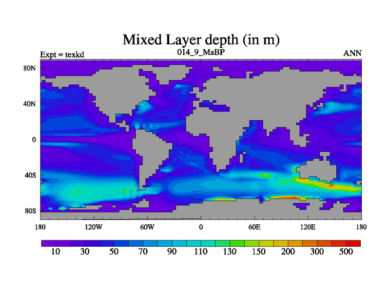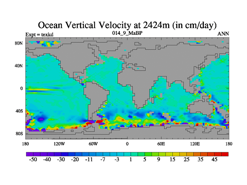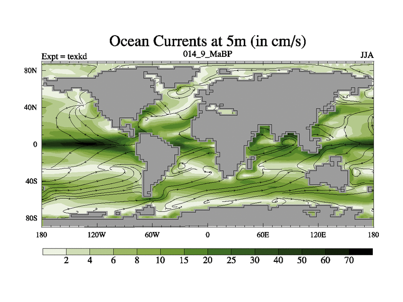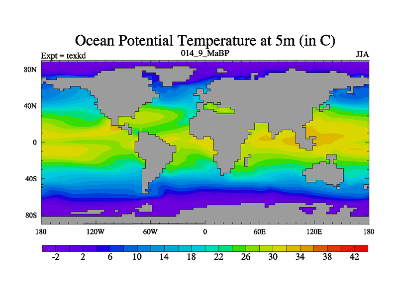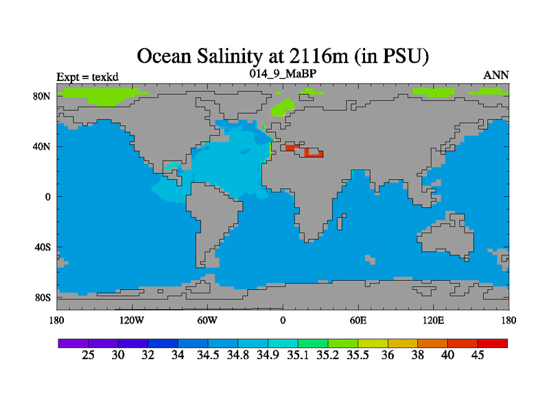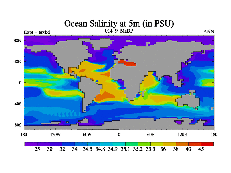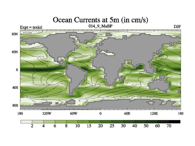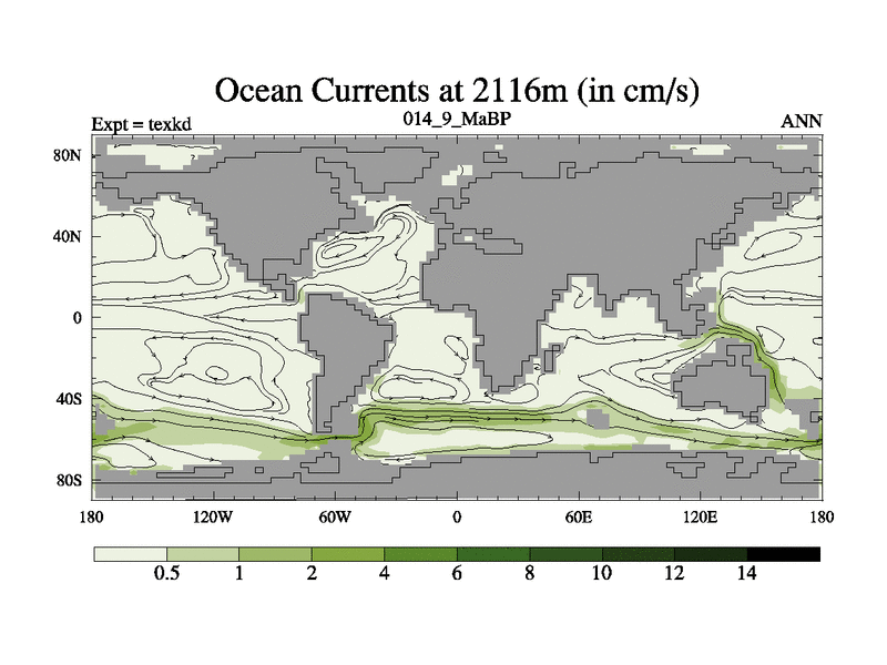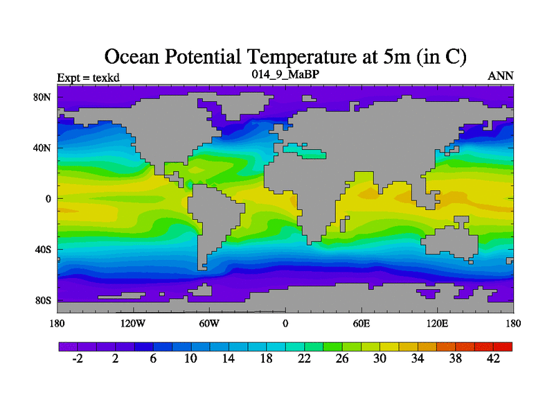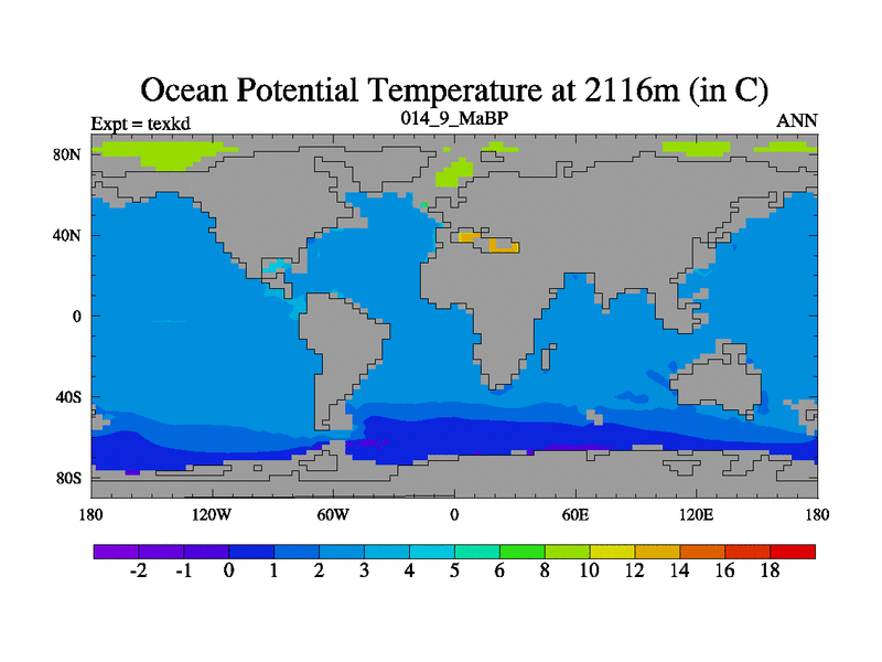 This is the 14.9 Ma simulation using the Scotese palaeogeographies. High output extension of the 5000 year spinup.