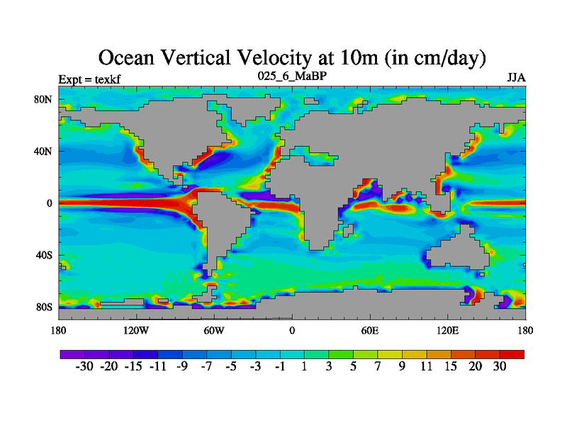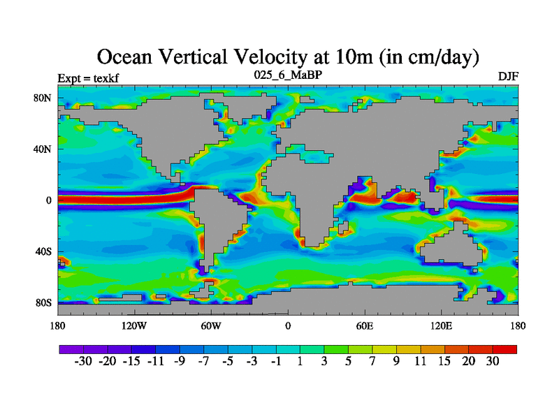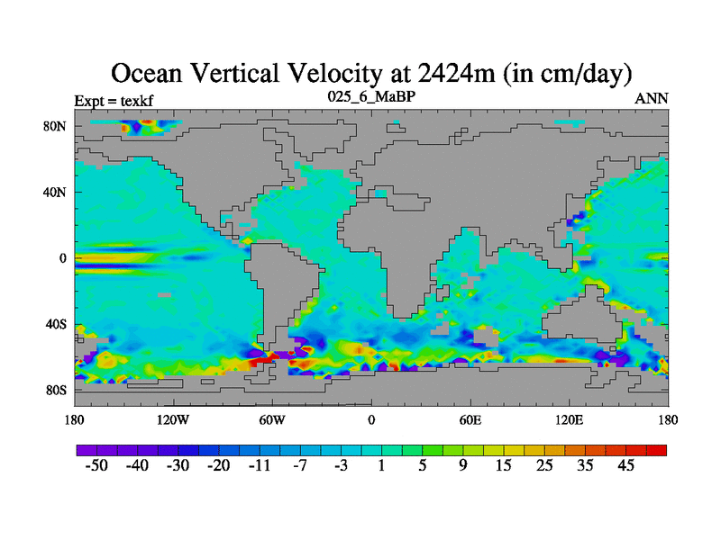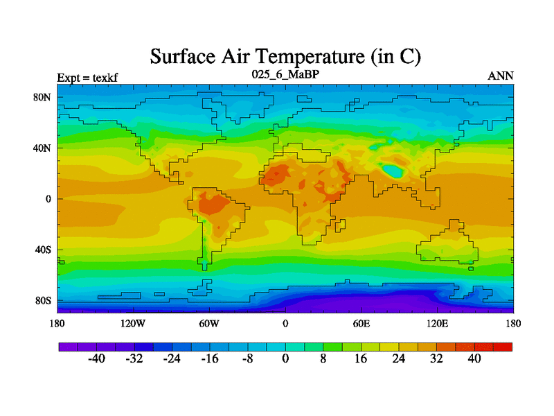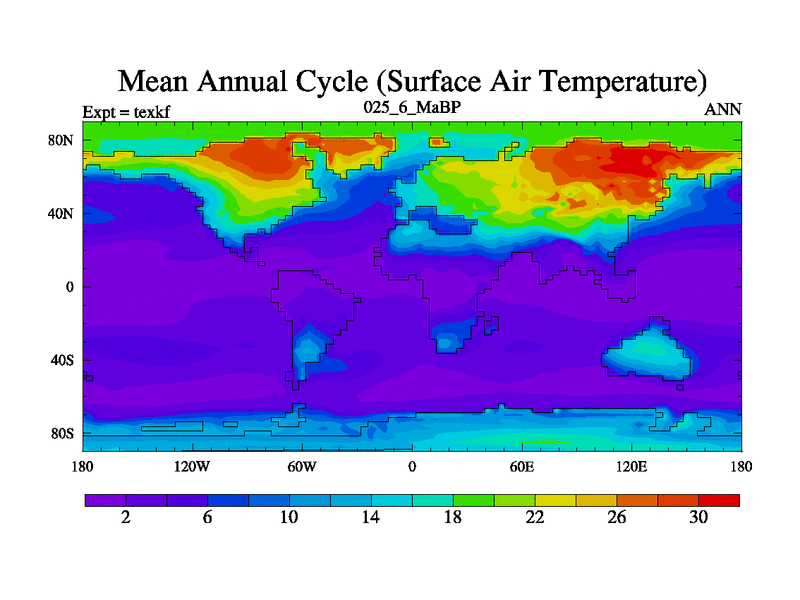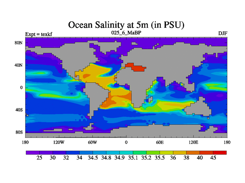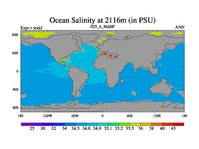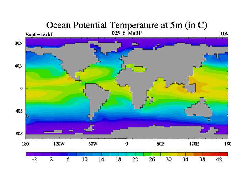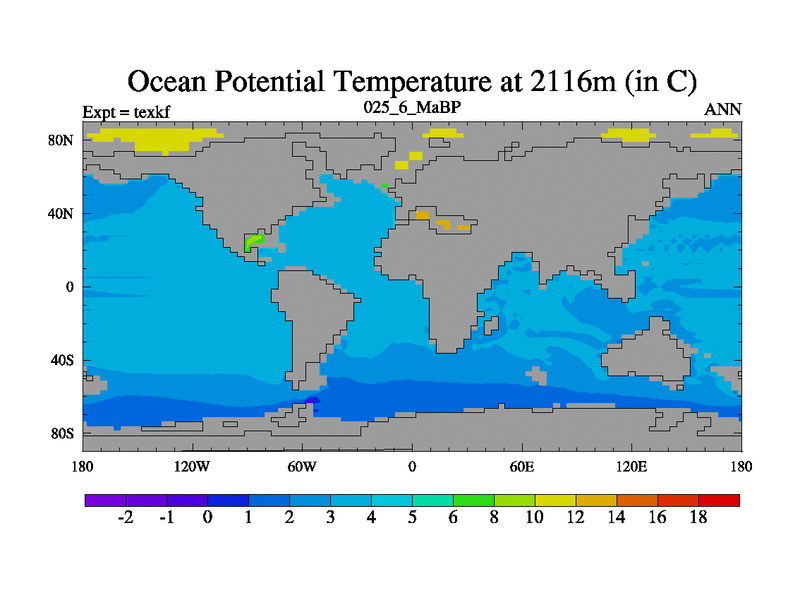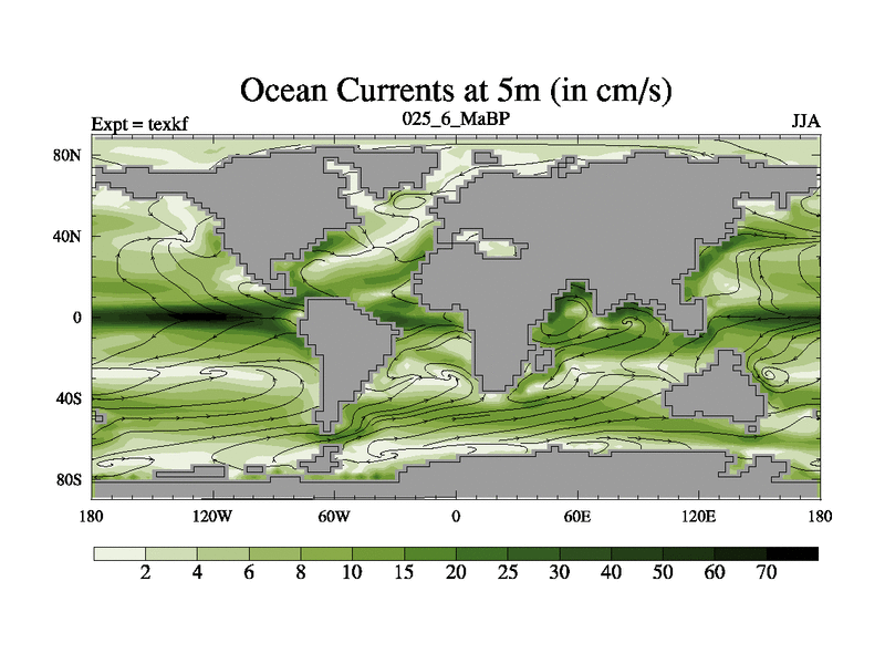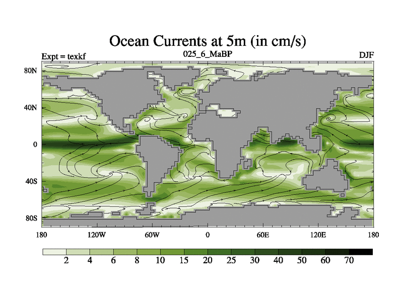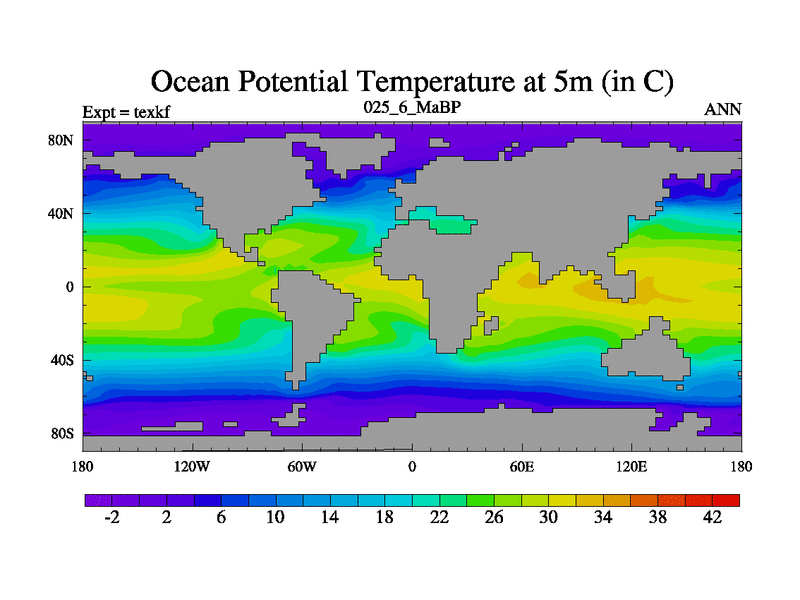 This is the 25.6 Ma simulation using the Scotese palaeogeographies. High output extension of the 5000 year spinup.