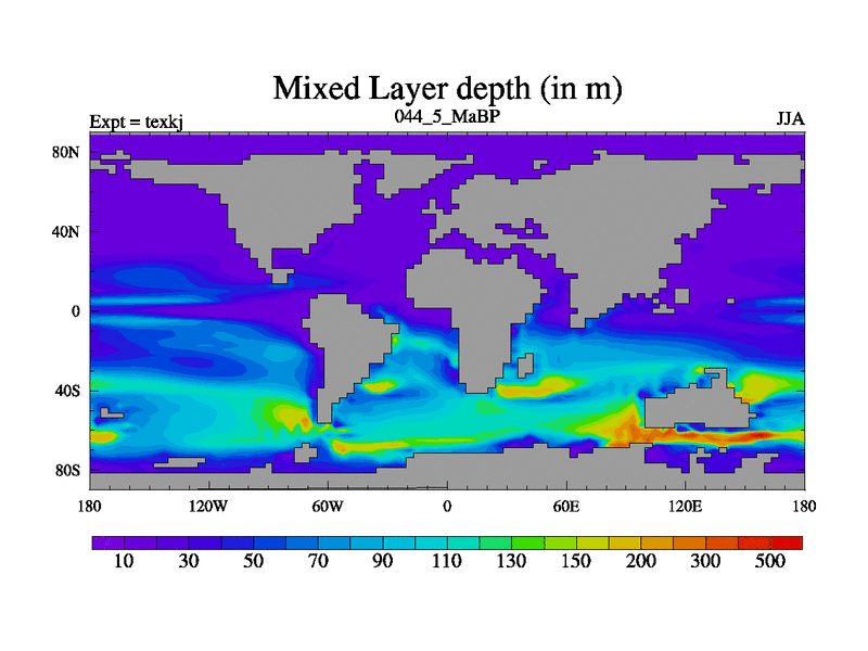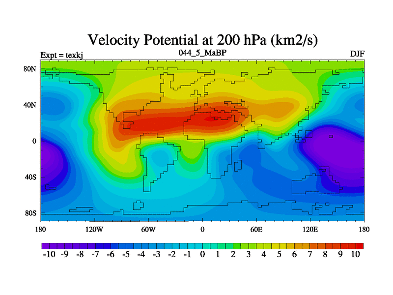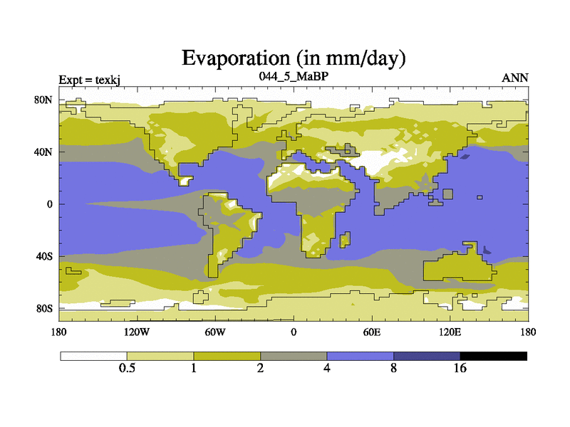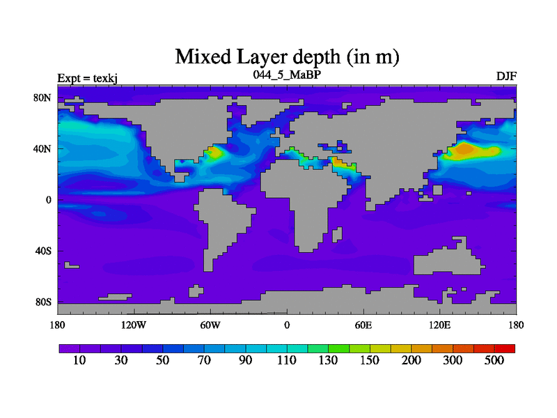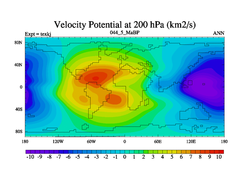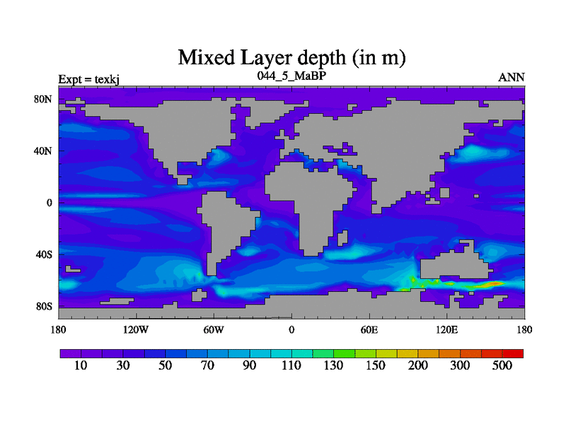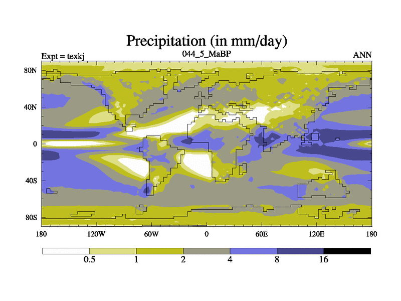 This is the 44.5 Ma simulation using the Scotese palaeogeographies. High output extension of the 5000 year spinup.