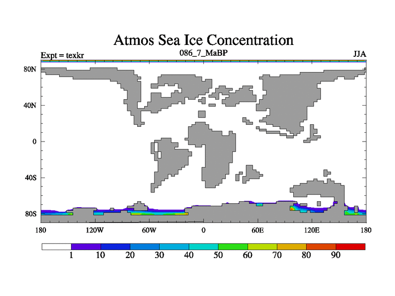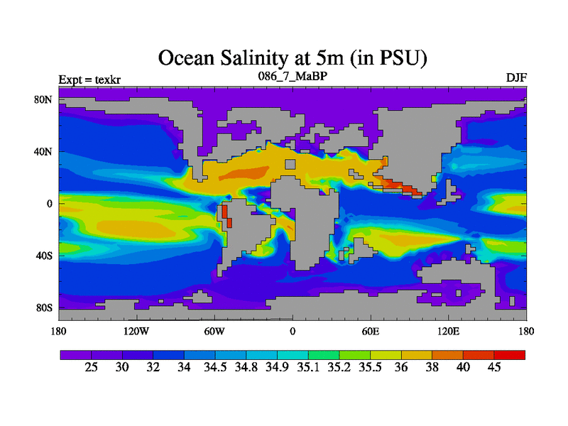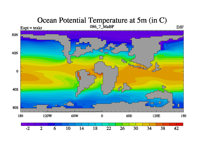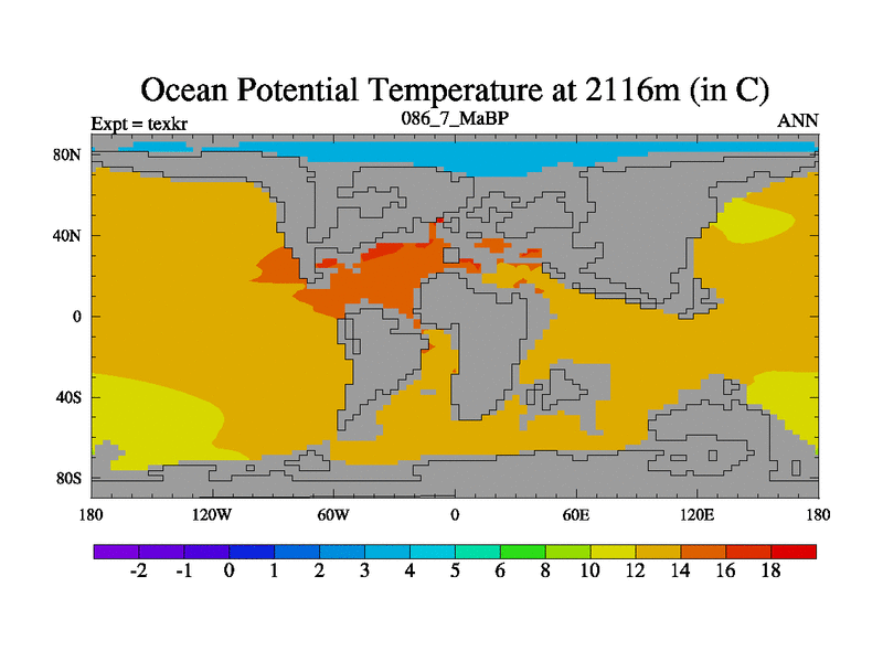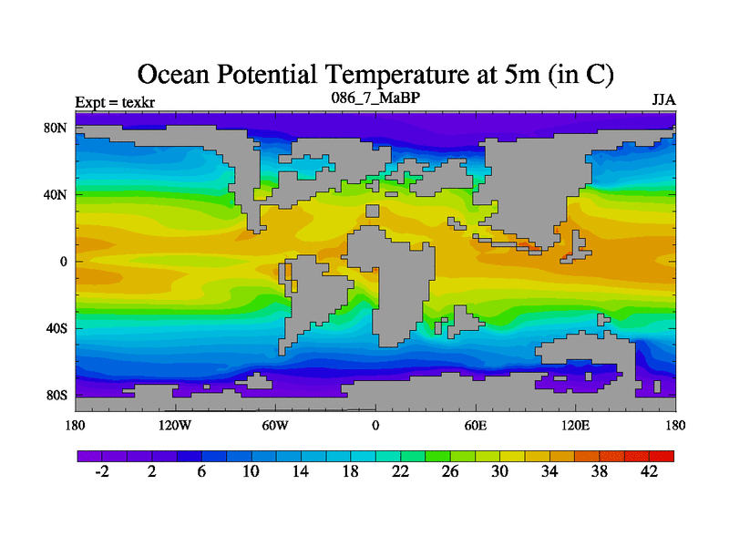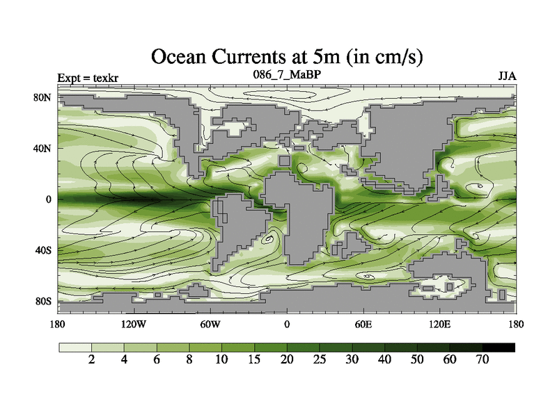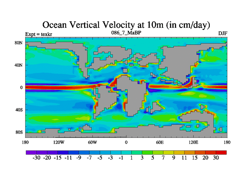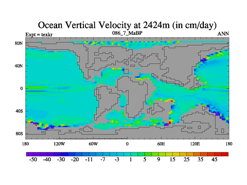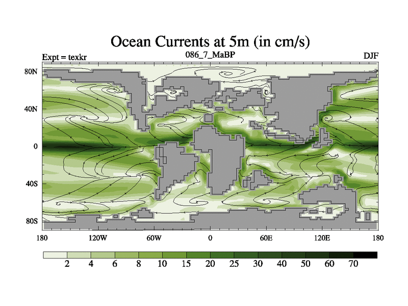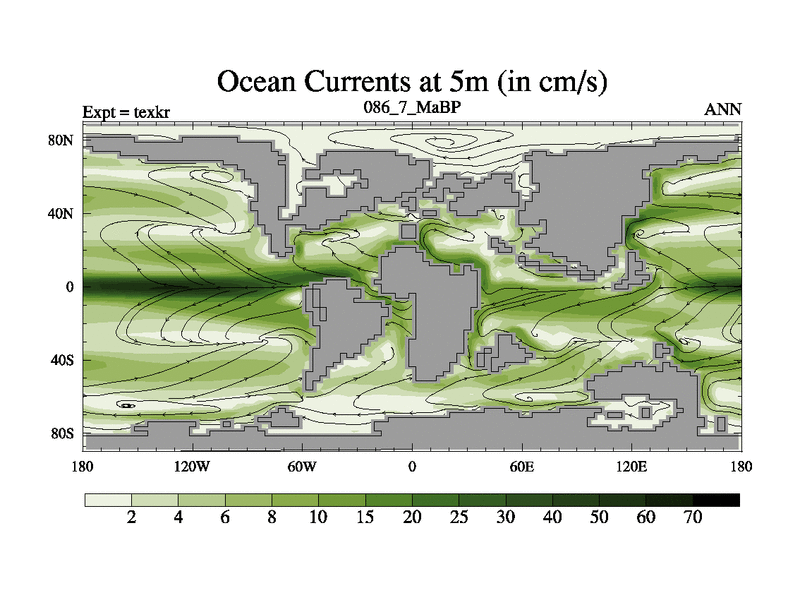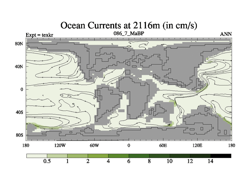 This is the 86.7 Ma simulation using the Scotese palaeogeographies. High output extension of the 5000 year spinup.