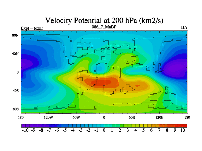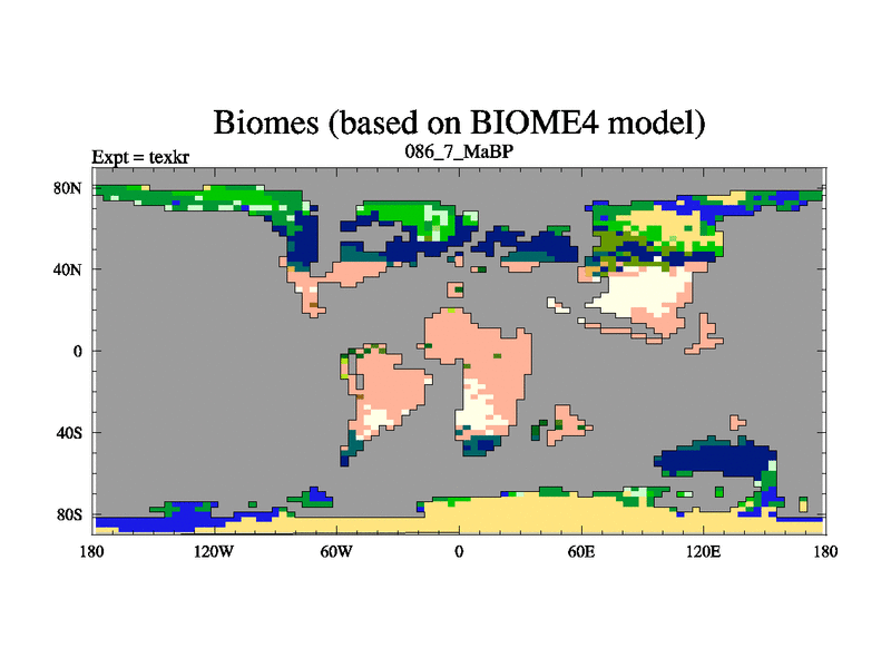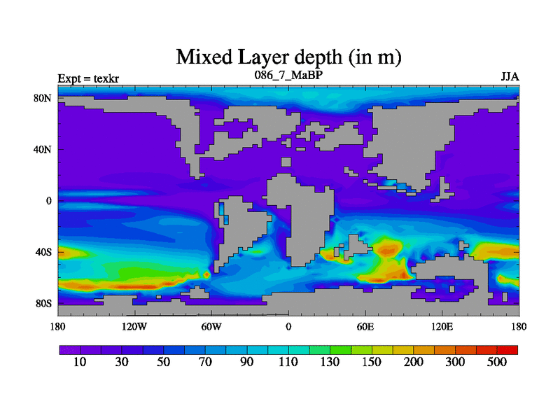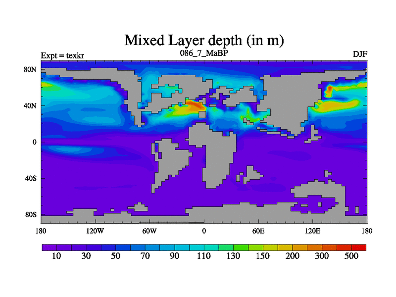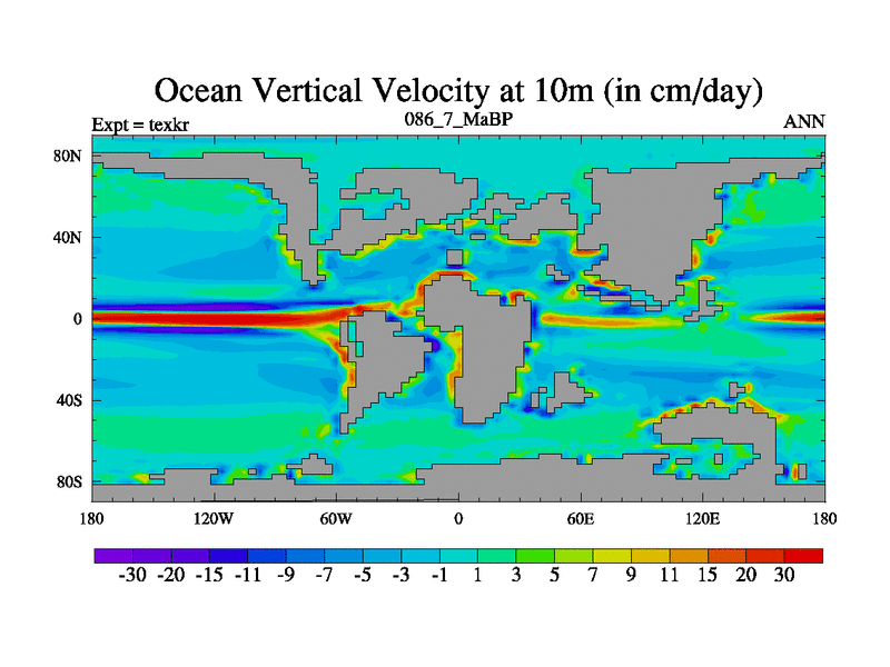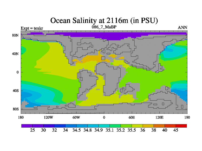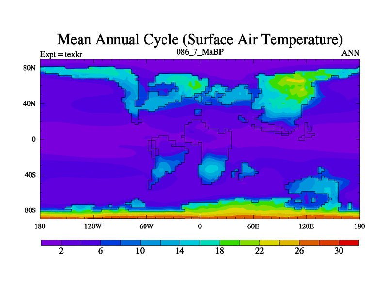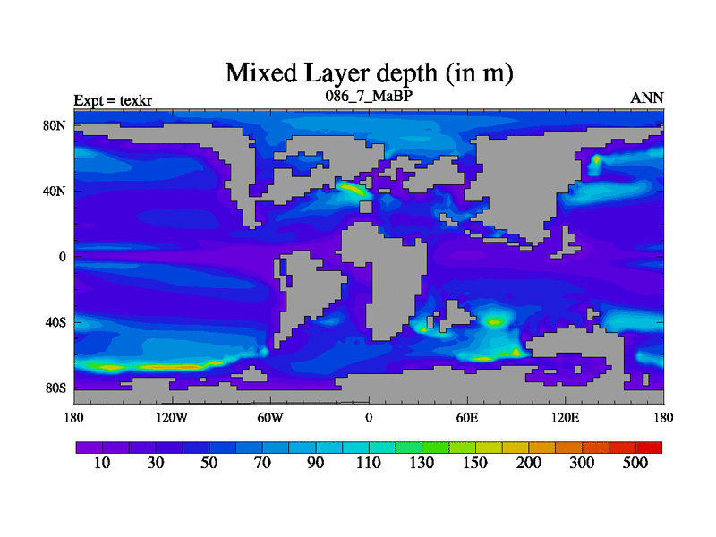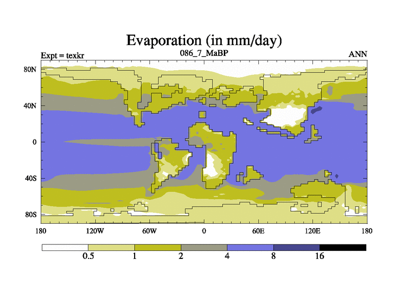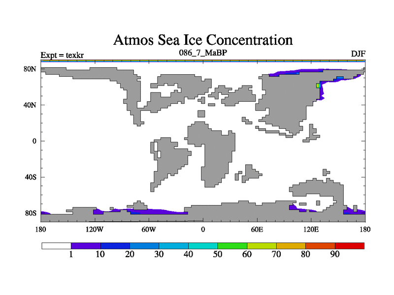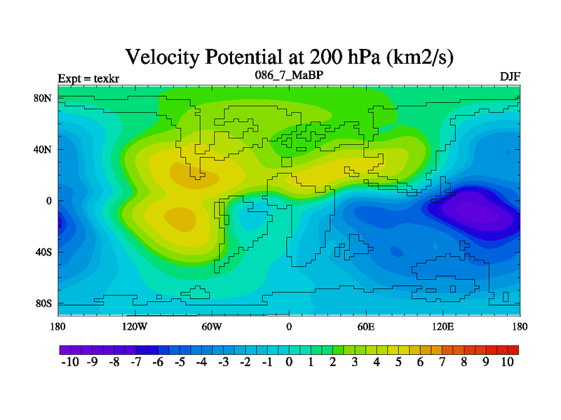 This is the 86.7 Ma simulation using the Scotese palaeogeographies. High output extension of the 5000 year spinup.