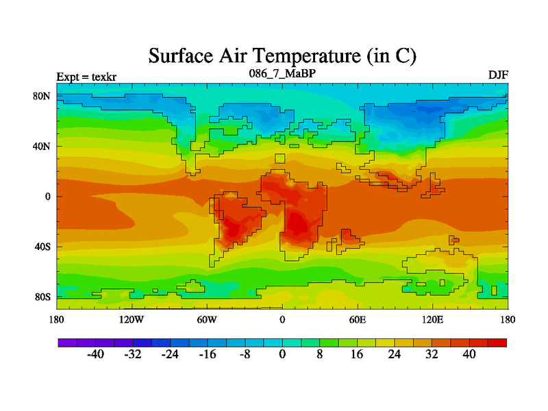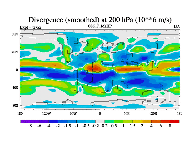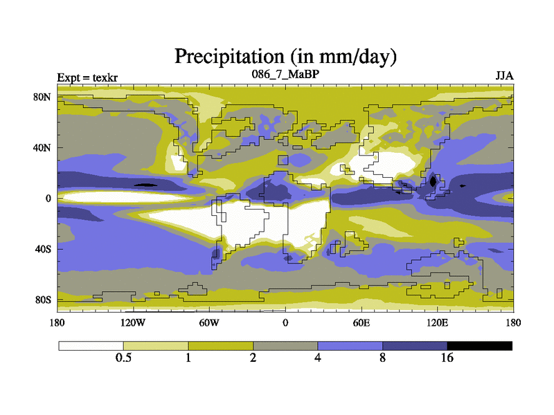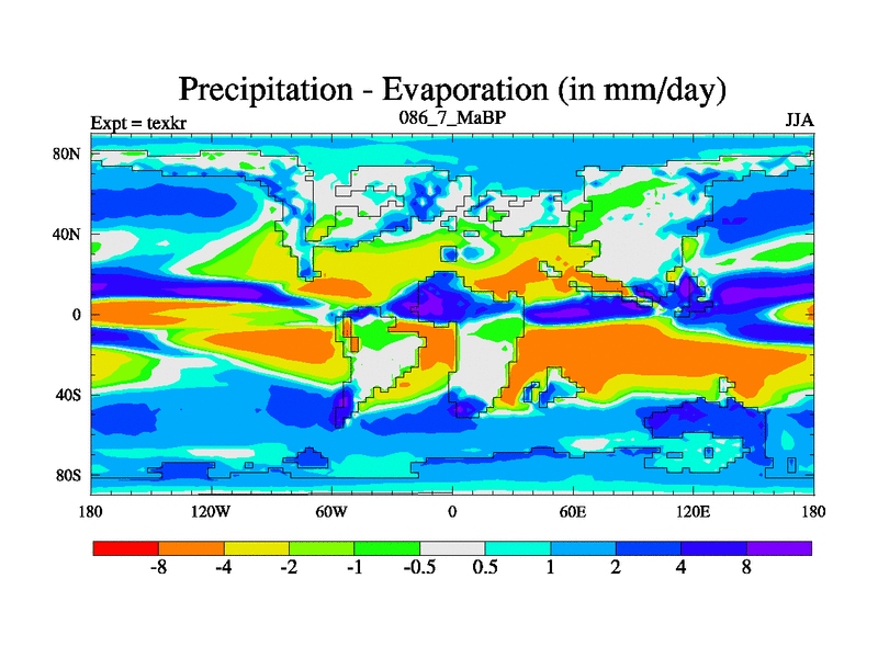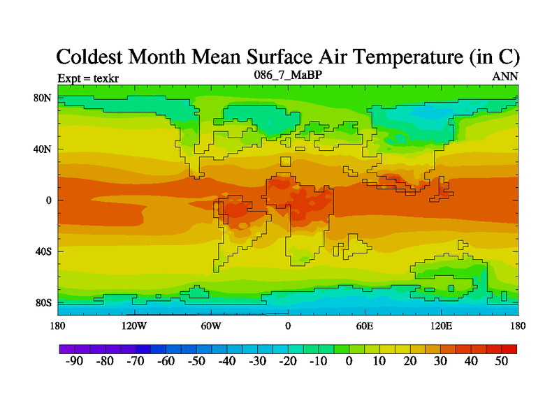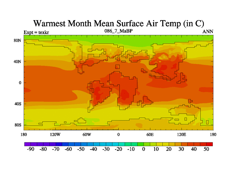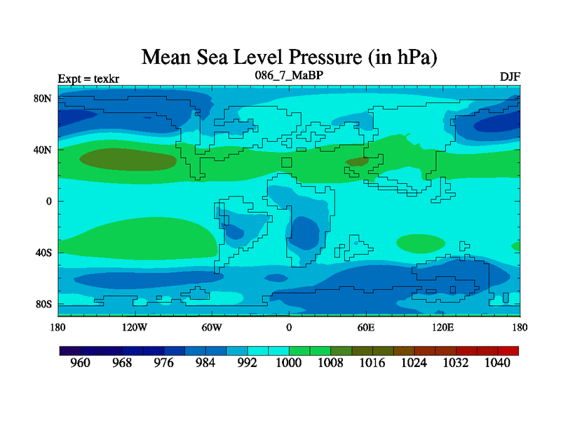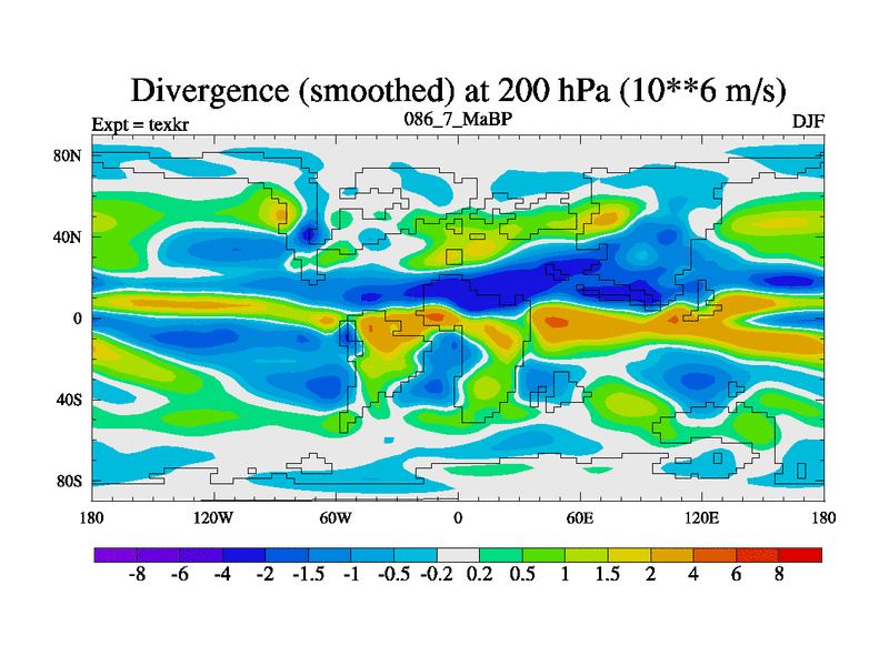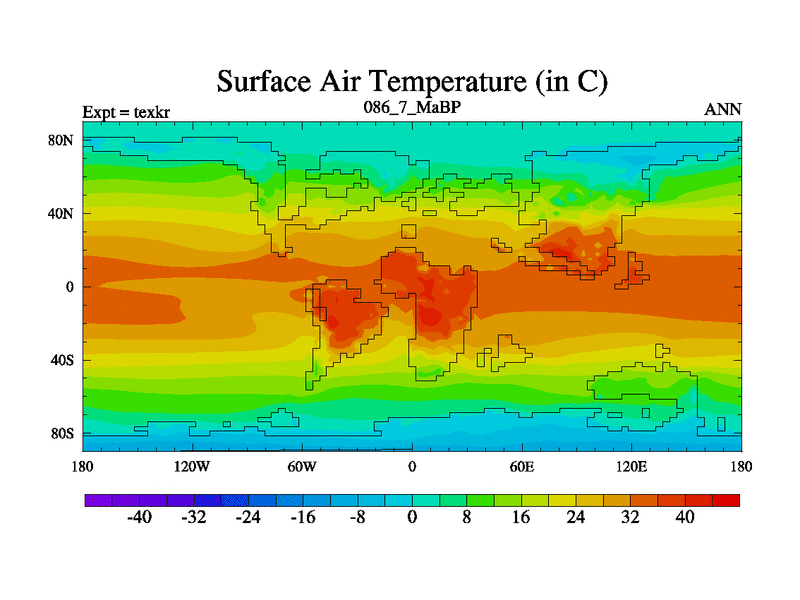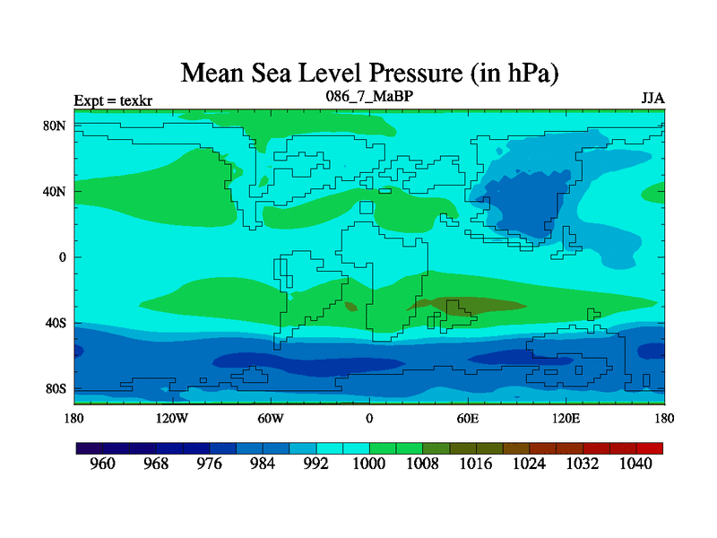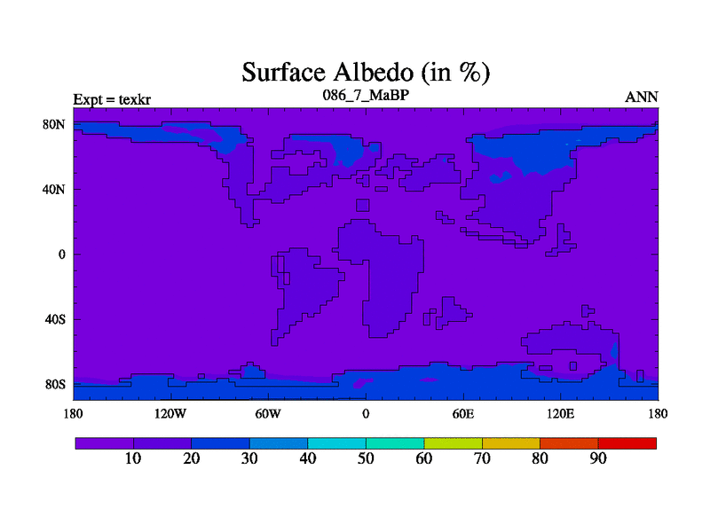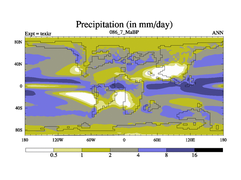This is the 86.7 Ma simulation using the Scotese palaeogeographies. High output extension of the 5000 year spinup.