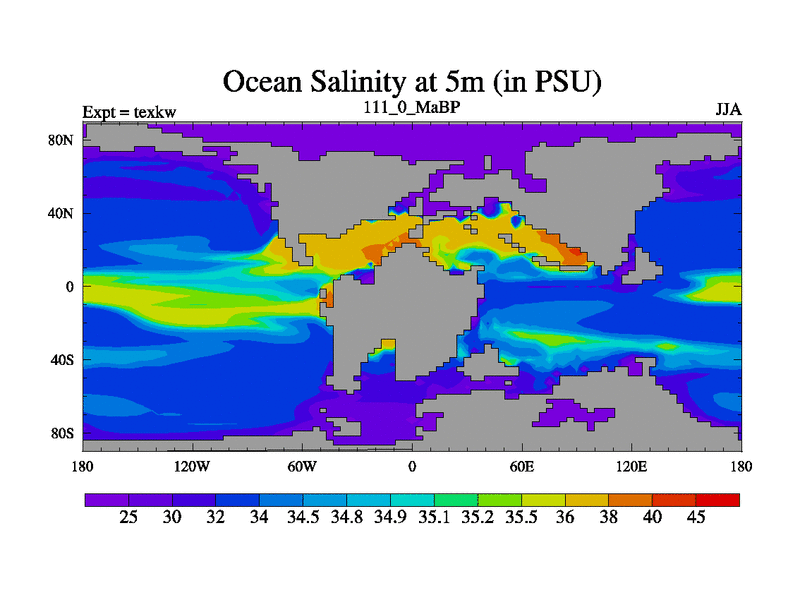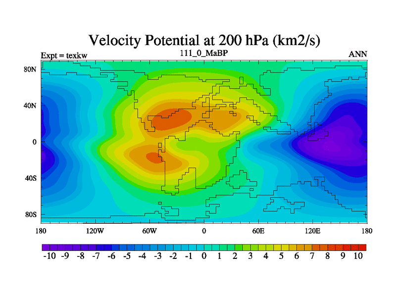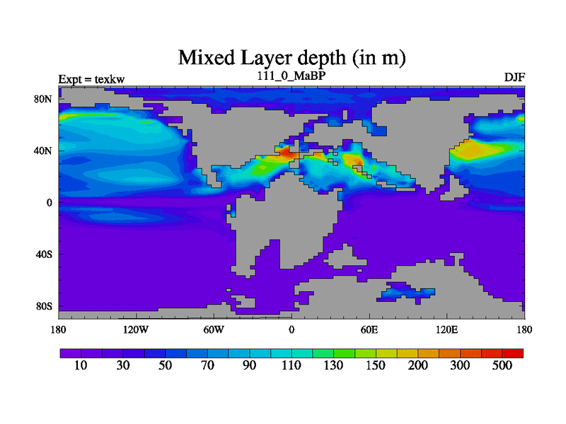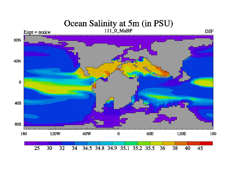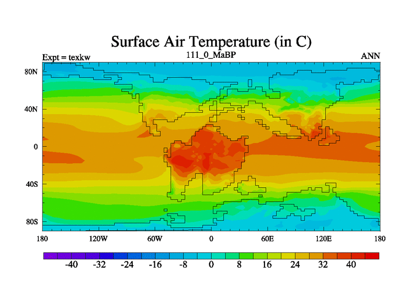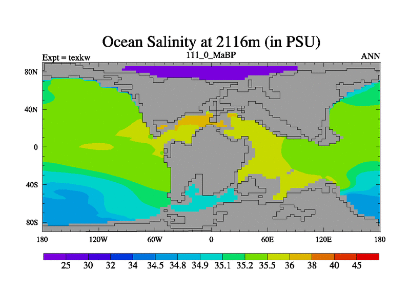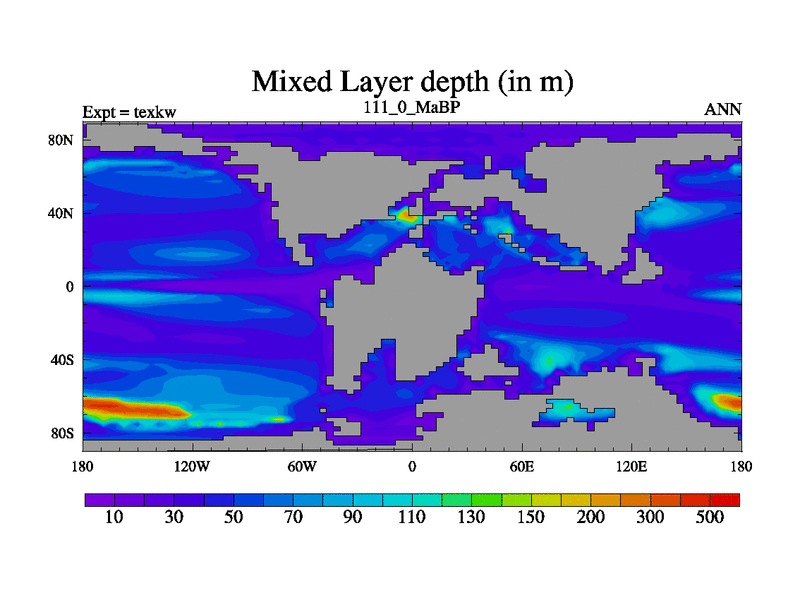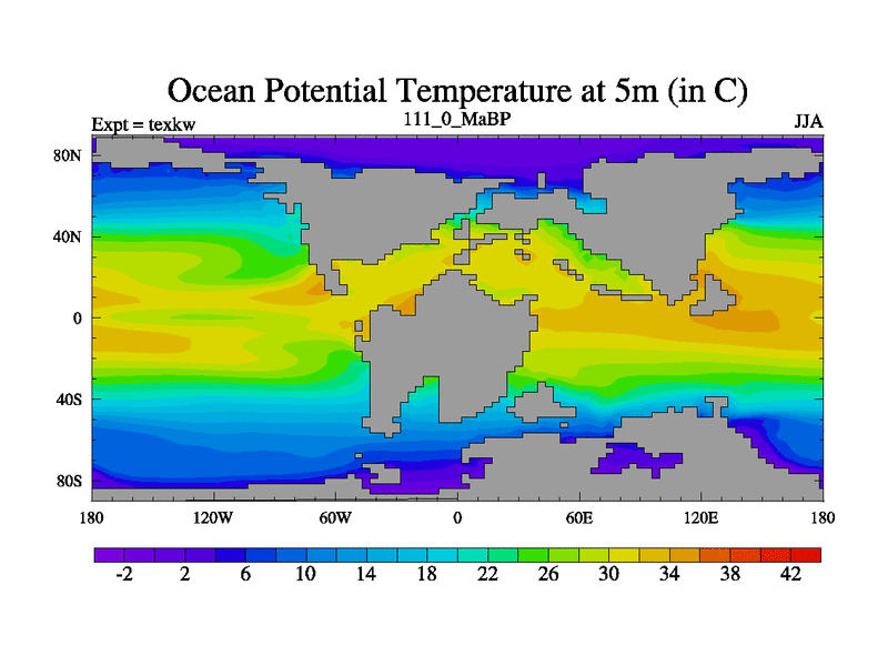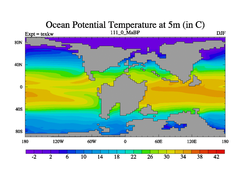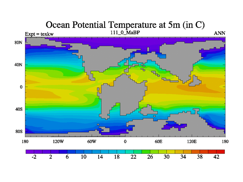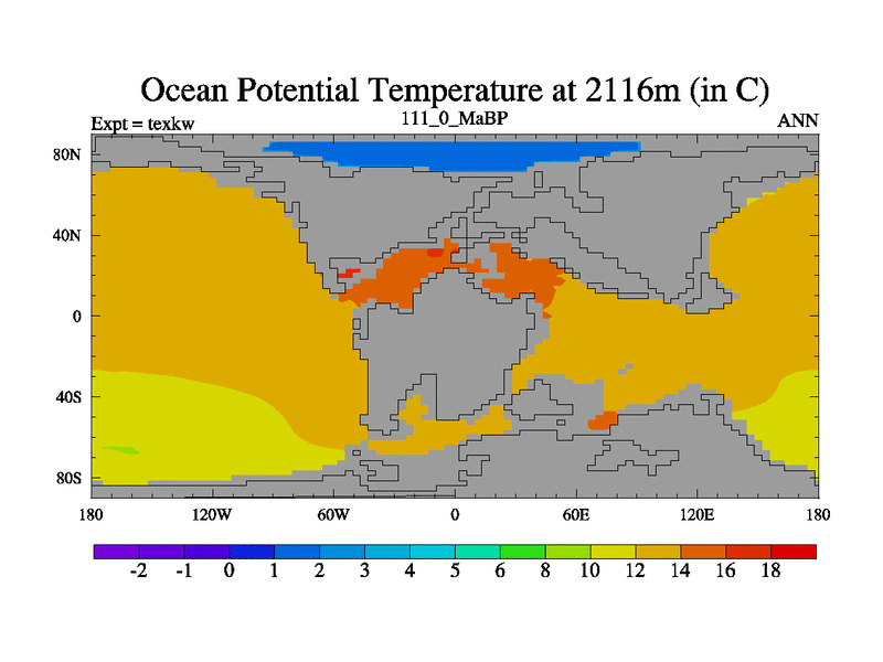 This is the 111.0 Ma simulation using the Scotese palaeogeographies. High output extension of the 5000 year spinup.