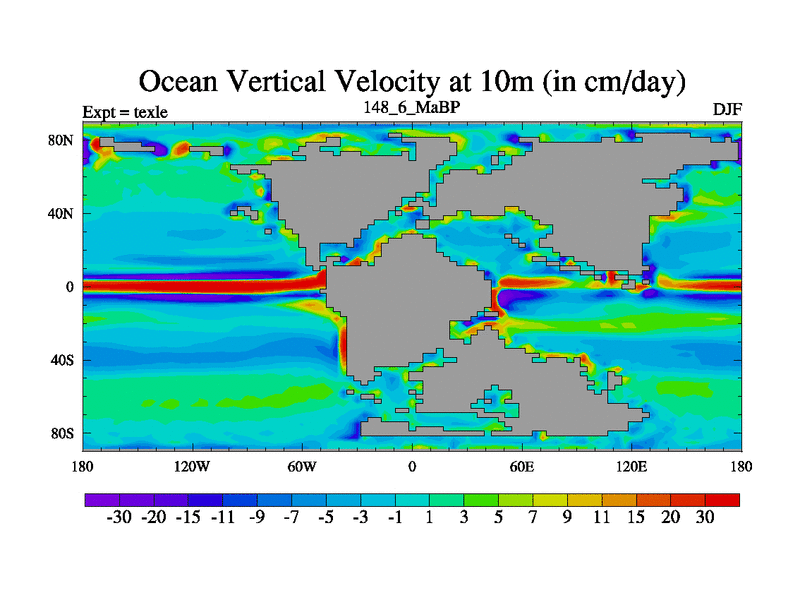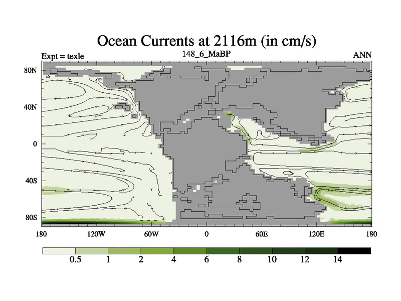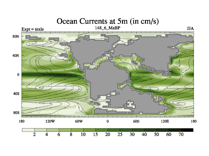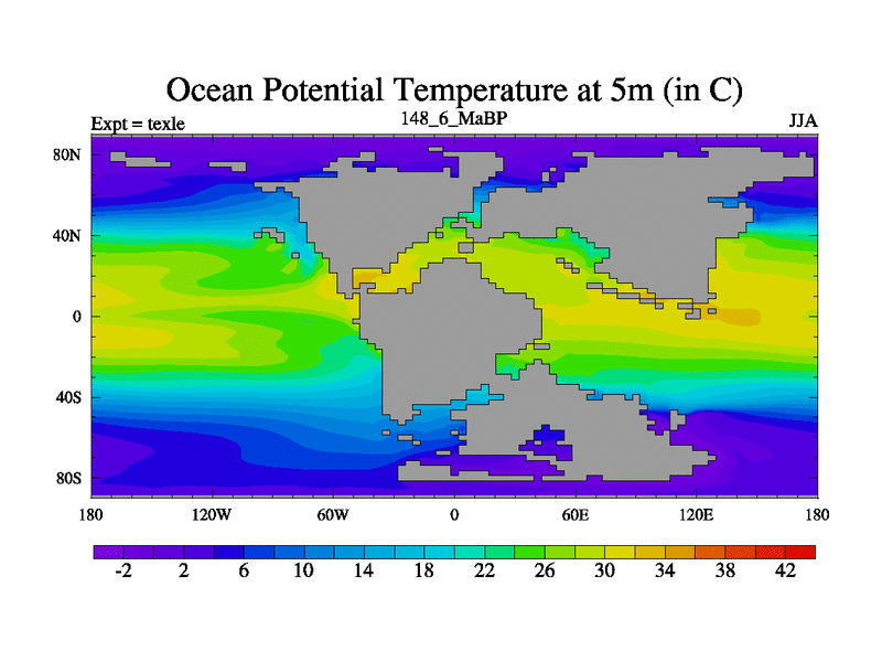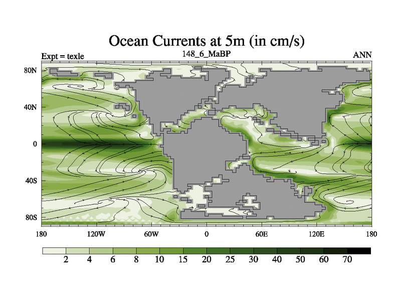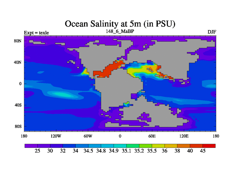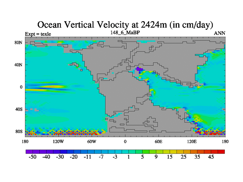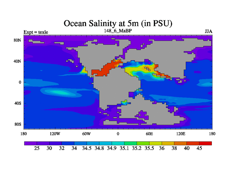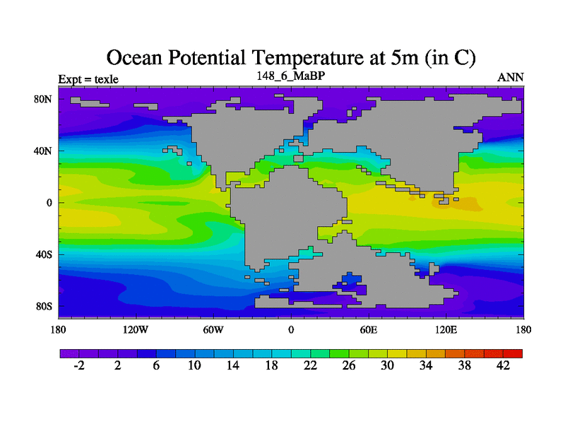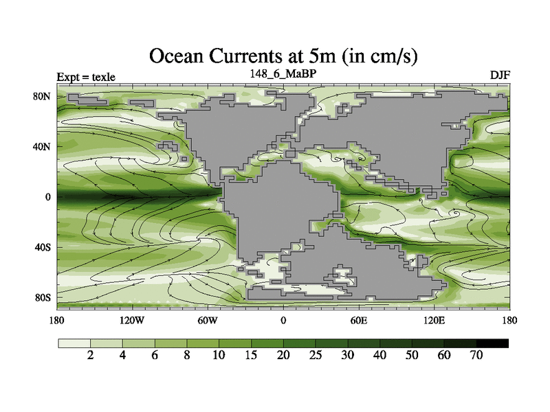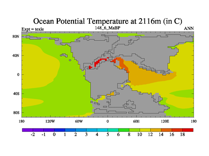 This is the 148.6 Ma simulation using the Scotese palaeogeographies. High output extension of the 5000 year spinup.