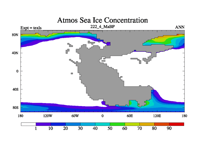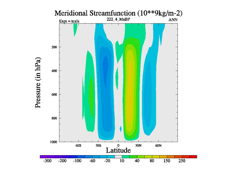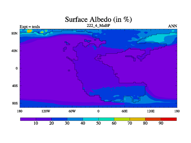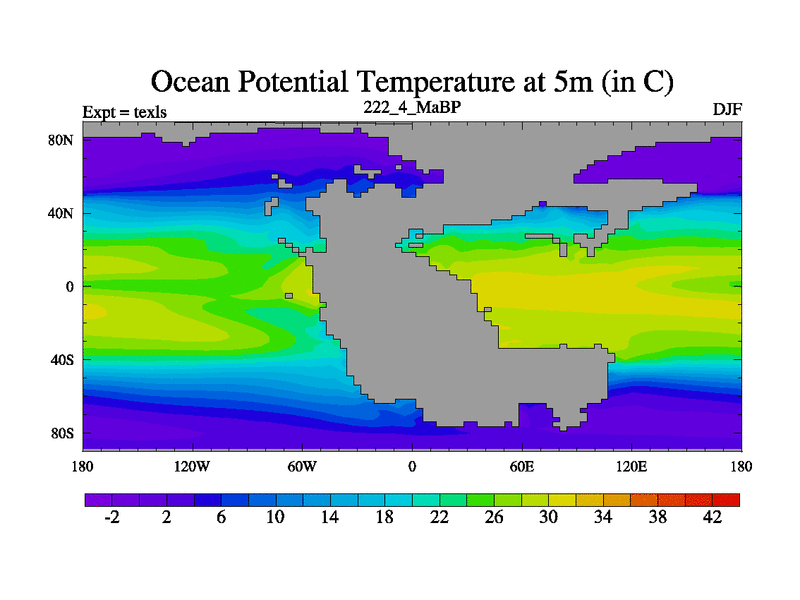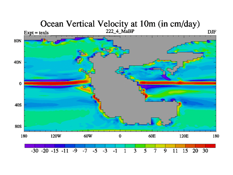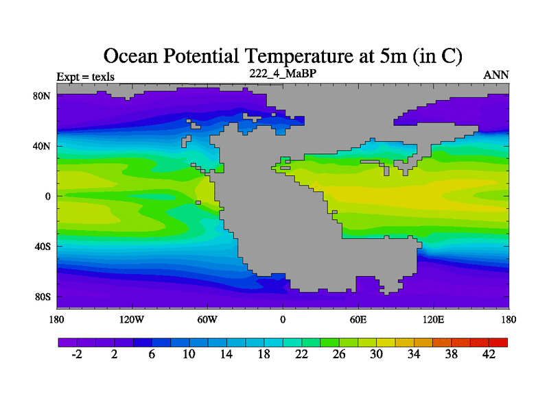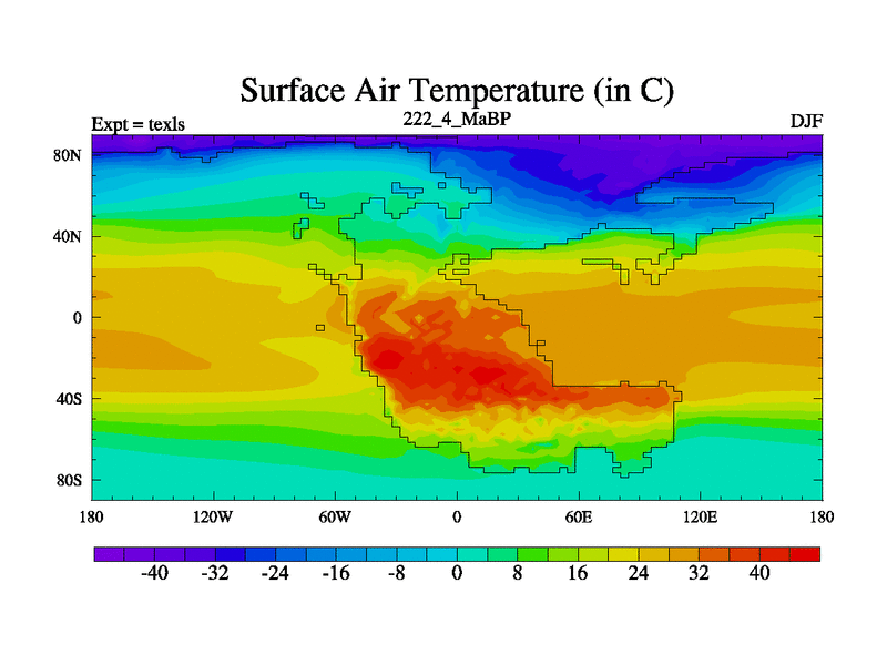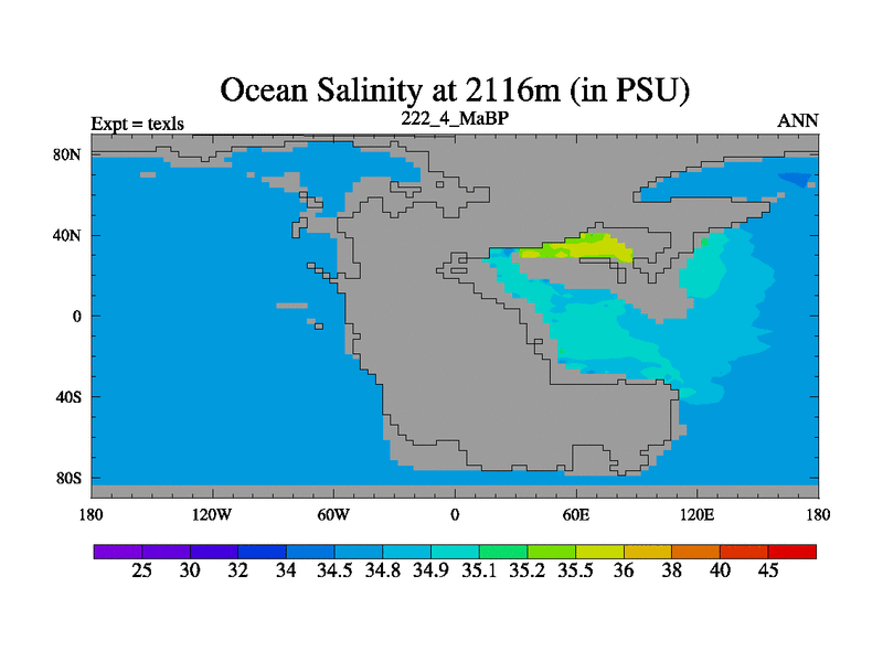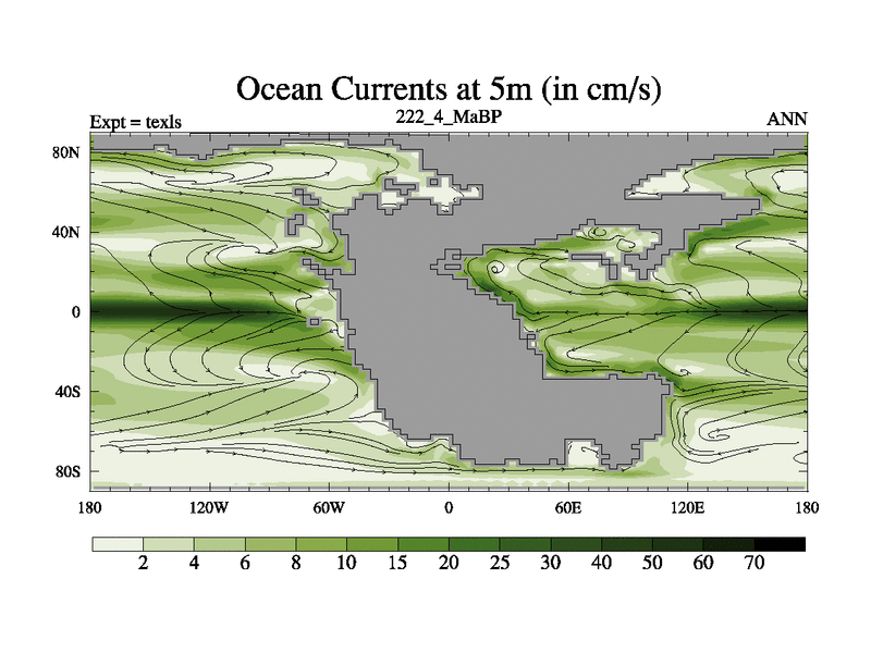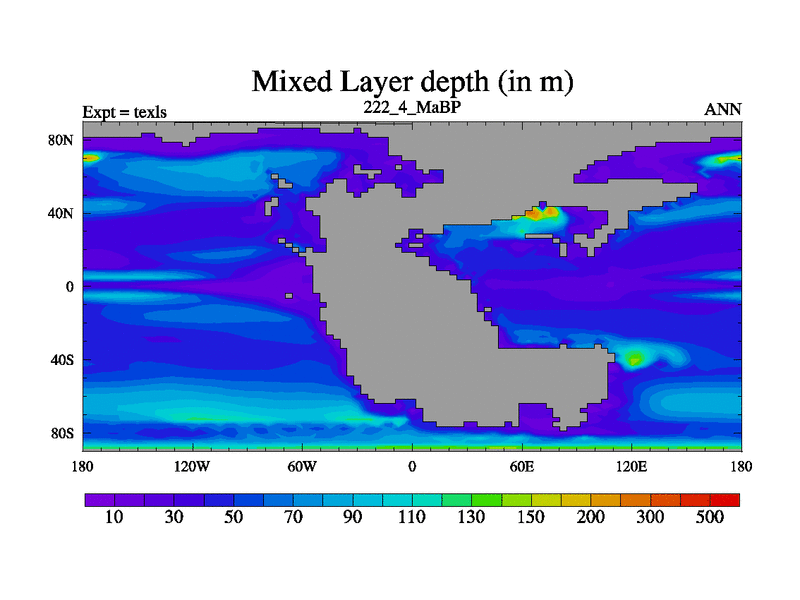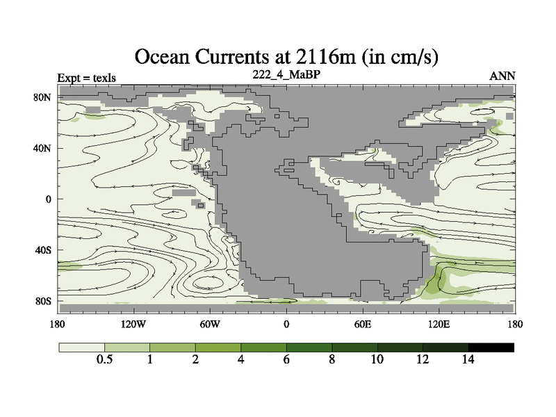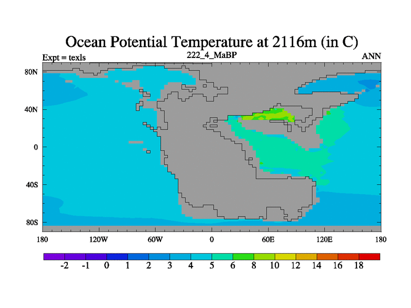 This is the 222.4 Ma simulation using the Scotese palaeogeographies. High output extension of the 5000 year spinup.