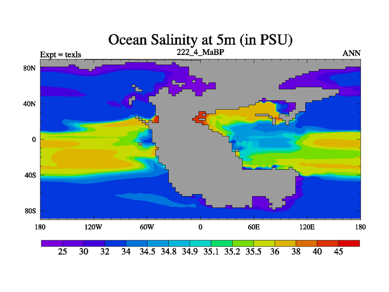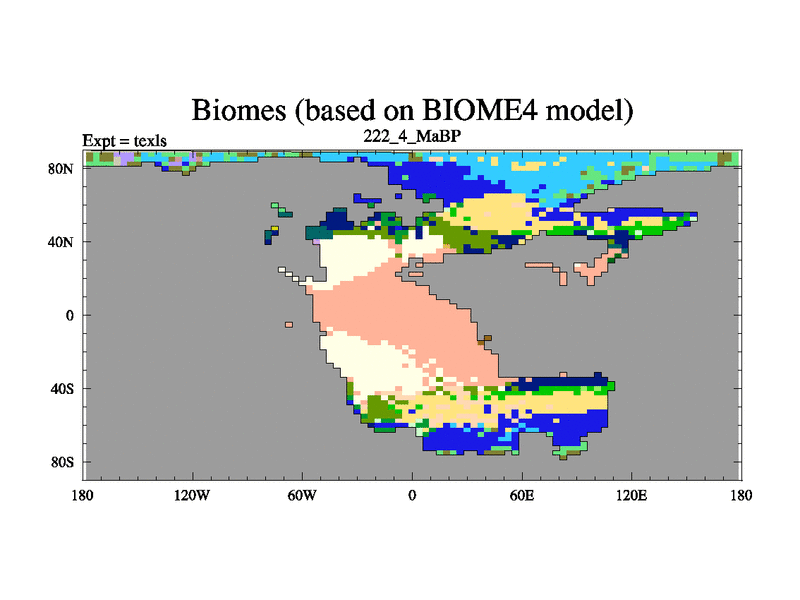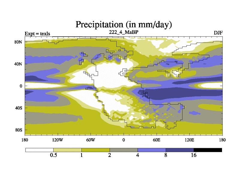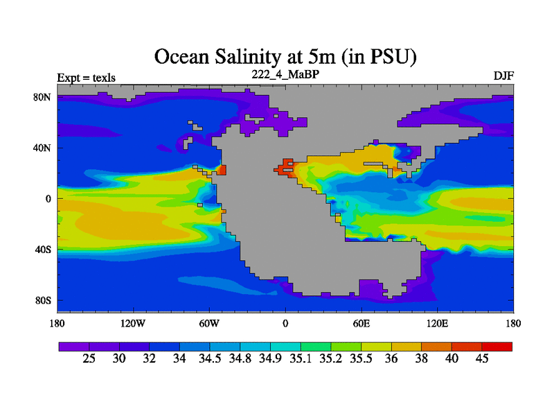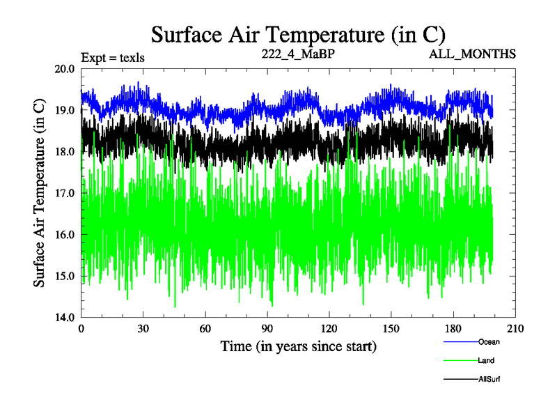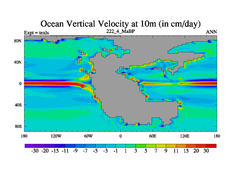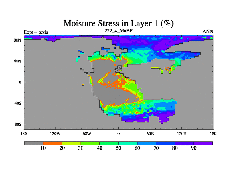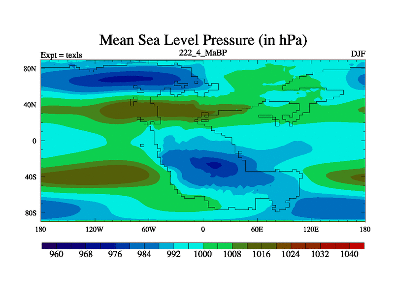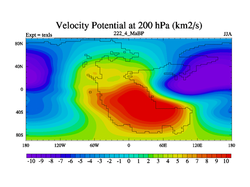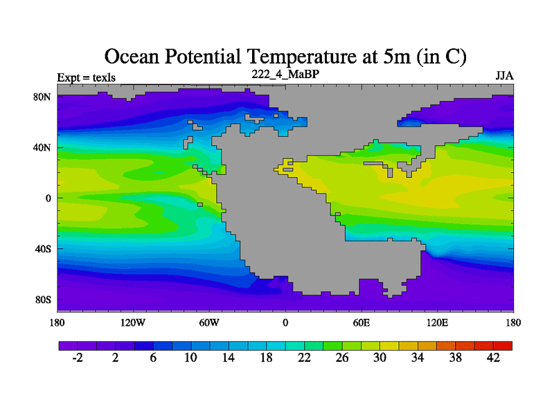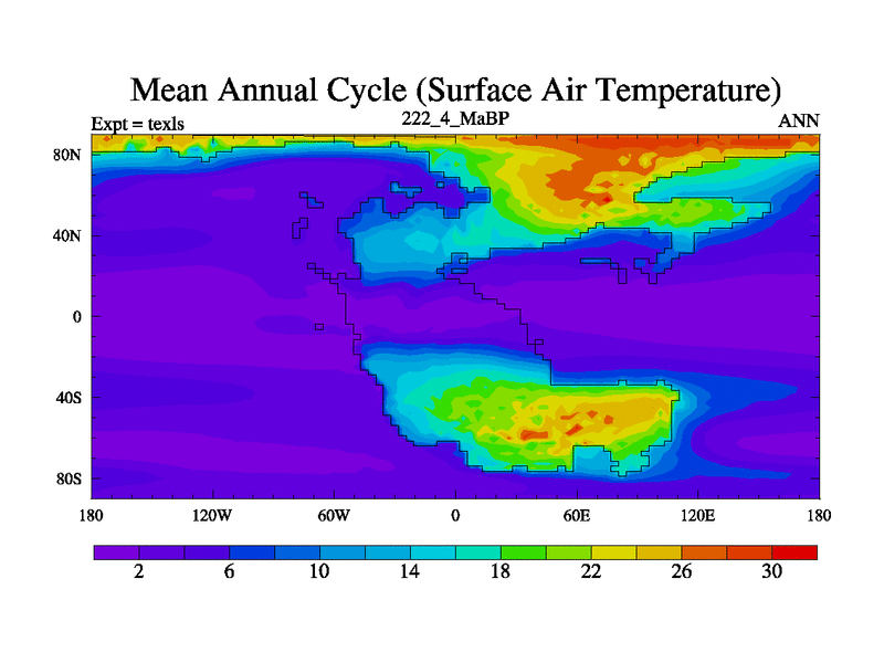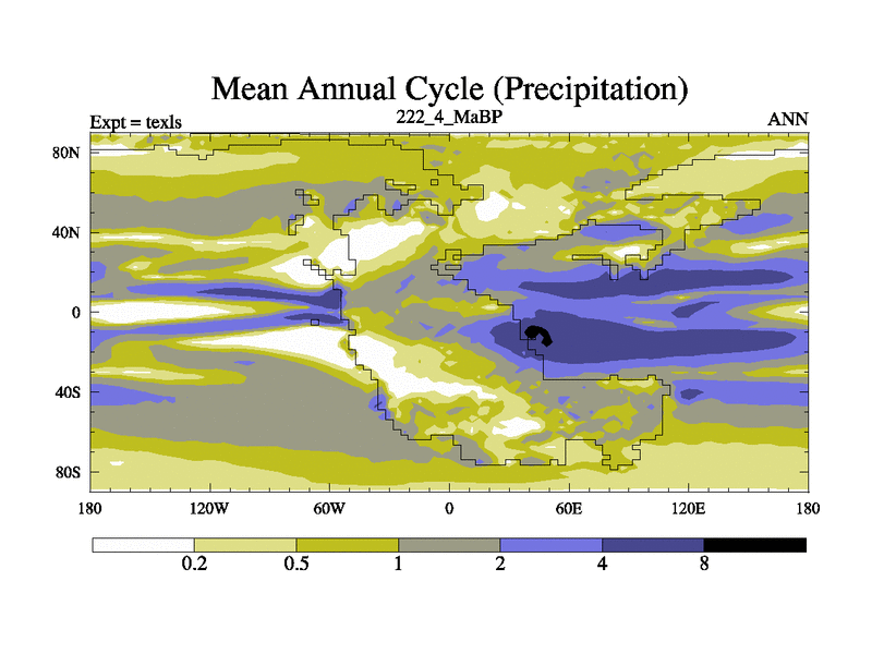 This is the 222.4 Ma simulation using the Scotese palaeogeographies. High output extension of the 5000 year spinup.