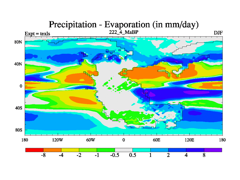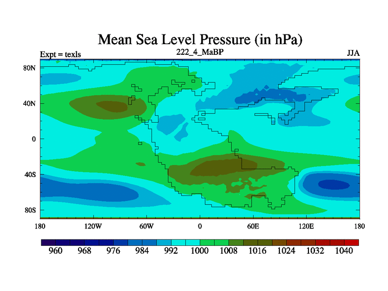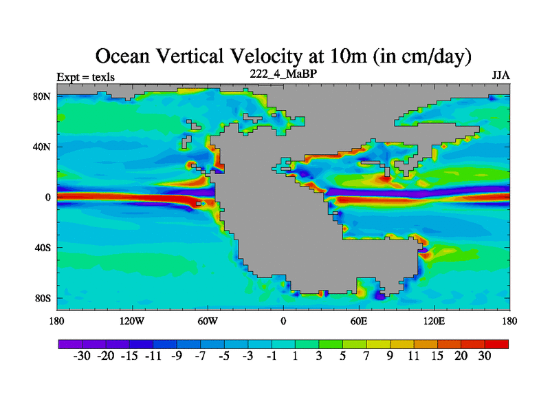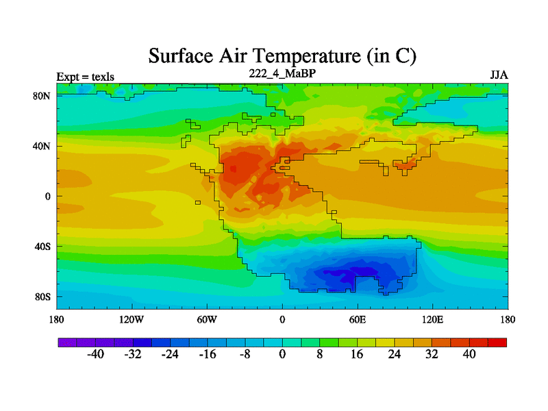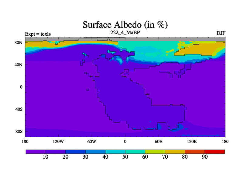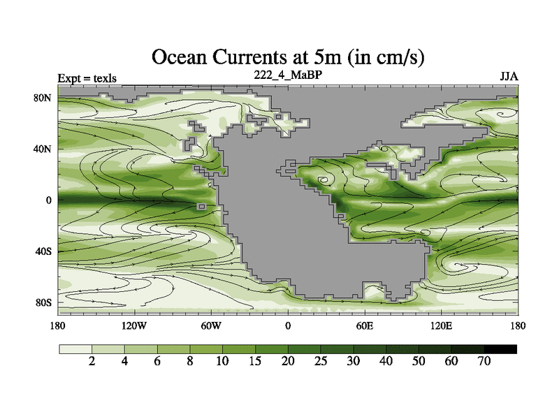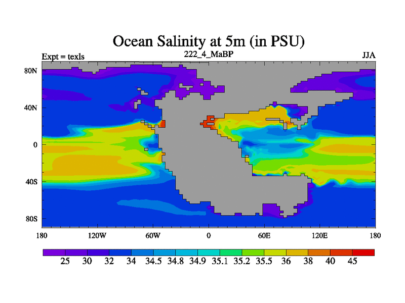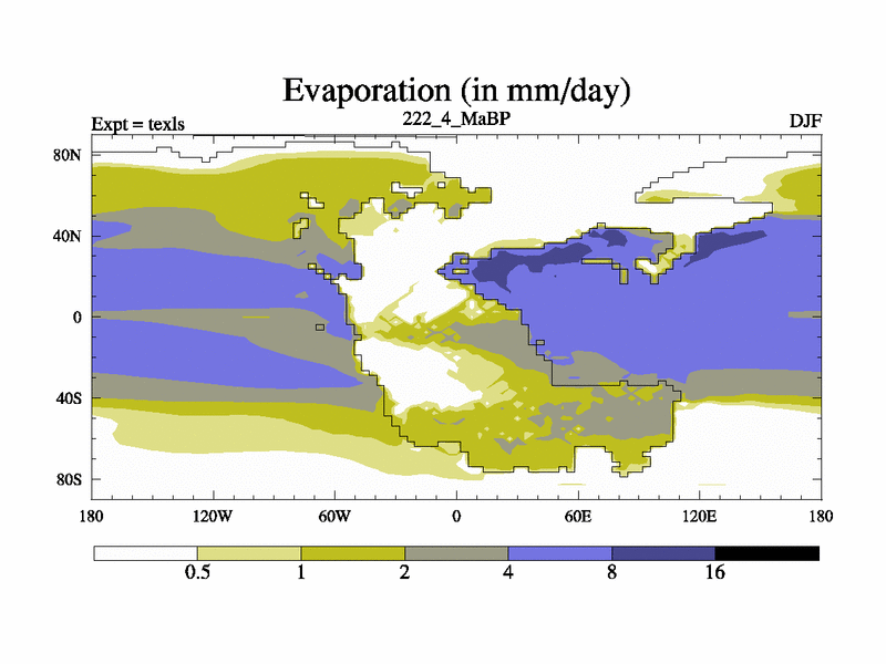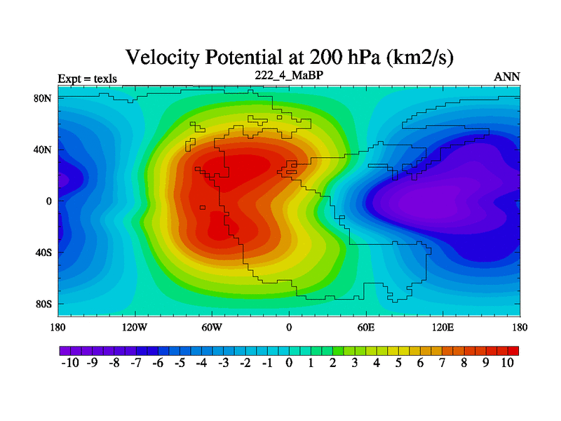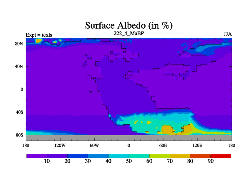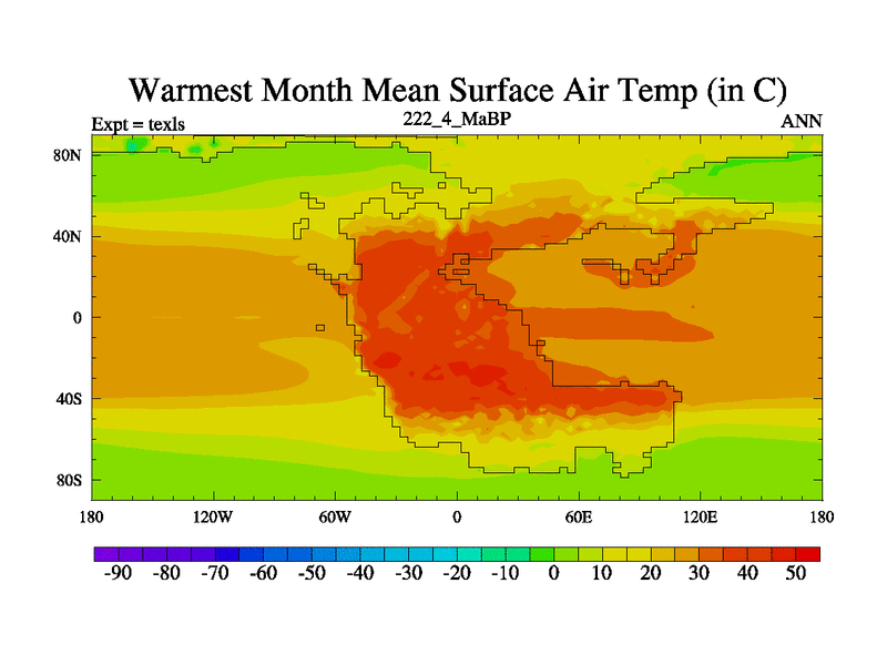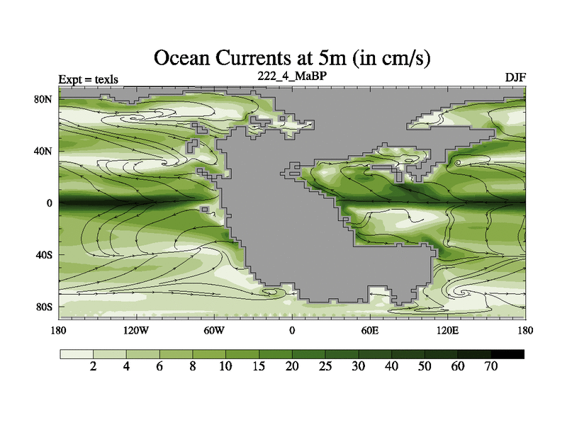 This is the 222.4 Ma simulation using the Scotese palaeogeographies. High output extension of the 5000 year spinup.