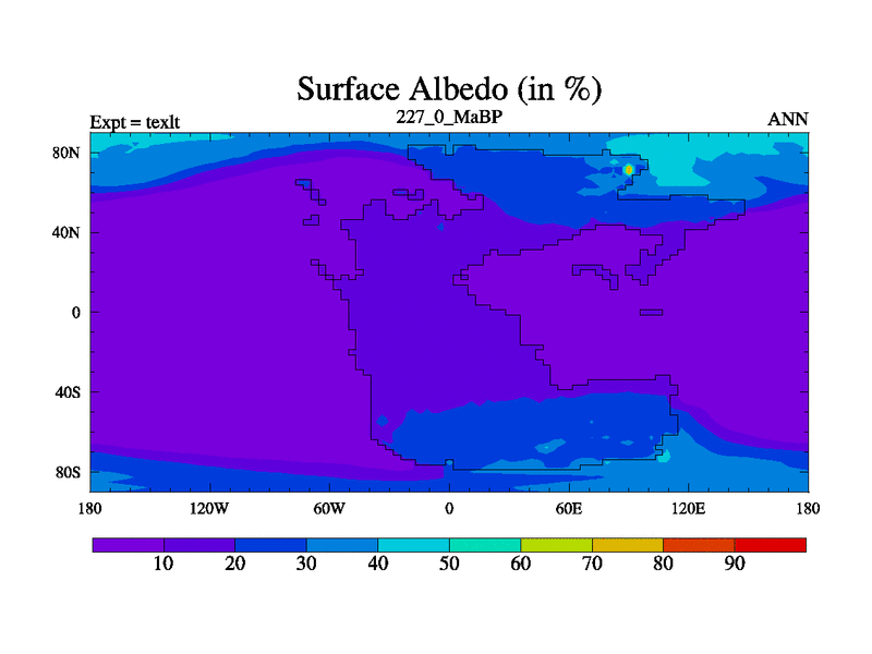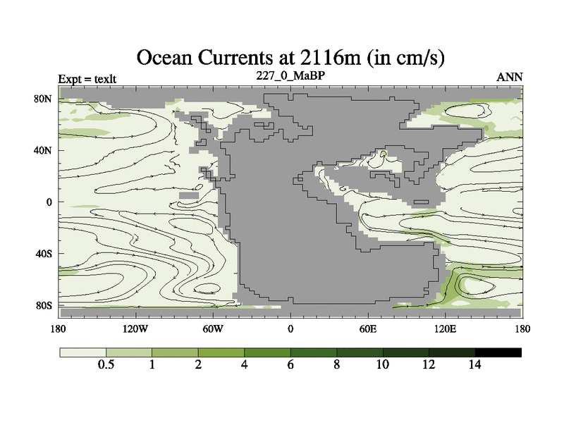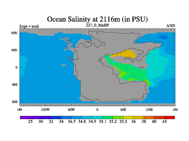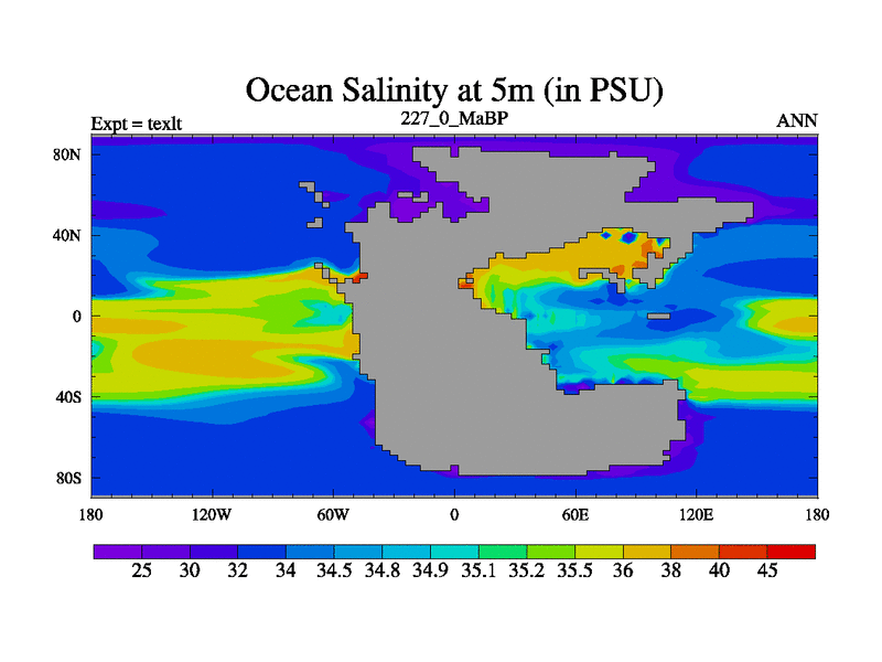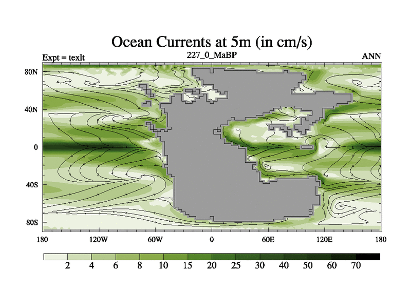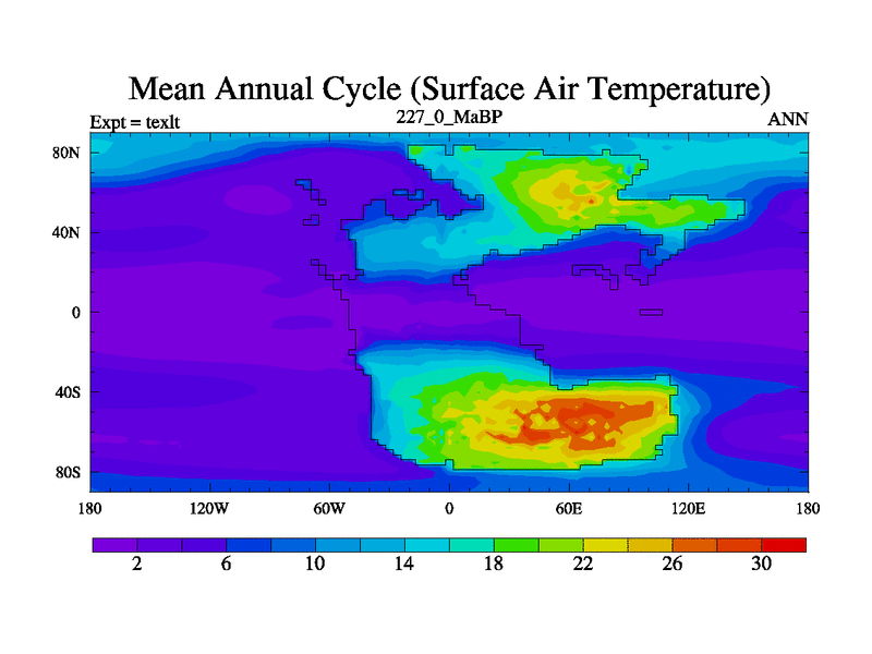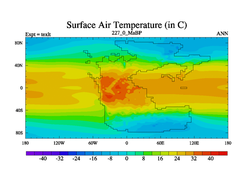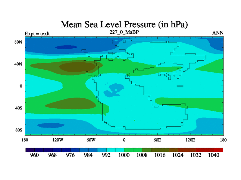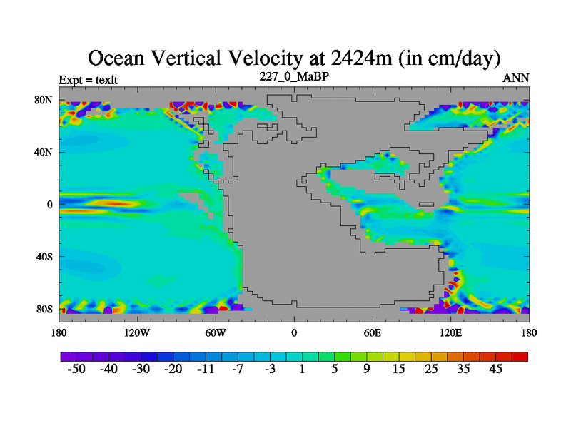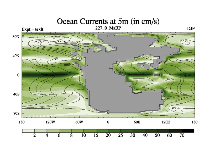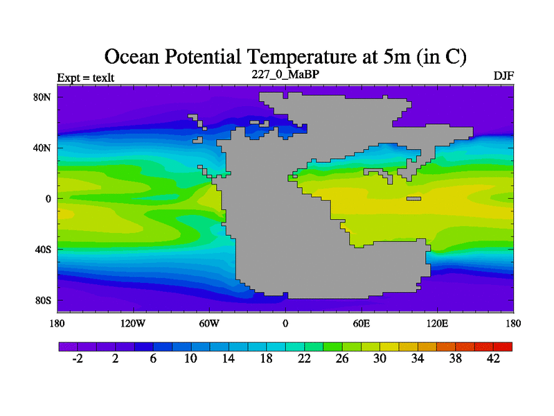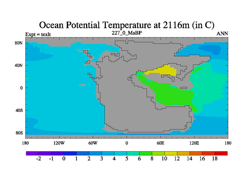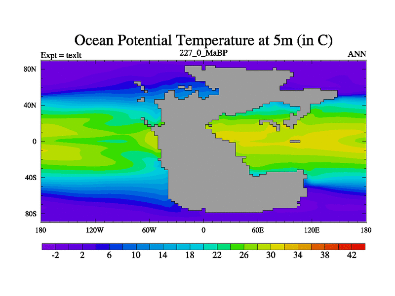 This is the 227.0 Ma simulation using the Scotese palaeogeographies. High output extension of the 5000 year spinup.