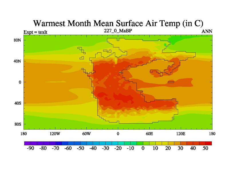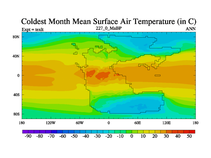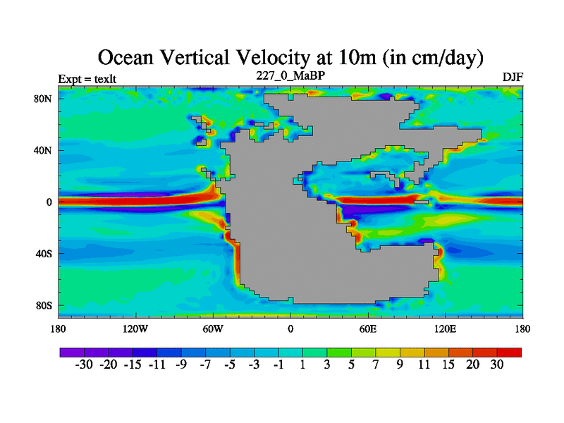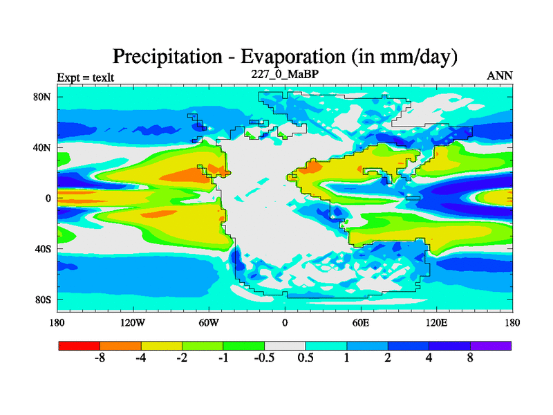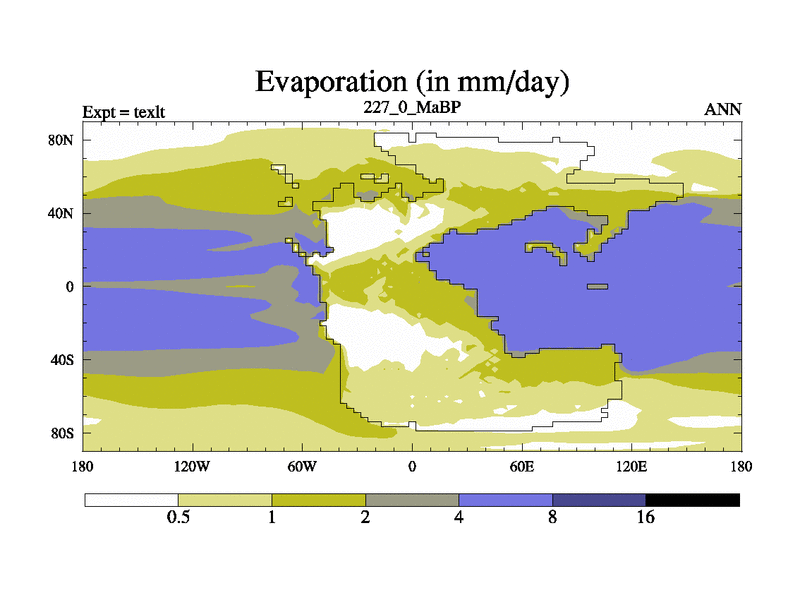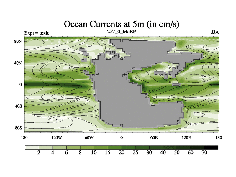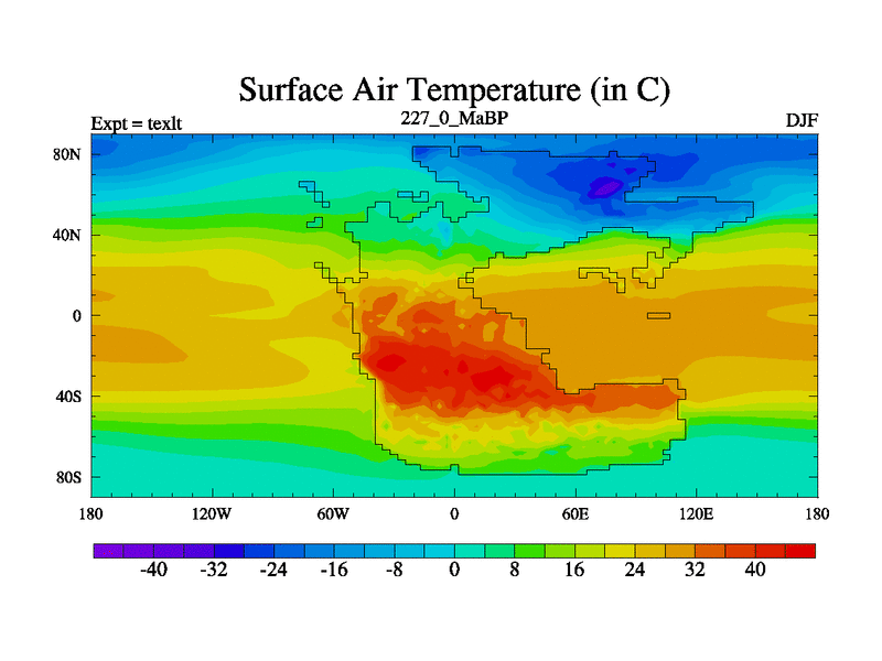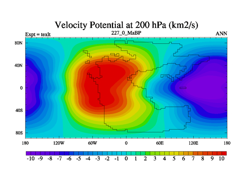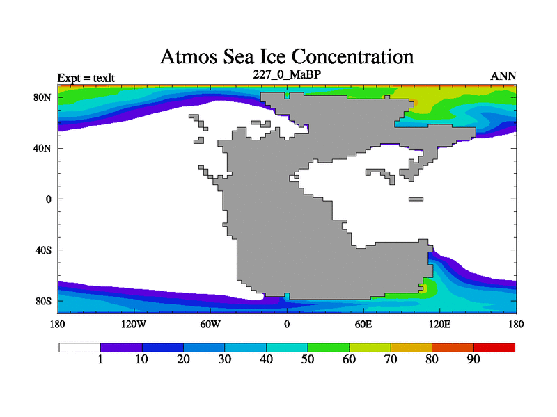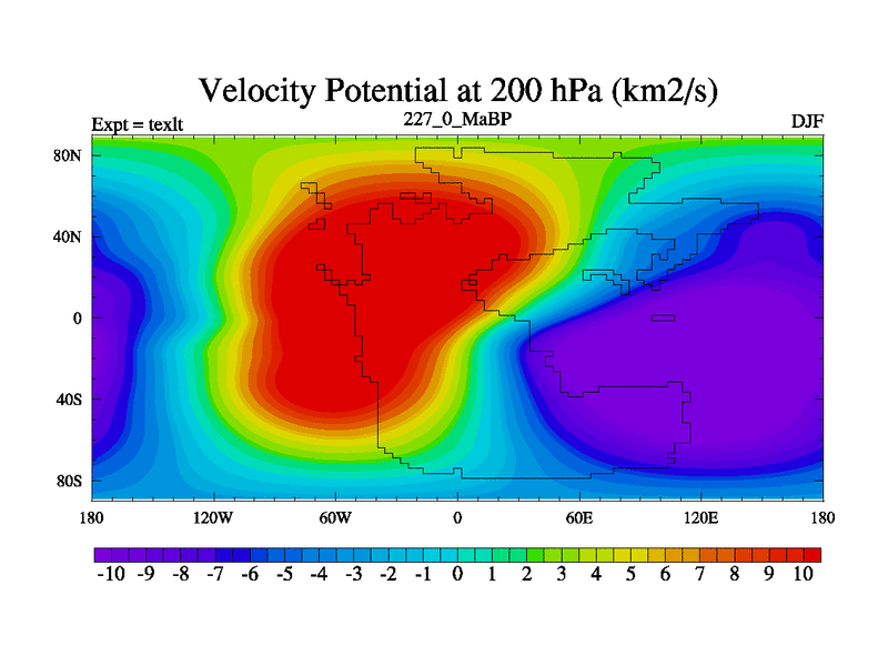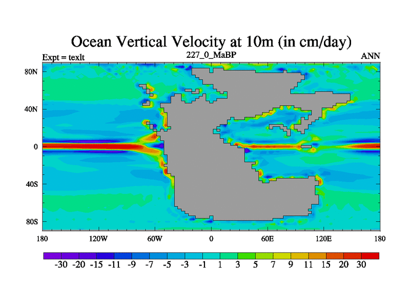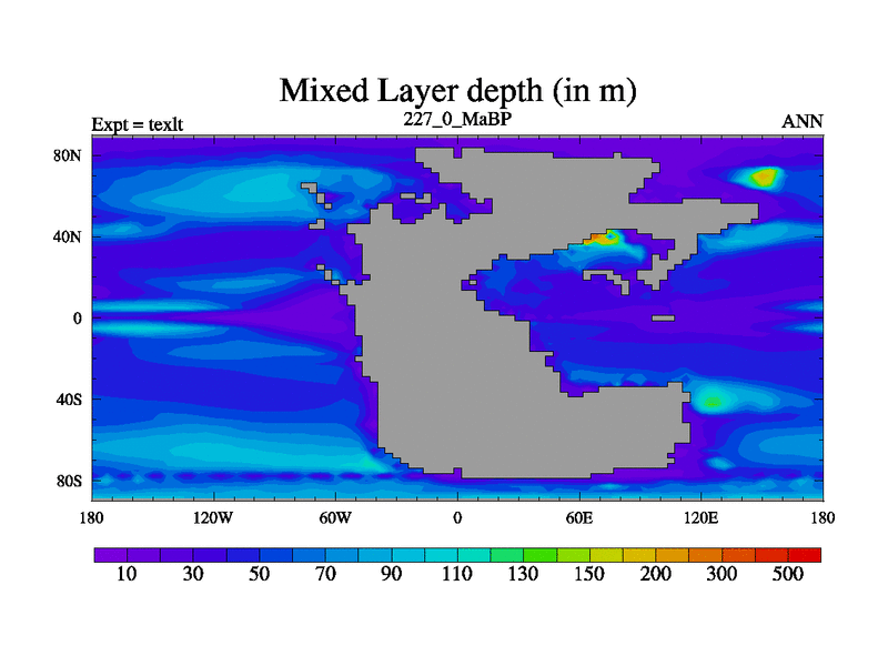 This is the 227.0 Ma simulation using the Scotese palaeogeographies. High output extension of the 5000 year spinup.