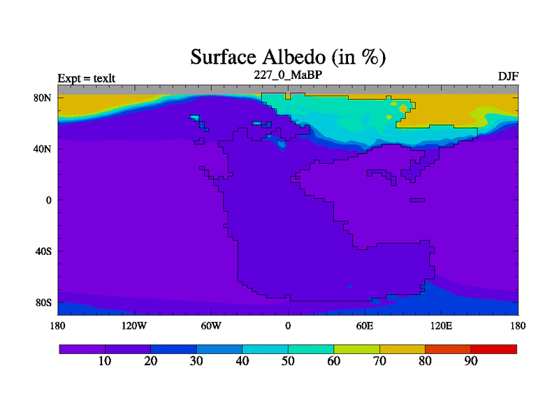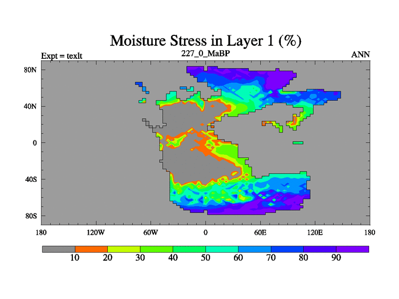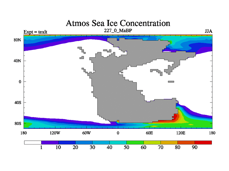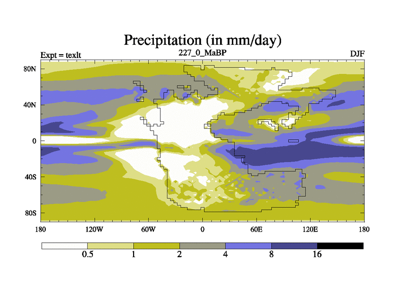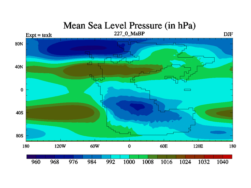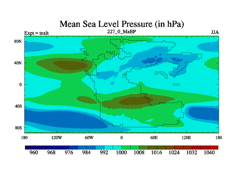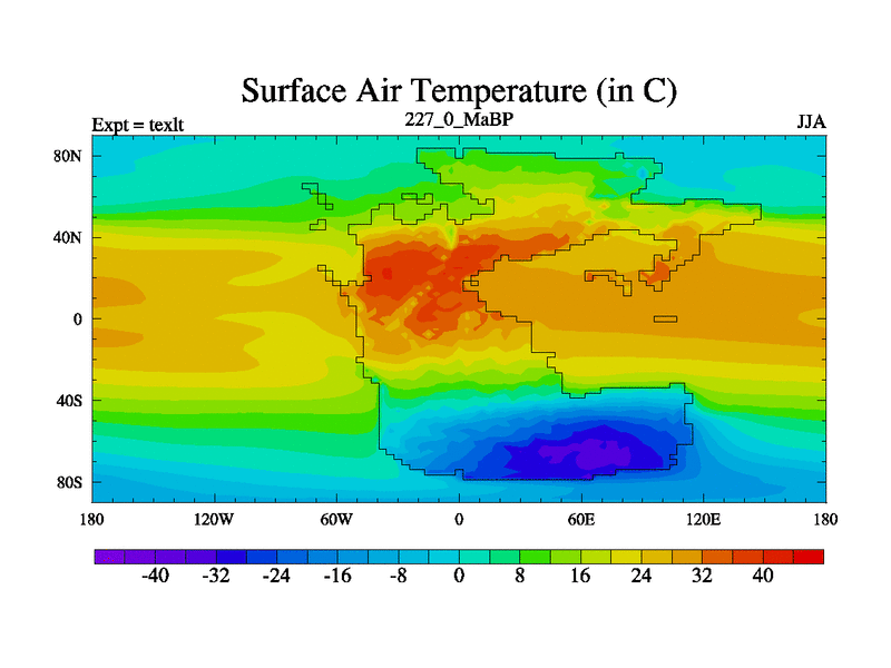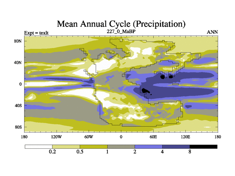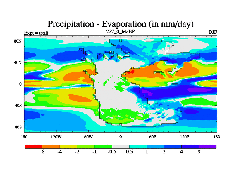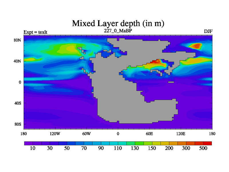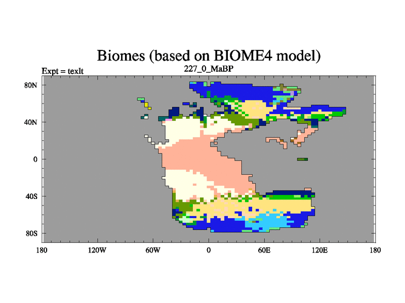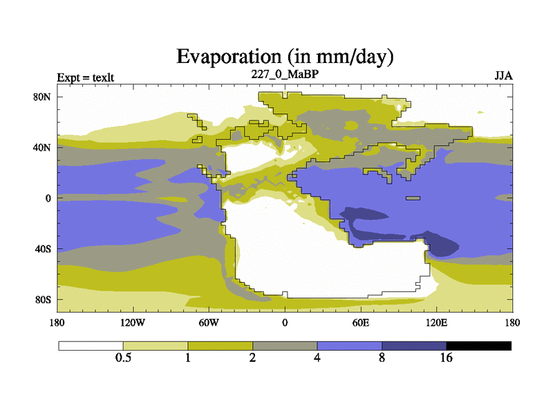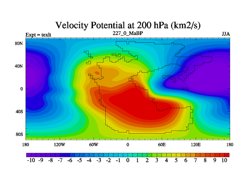 This is the 227.0 Ma simulation using the Scotese palaeogeographies. High output extension of the 5000 year spinup.