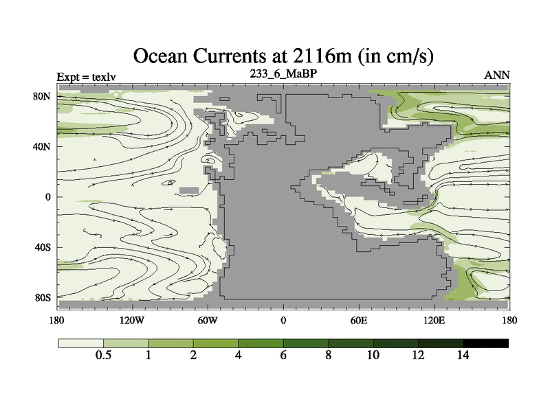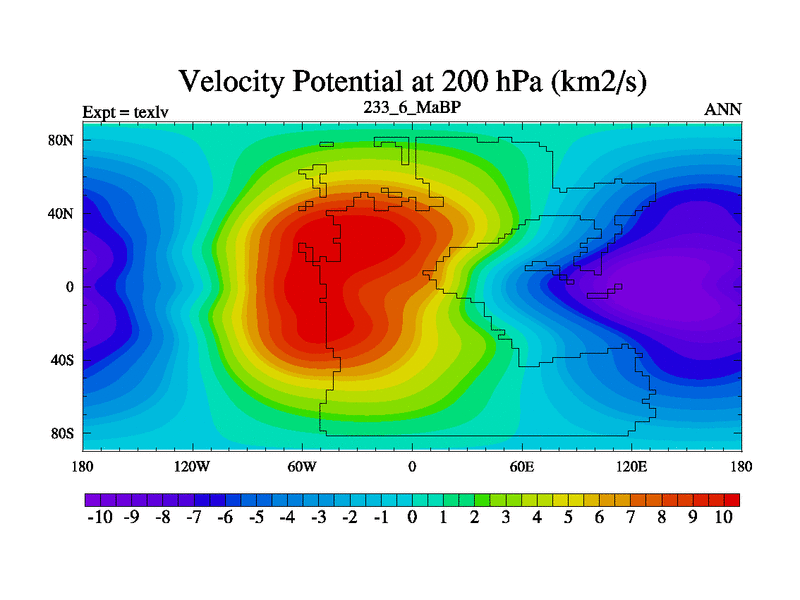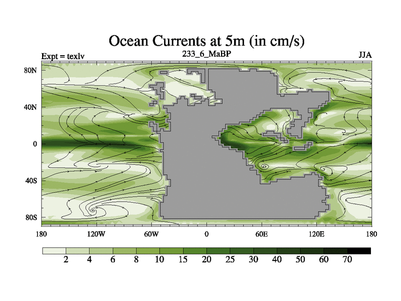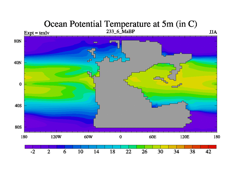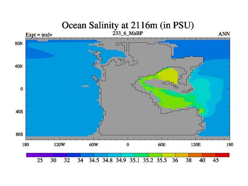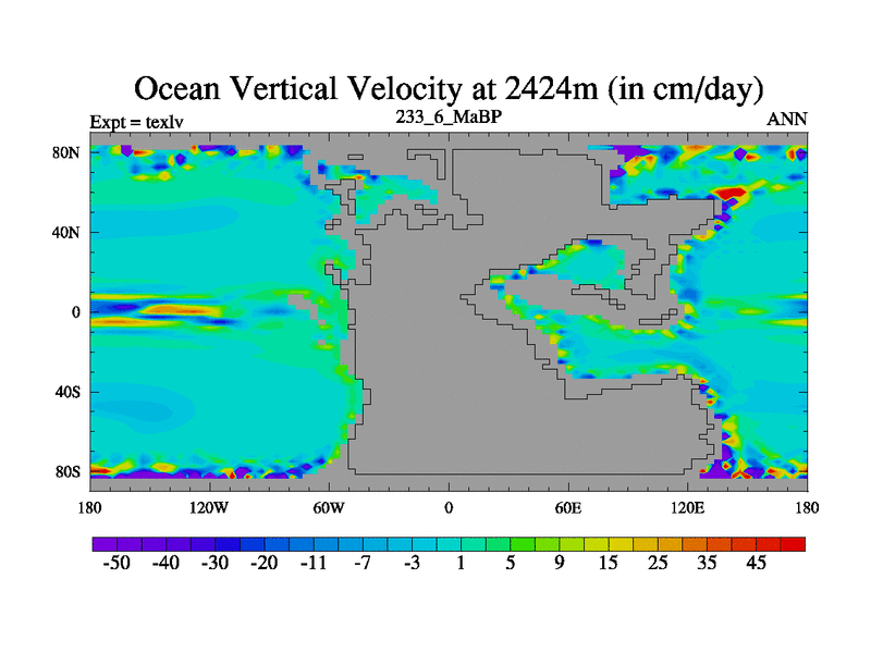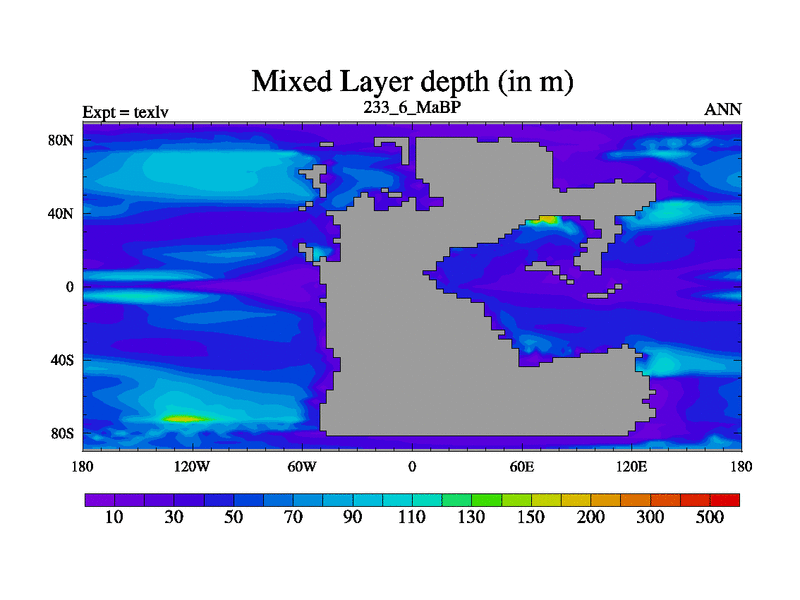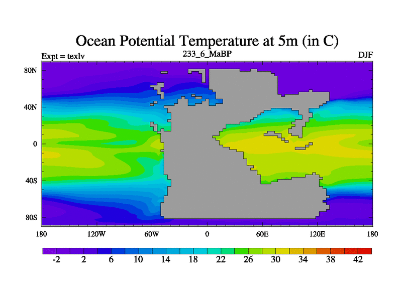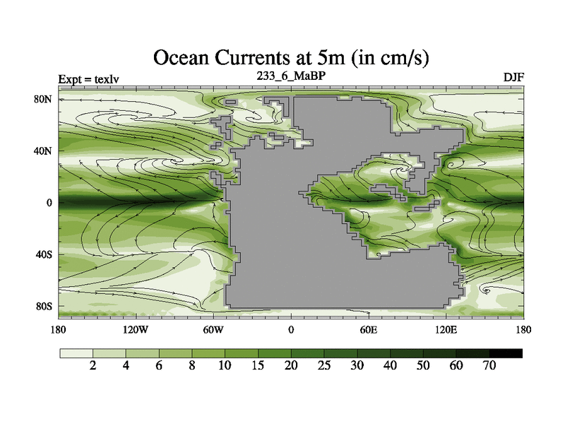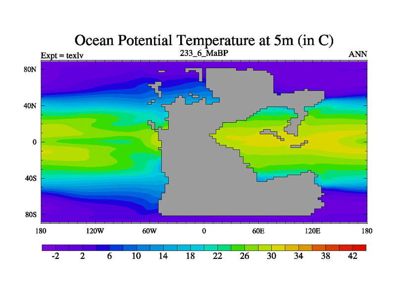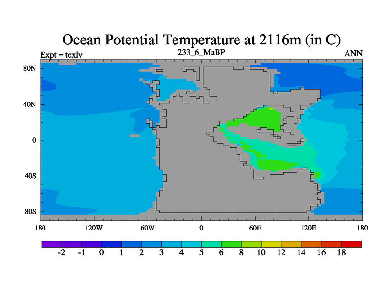 This is the 233.6 Ma simulation using the Scotese palaeogeographies. High output extension of the 5000 year spinup.