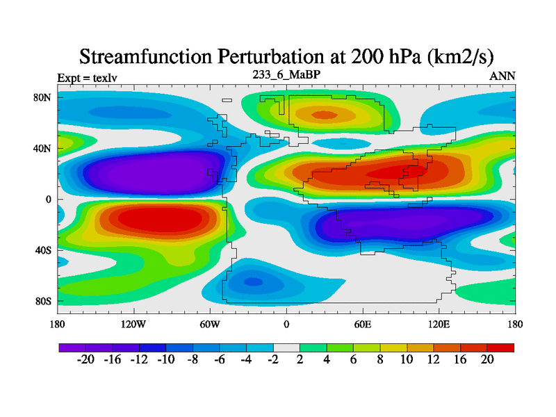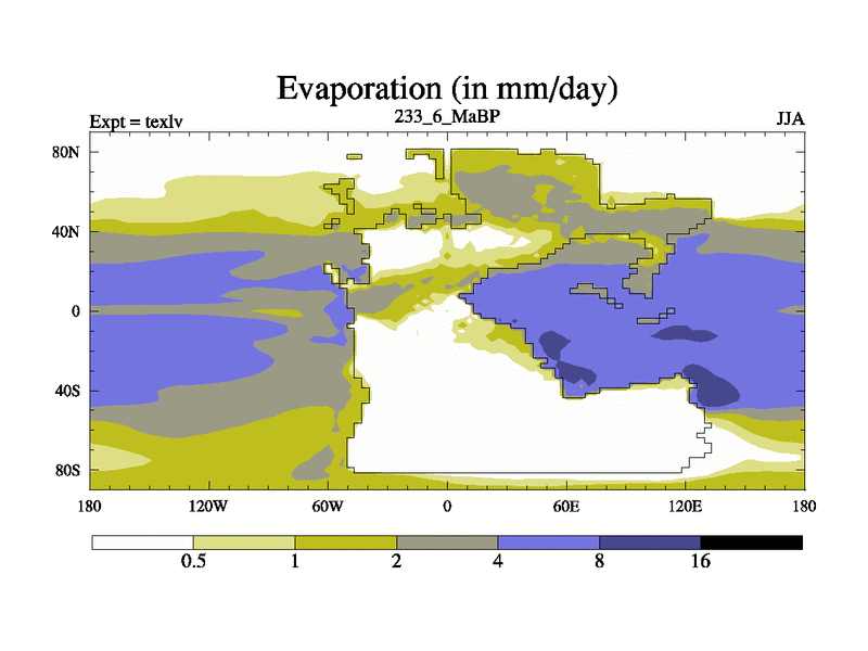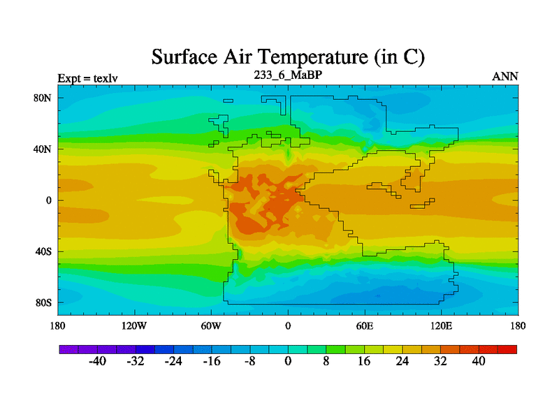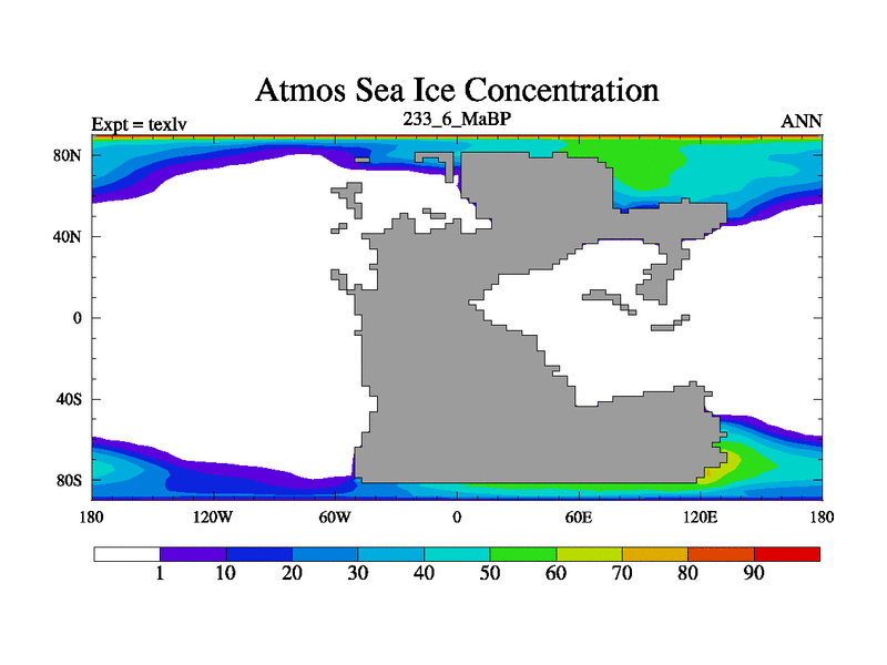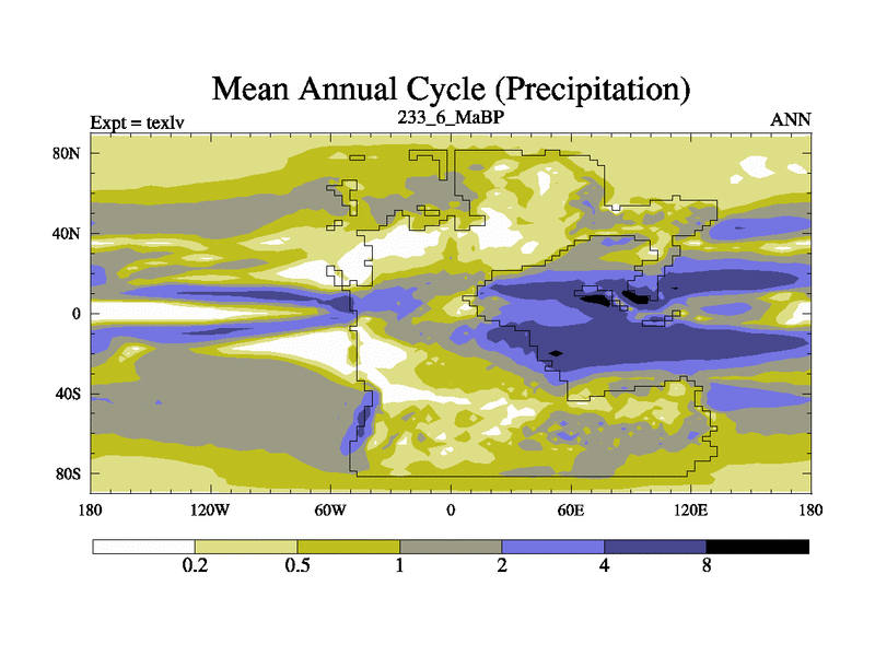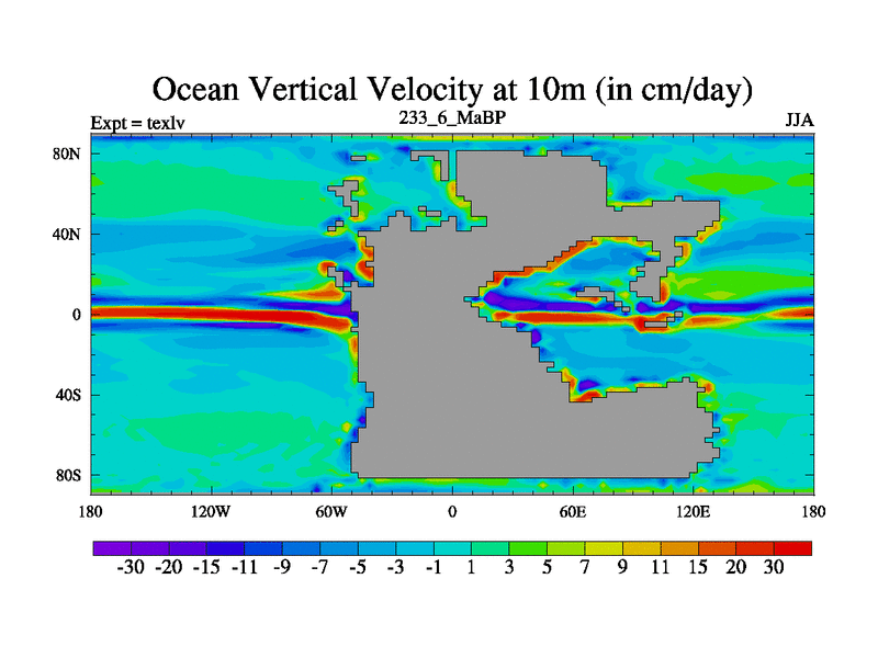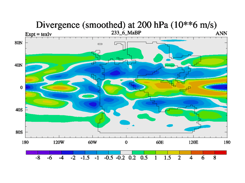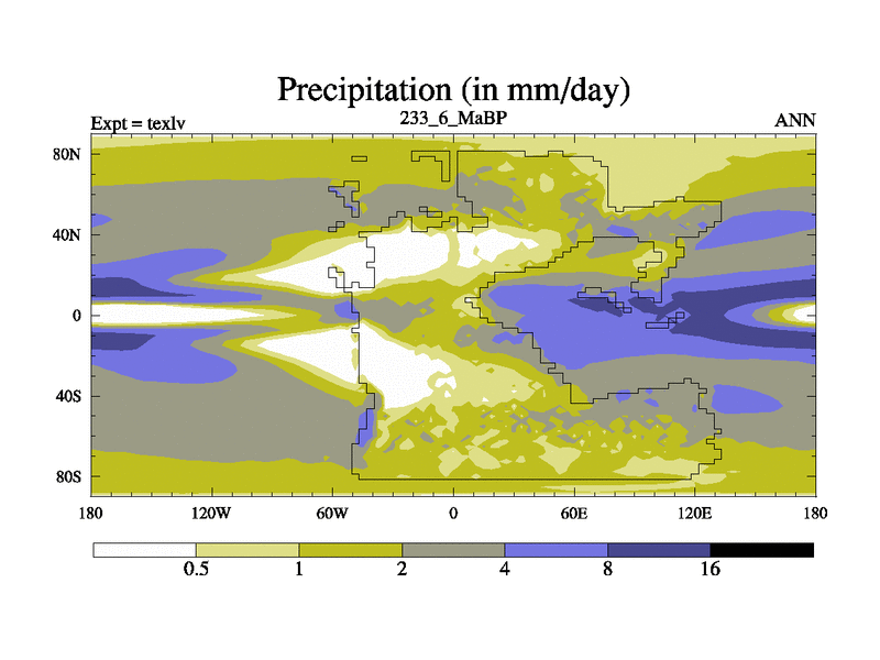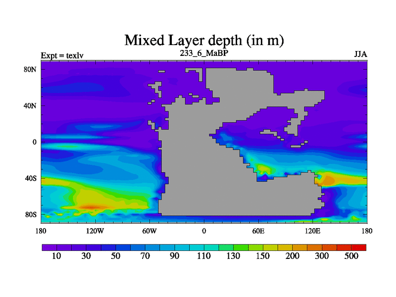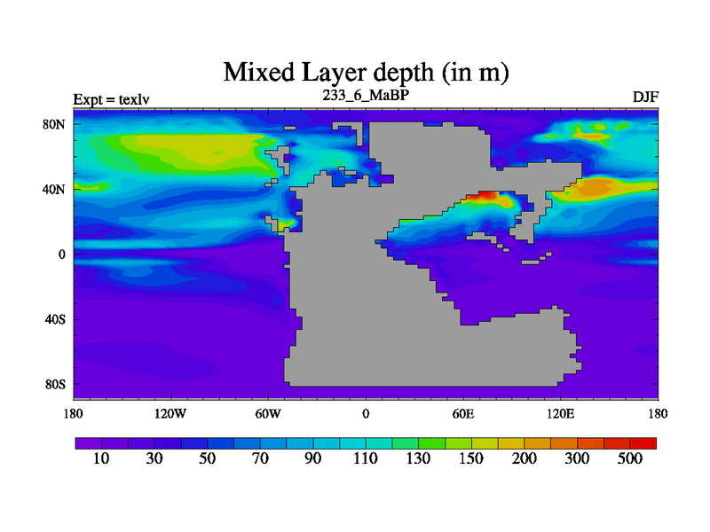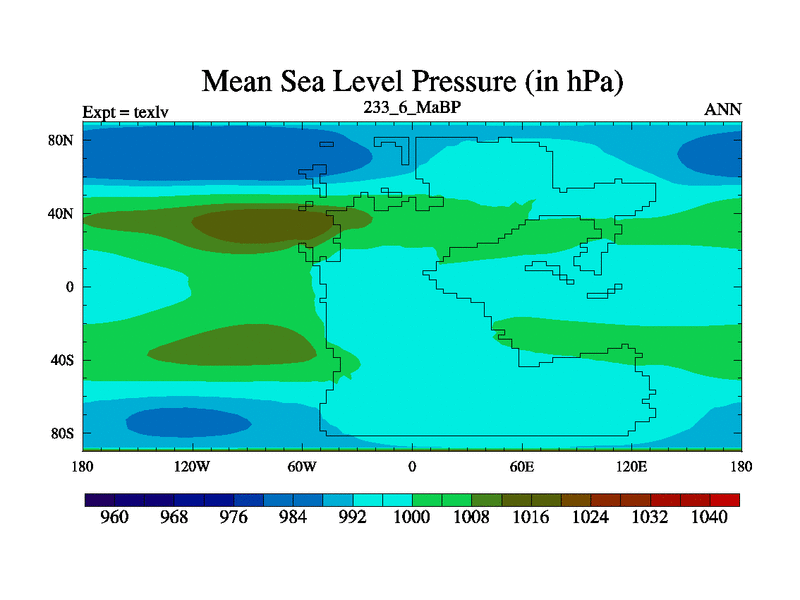 This is the 233.6 Ma simulation using the Scotese palaeogeographies. High output extension of the 5000 year spinup.