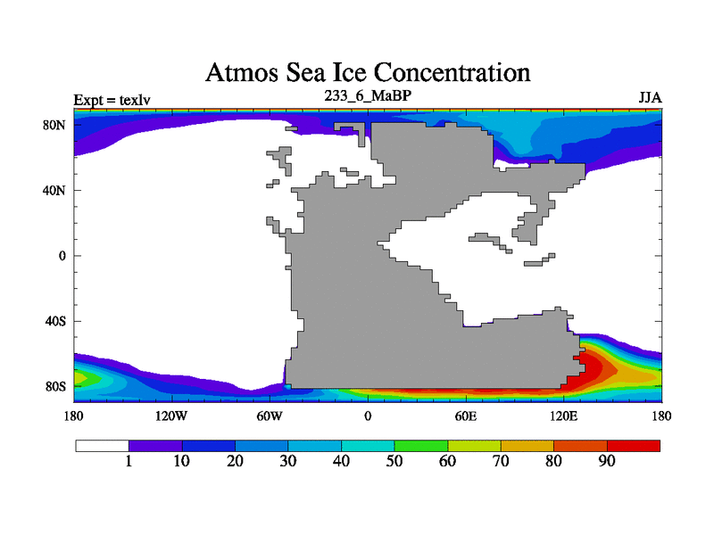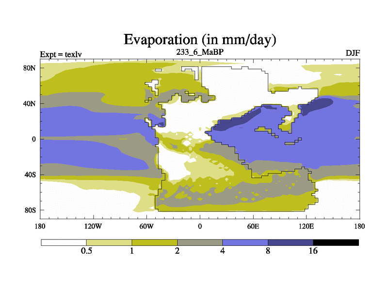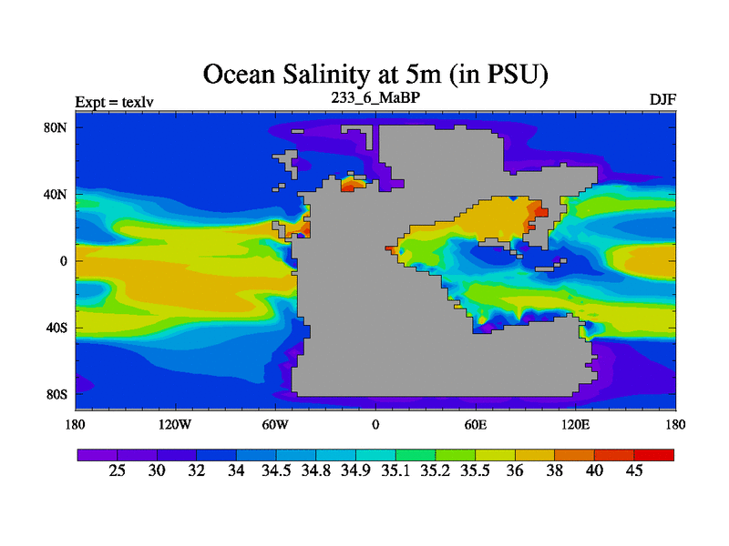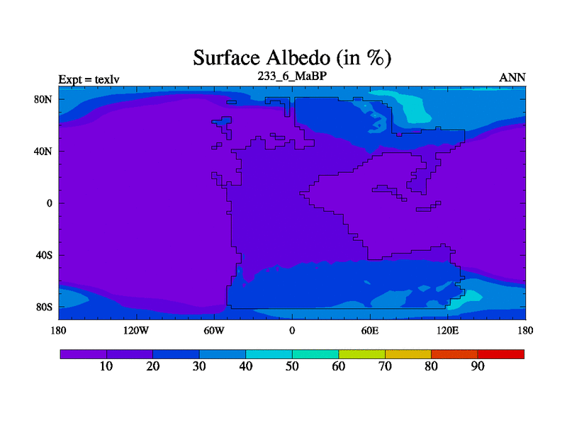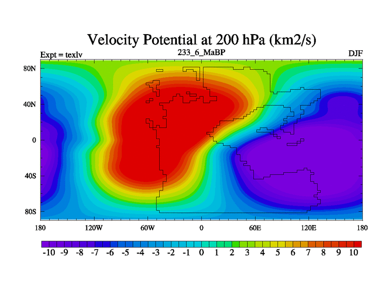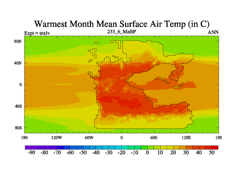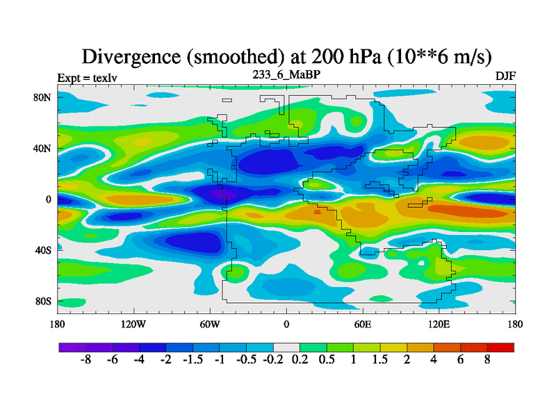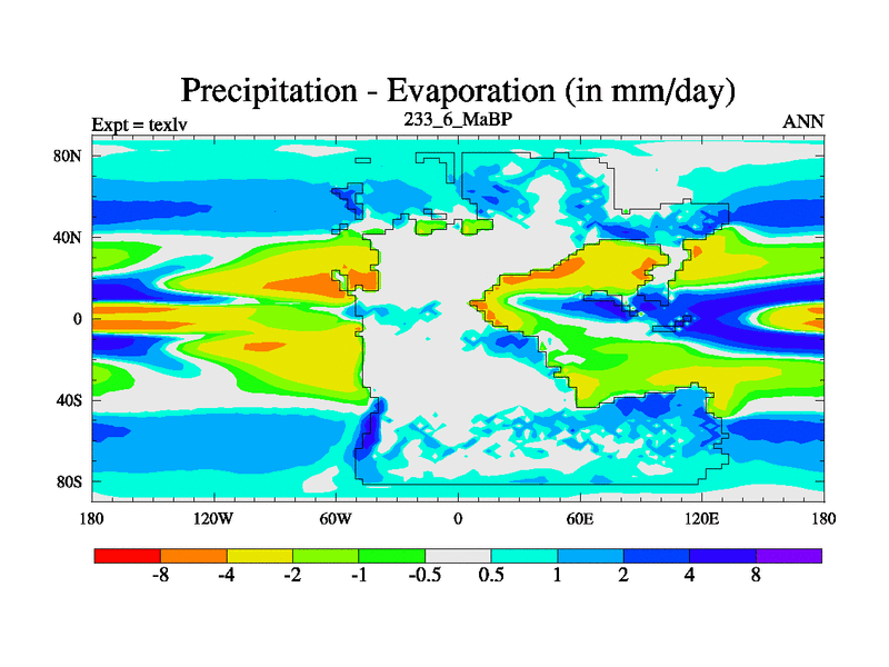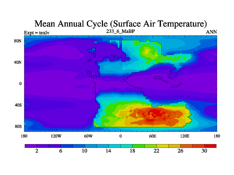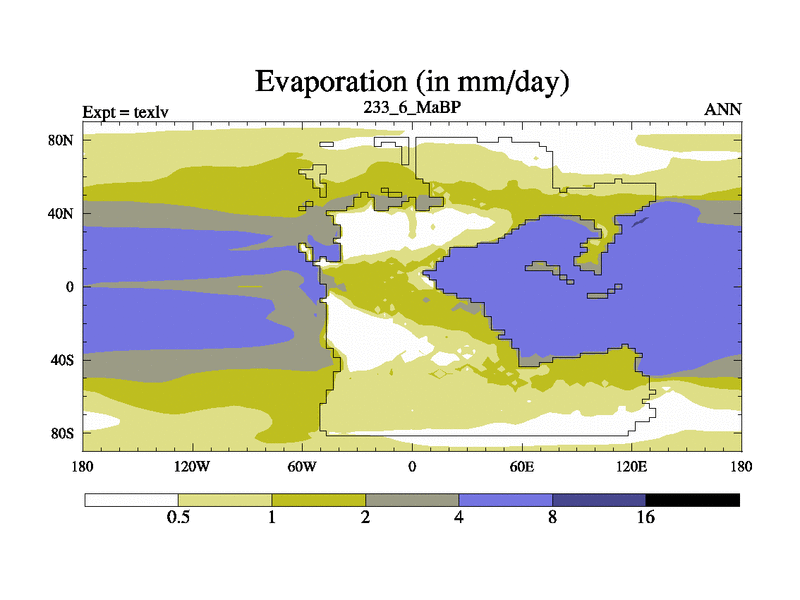 This is the 233.6 Ma simulation using the Scotese palaeogeographies. High output extension of the 5000 year spinup.