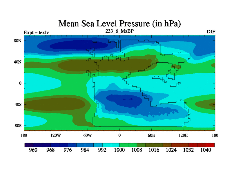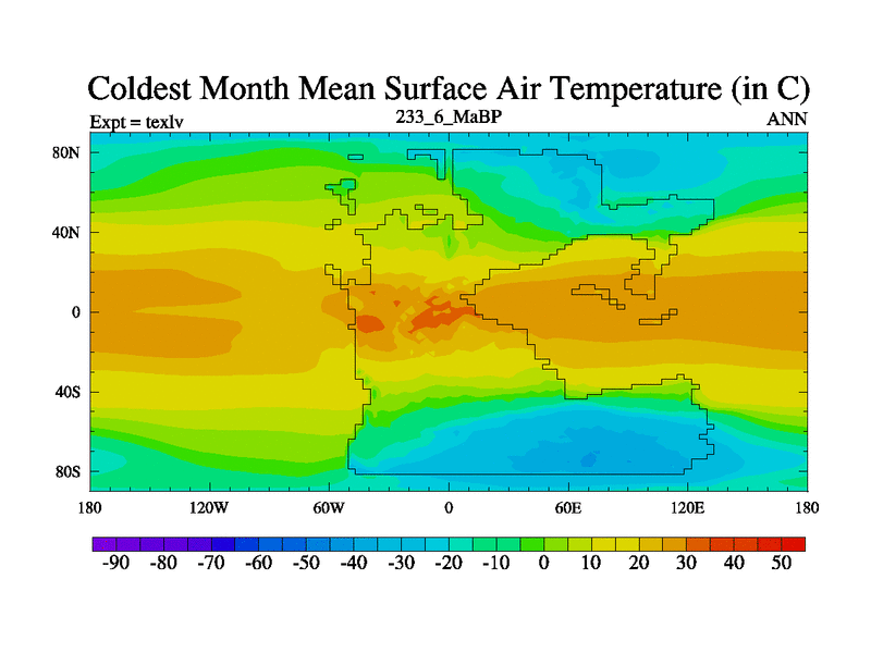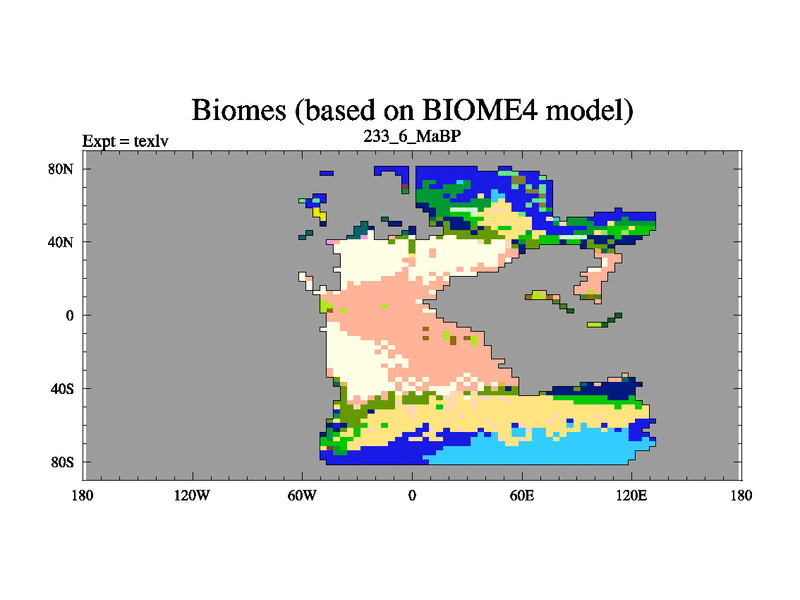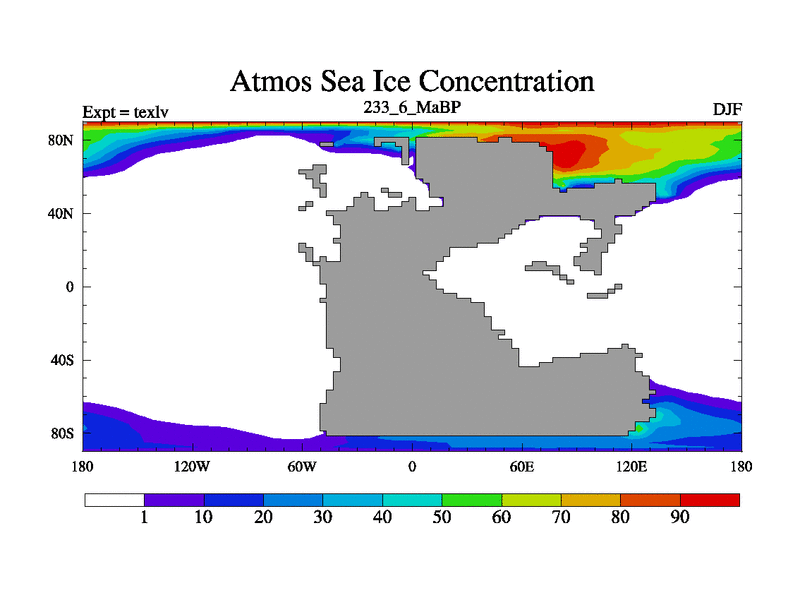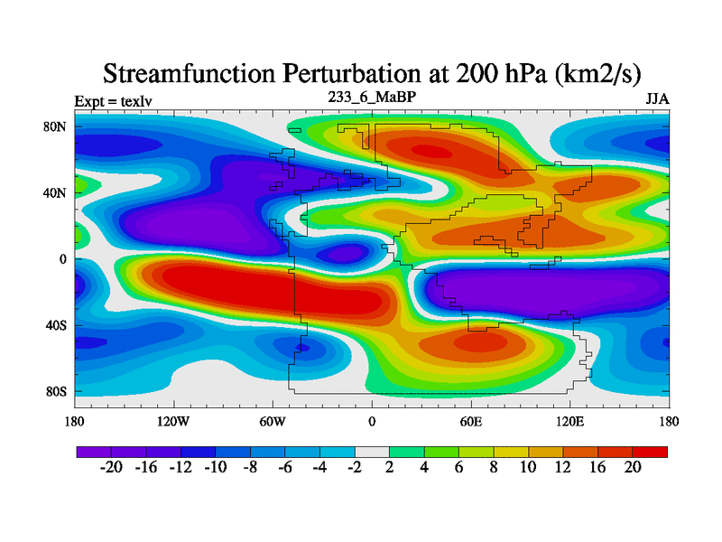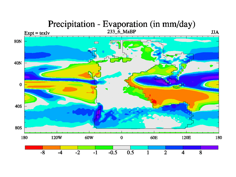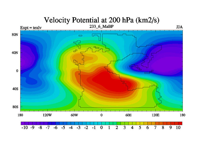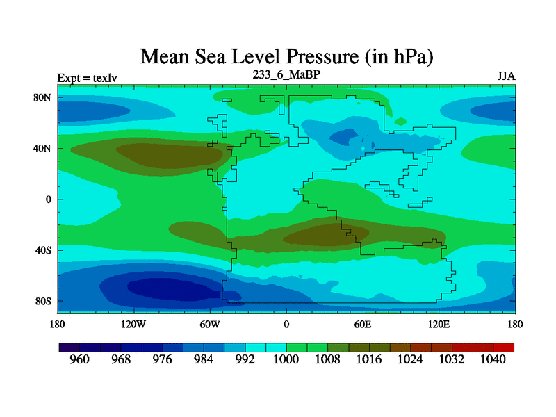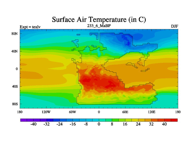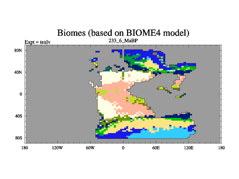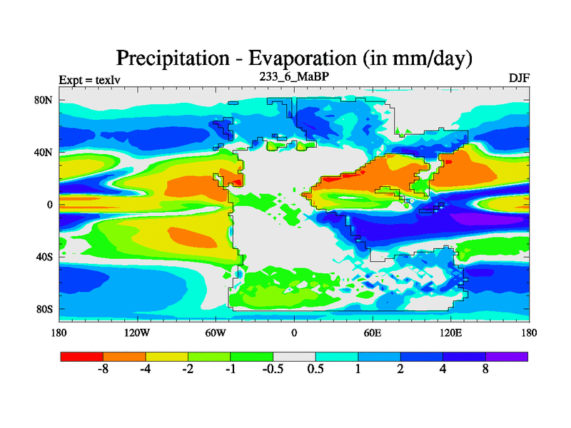 This is the 233.6 Ma simulation using the Scotese palaeogeographies. High output extension of the 5000 year spinup.