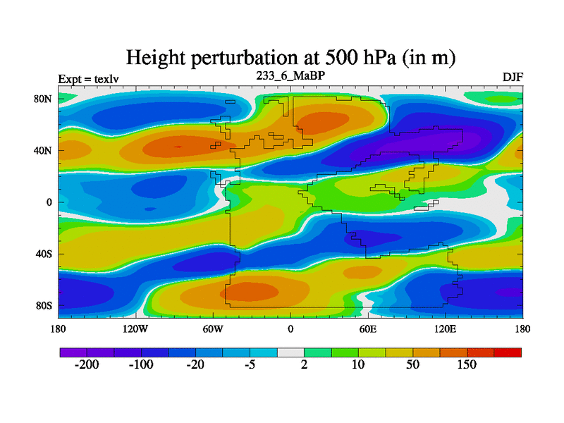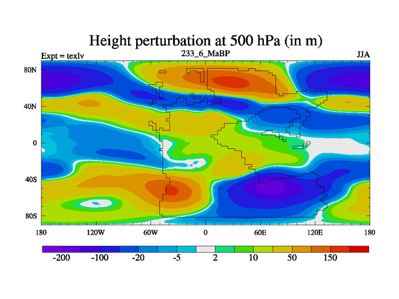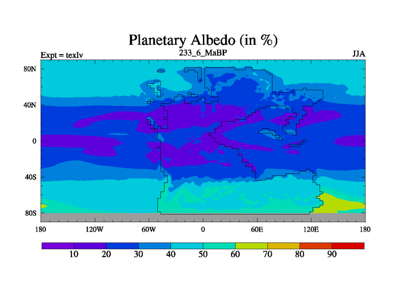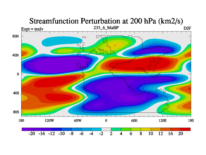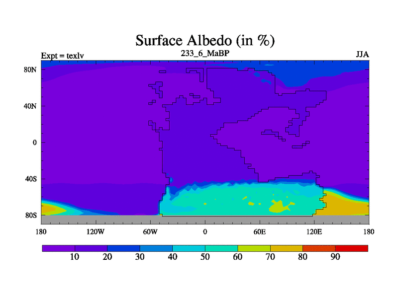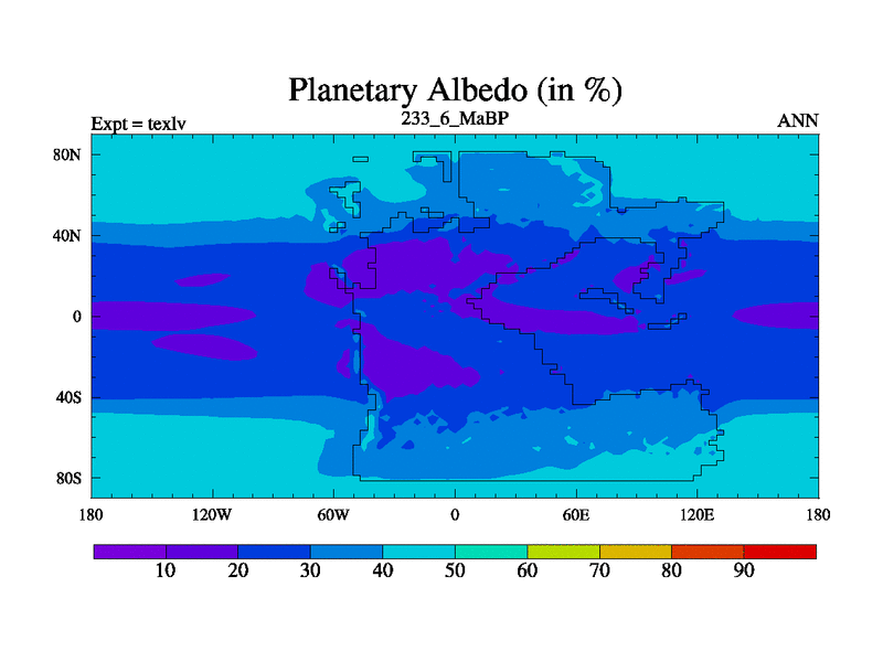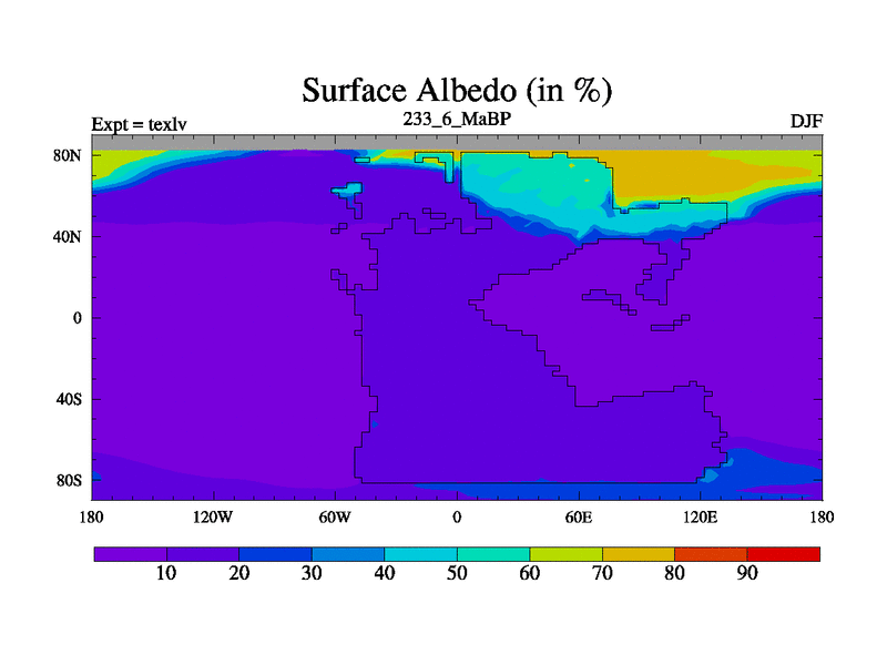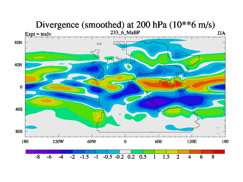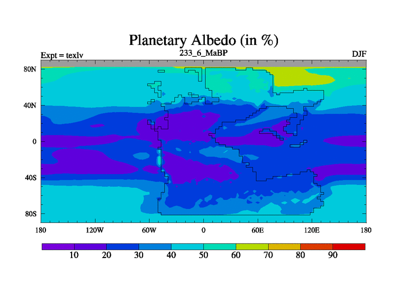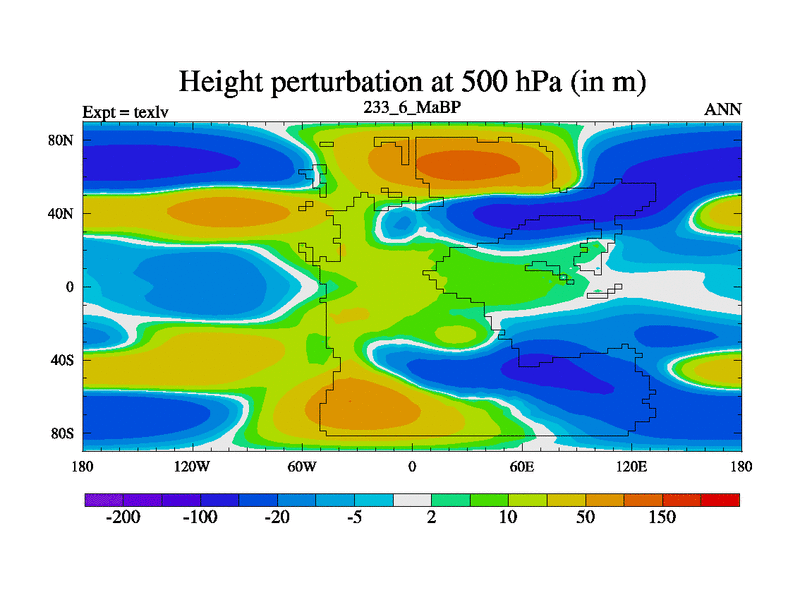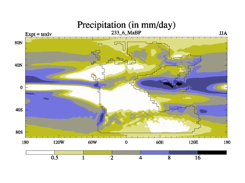 This is the 233.6 Ma simulation using the Scotese palaeogeographies. High output extension of the 5000 year spinup.