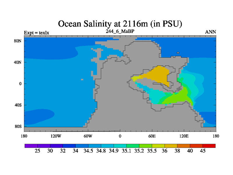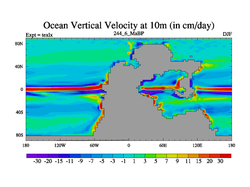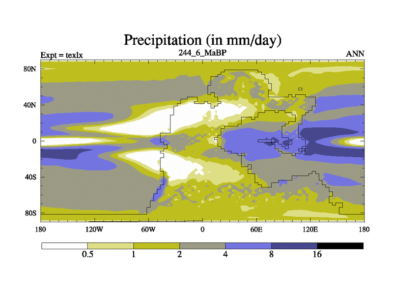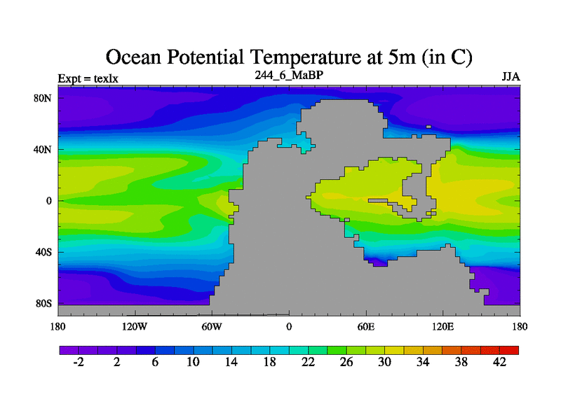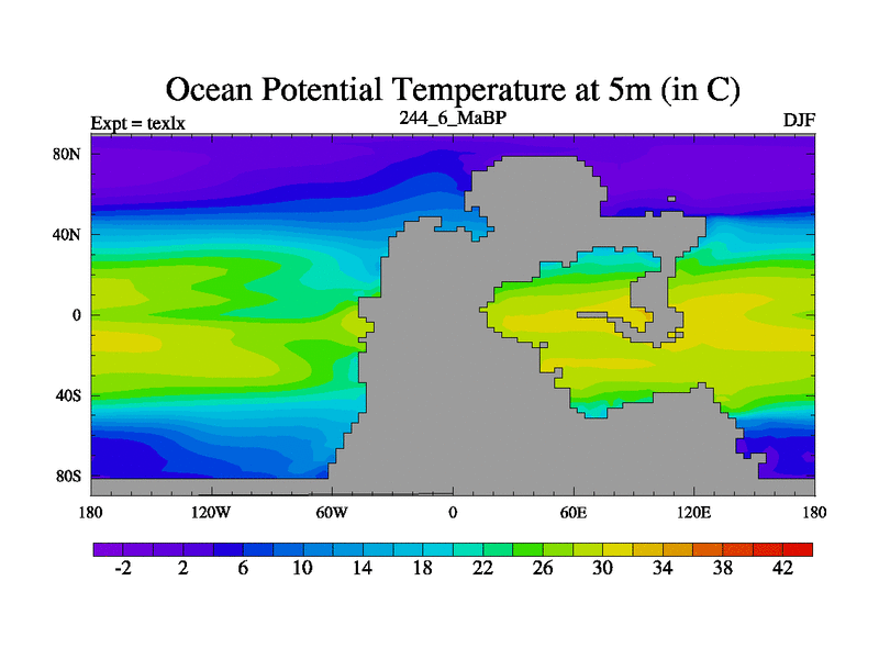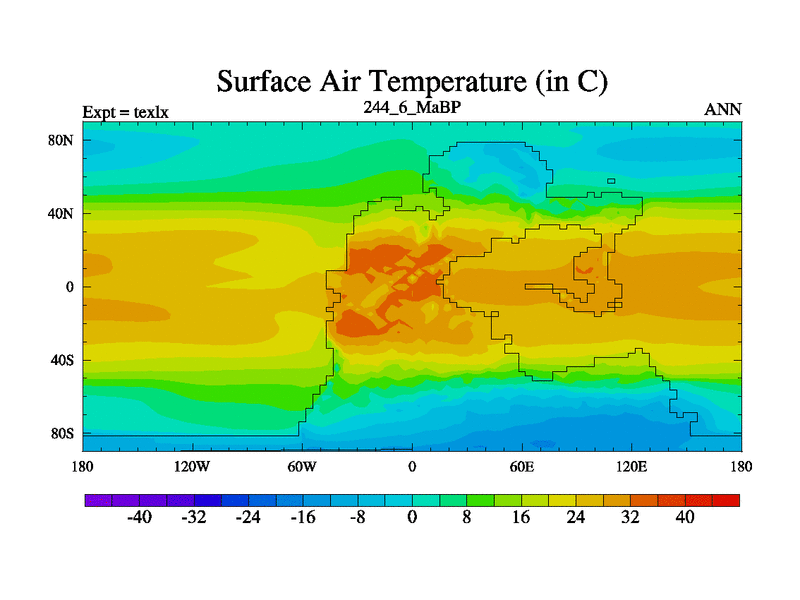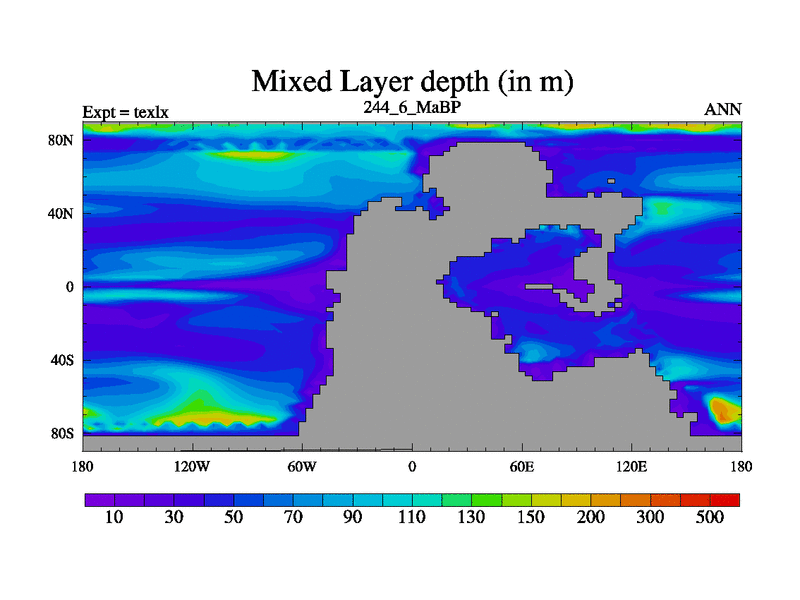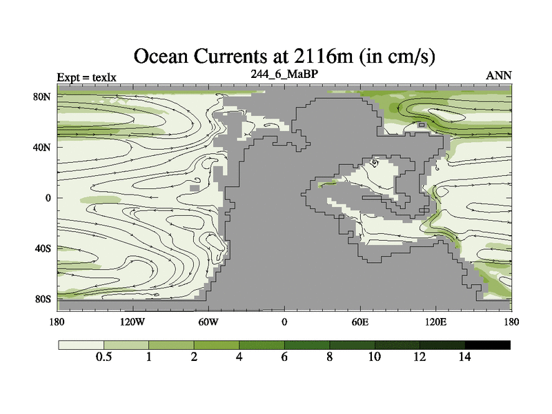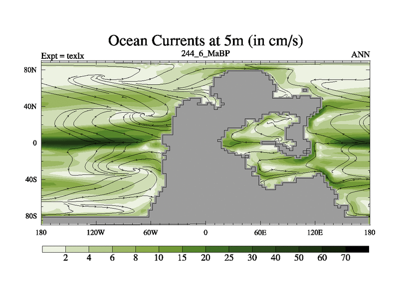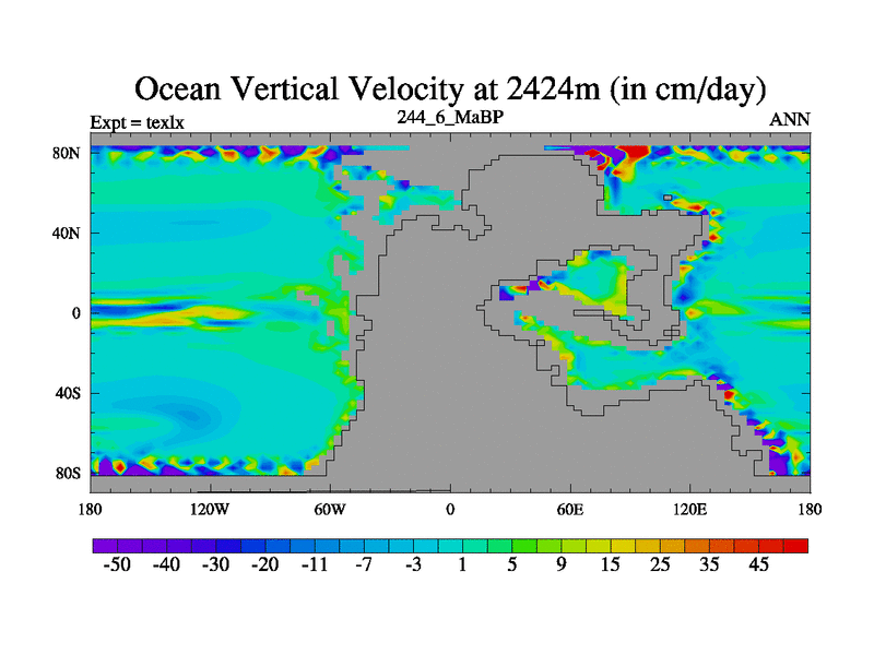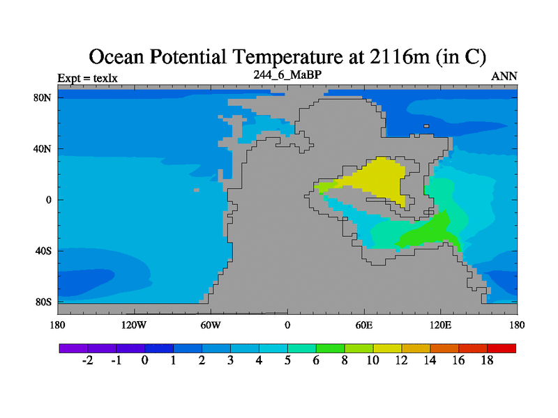 This is the 244.6 Ma simulation using the Scotese palaeogeographies. High output extension of the 5000 year spinup.