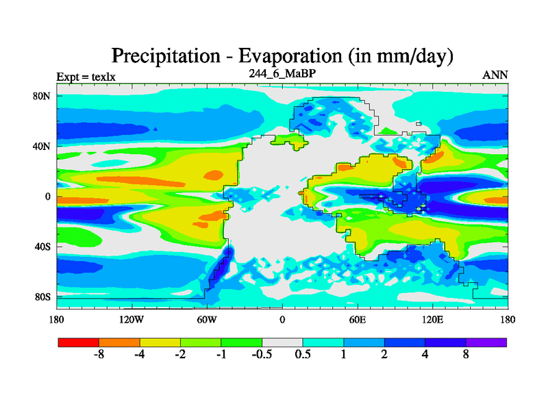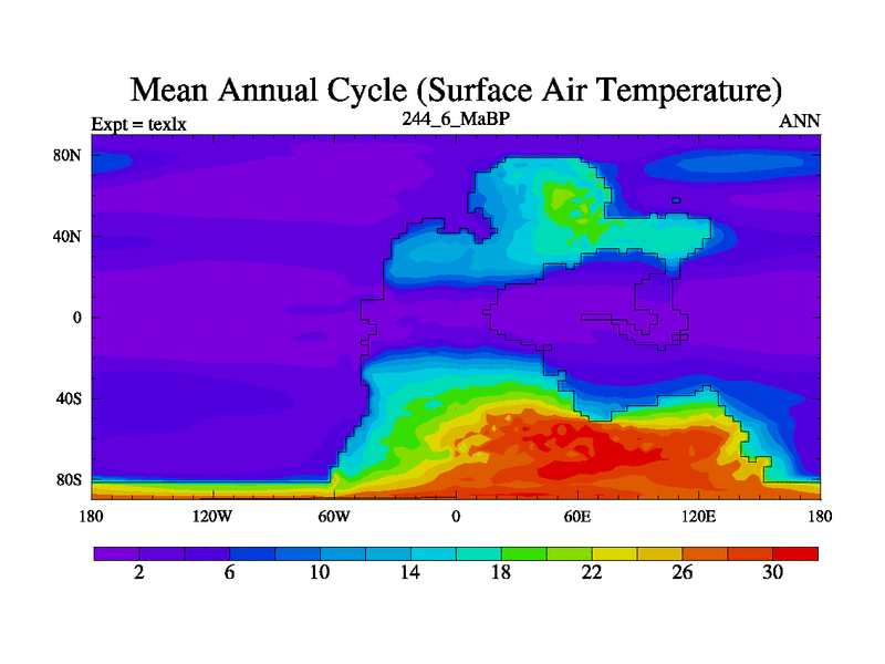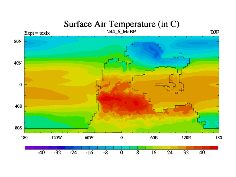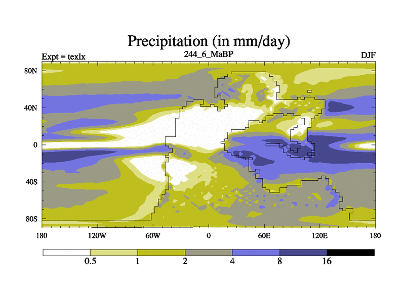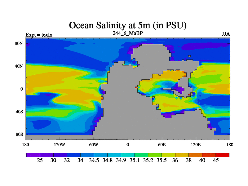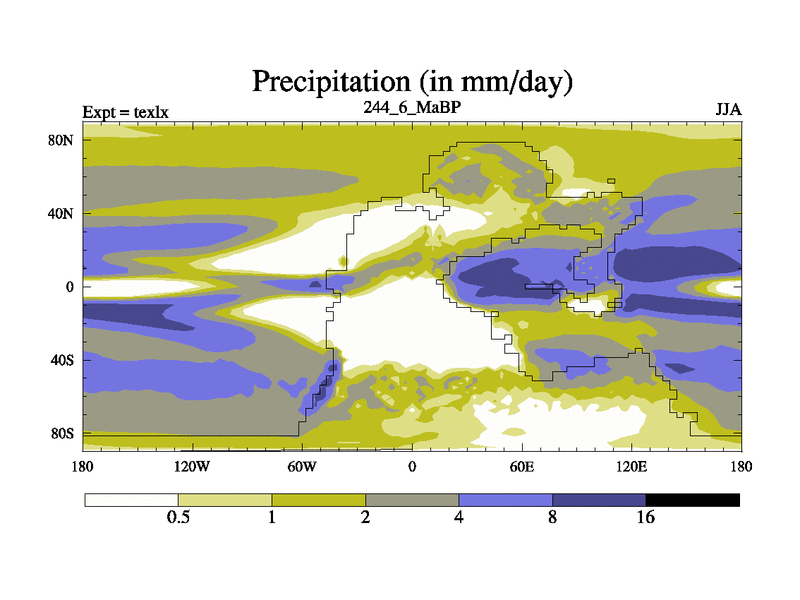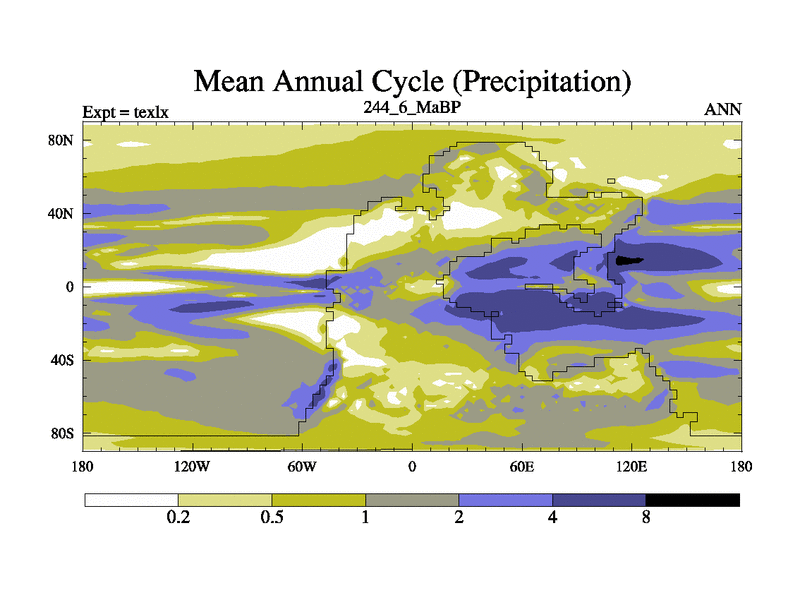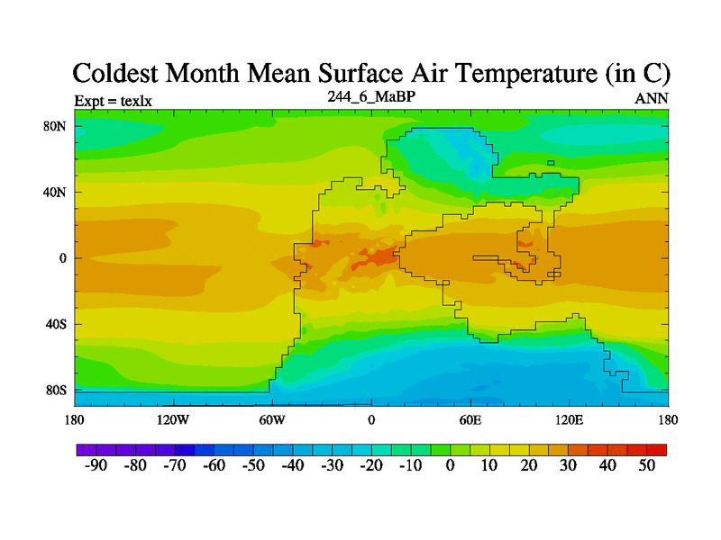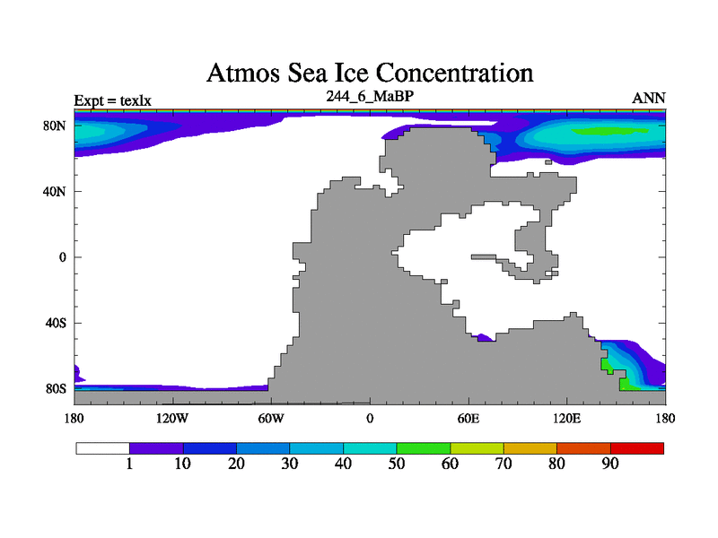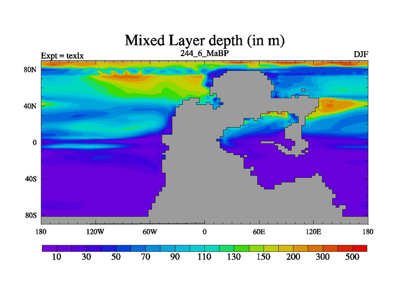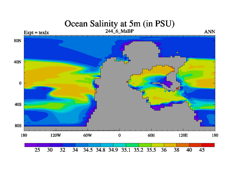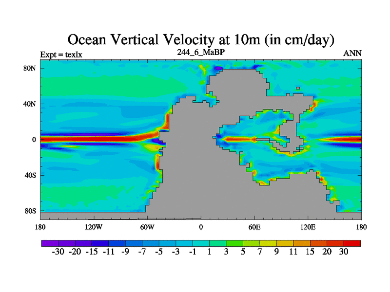 This is the 244.6 Ma simulation using the Scotese palaeogeographies. High output extension of the 5000 year spinup.