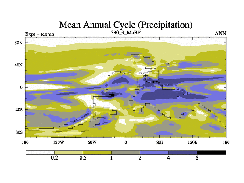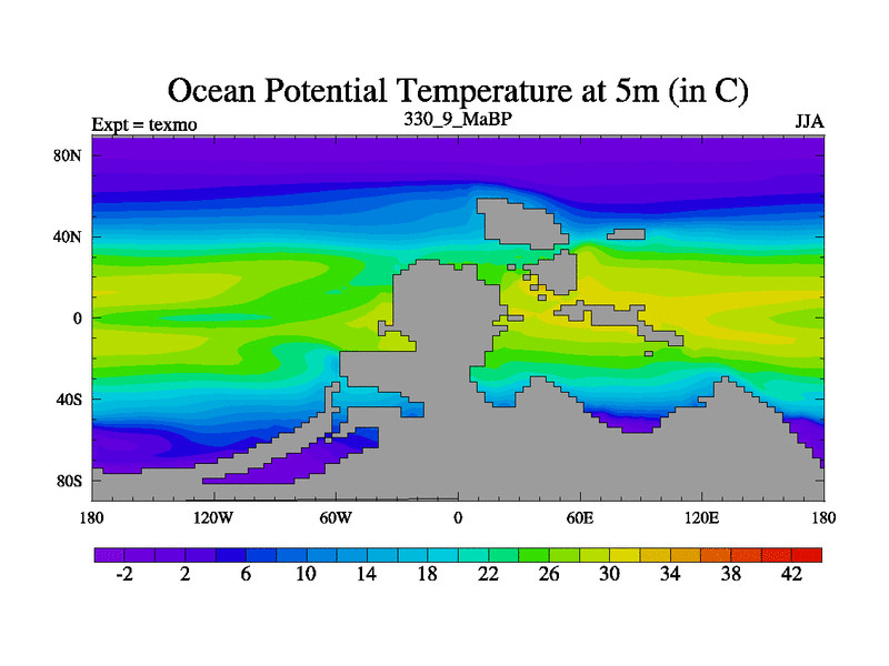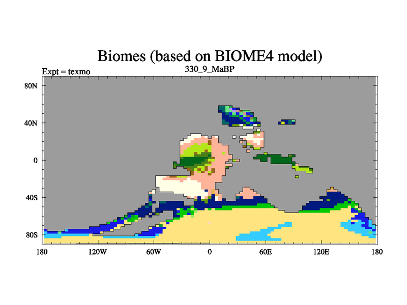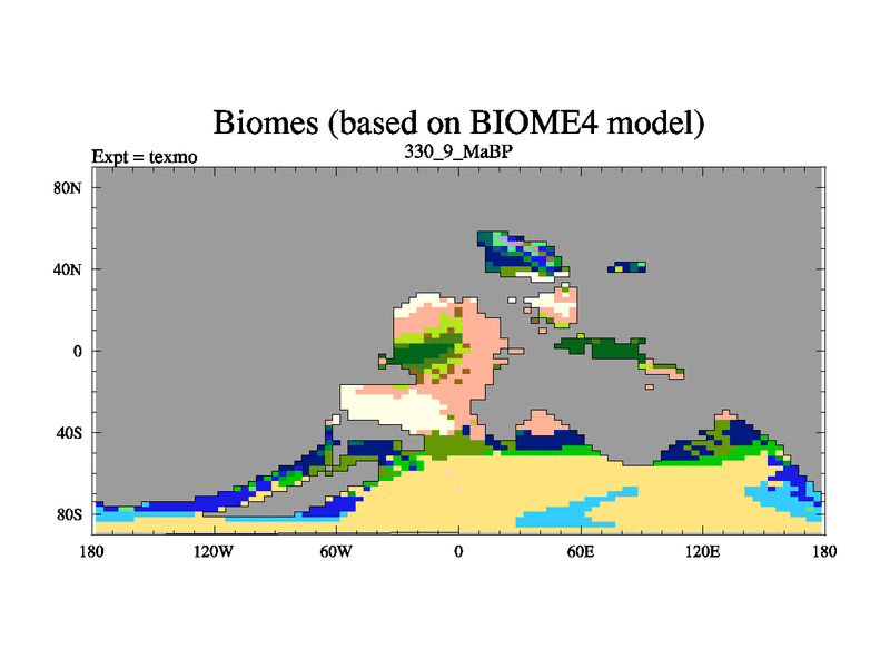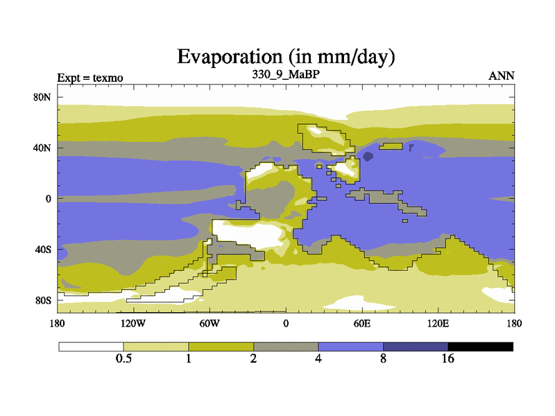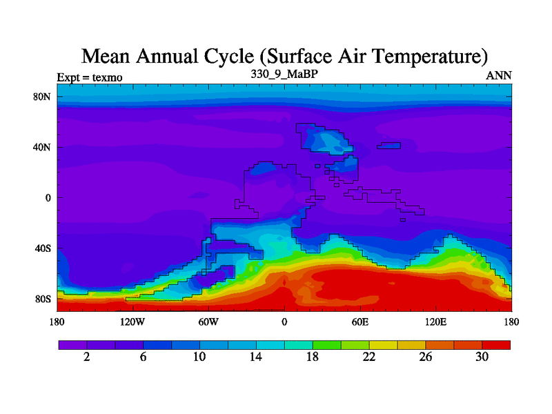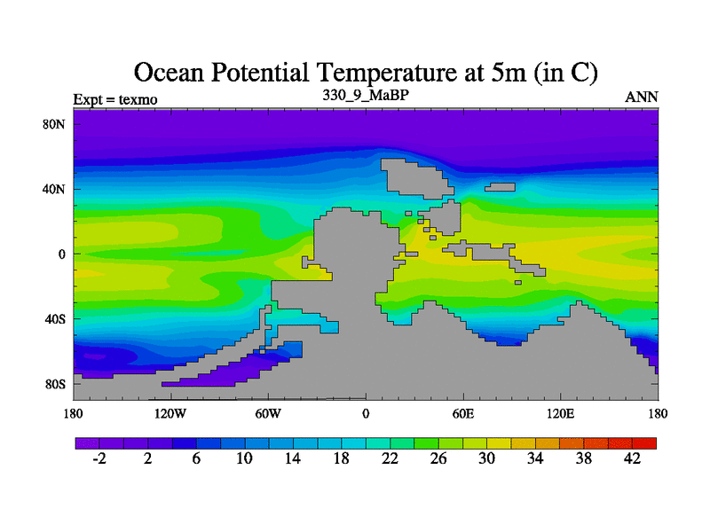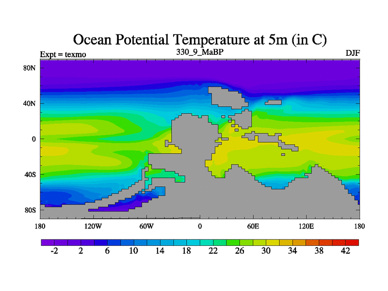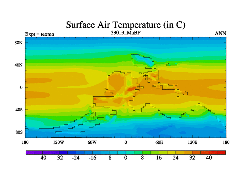 This is the 330.9 Ma simulation using the Scotese palaeogeographies. High output extension of the 5000 year spinup.